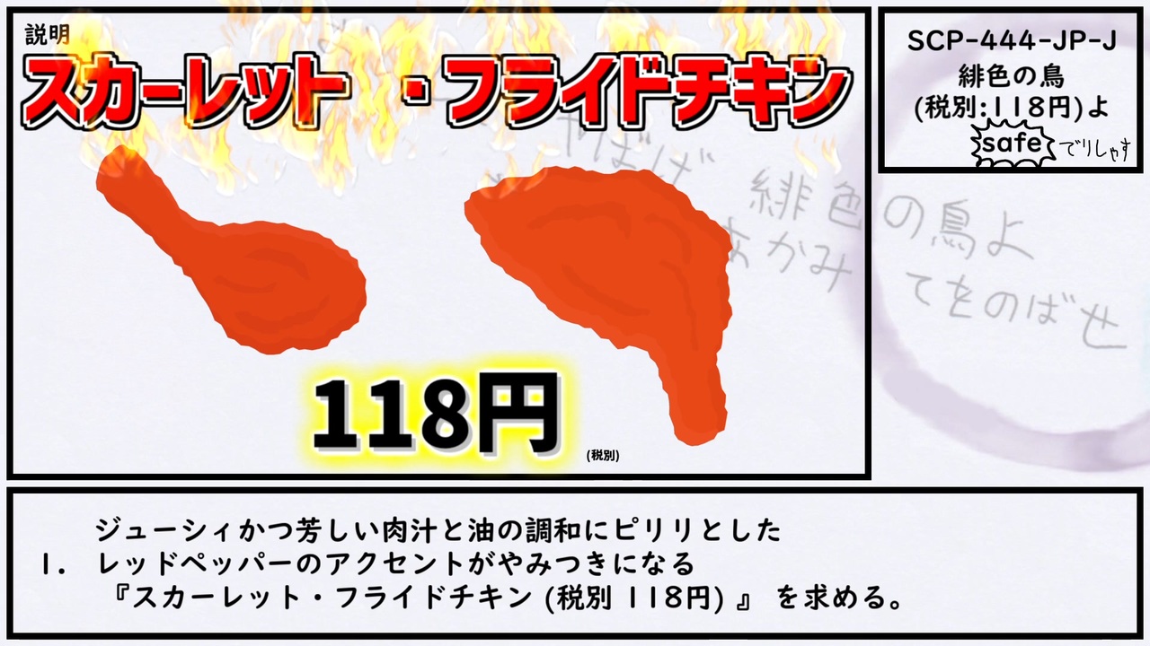 <span style="color: #b45f06;">おいしさ やばげ 緋色の鳥よ あぶらみ あかみ てをのばせ</span><br><br>本家記事 <a href="http://scp-jp.wikidot.com/scp-444-jp-j" target="_blank" rel="noopener nofollow">http://scp-jp.wikidot.com/scp-444-jp-j</a><br>作者 locker<br>SCP財団 <a href="http://scp-jp.wikidot.com" target="_blank" rel="noopener nofollow">http://scp-jp.wikidot.com</a><br>過去の動画はこちら <a href="https://www.nicovideo.jp/mylist/67620202" target="_blank" rel="noopener">mylist/67620202</a><br>CC-BY-SA 3.0
