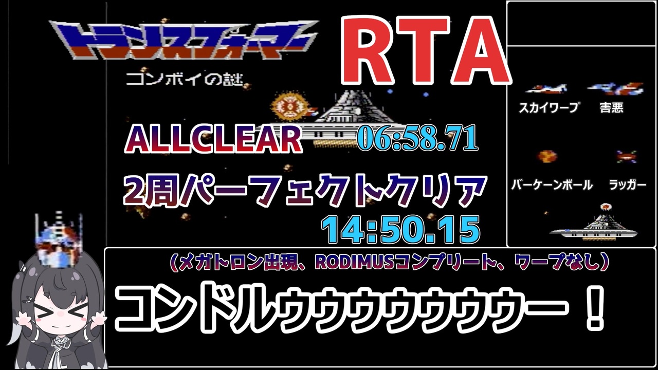 コンドルは害悪。これだけははっきりと真実を伝えたかった。<br>という冗談はさておき、コンボイの謎の開発に携わった方がこのゲームの話をすると嫌な顔をした、というような話をどこかで聞きましたが、これだけは言いたいです。「あなたの作ったゲームは今でも毎日遊んでも飽きないくらい楽しいゲームです」と。<br><br>カテゴリ:1周目RODIMUSコンプリート、メガトロン出現、ワープなし。<br> 2周目ワープなし。<br>連射機なし。<br><br>無編集動画:<a href="https://www.youtube.com/watch?v=t3w2I6l-fIQ" target="_blank" rel="noopener nofollow">https://www.youtube.com/watch?v=t3w2I6l-fIQ</a><br> <br>完全攻略動画:<a href="https://www.nicovideo.jp/watch/sm41549759" class="watch">sm41549759</a><br><br>怪現象集:<a href="https://www.nicovideo.jp/watch/sm41545650" class="watch">sm41545650</a><br><br>ボイスはCoeFontミリアルさんとアリアルさんを使用させて頂きました。<br>Voiced by <a href="https://CoeFont.cloud" target="_blank" rel="noopener nofollow">https://CoeFont.cloud</a><br><br>立ち絵:梓音しのん様<br>ちんまいアリミリ姉妹立ち絵<br><a href="https://seiga.nicovideo.jp/seiga/im11025058" target="_blank" rel="noopener nofollow">https://seiga.nicovideo.jp/seiga/im11025058</a>