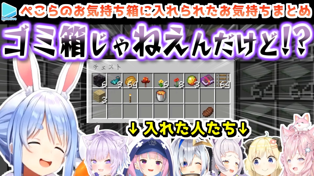 ぺこーらがこの以前に一旦お気持ちを回収している(3月中旬頃)のでねねち等が入れた物はこのまとめに含まれてません<br><br>元動画様はこちら<br>【Minecraft】新計画始動!!!!!!!!!!!!!!!!!!!!!!!!!!!!!!!!!ぺこ!【ホロライブ/兎田ぺこら】<br><a href="https://youtu.be/mH5fg_vOhxs" target="_blank" rel="noopener nofollow">https://youtu.be/mH5fg_vOhxs</a><br><br>【Minecraft】NEOかなた城建設!!!!!!!!【天音かなた/ホロライブ】2023/03/23<br><a href="https://youtu.be/nWCFasQWG3k" target="_blank" rel="noopener nofollow">https://youtu.be/nWCFasQWG3k</a><br><br>【Minecraft】まったりおしゃ倉庫に水槽つくるよ~~~!【角巻わため/ホロライブ4期生】2023/03/24<br><a href="https://youtu.be/8AJ9nNL-3gw" target="_blank" rel="noopener nofollow">https://youtu.be/8AJ9nNL-3gw</a><br><br>【Minecraft】今日も今日とてマイクラだ~~!!【ホロライブ/紫咲シオン】2023/03/27<br><a href="https://youtu.be/DvI5q3p-XLg" target="_blank" rel="noopener nofollow">https://youtu.be/DvI5q3p-XLg</a><br><br>【Minecraft】燃やしてぺこらタワーは生まれ変わるぞい!!!!!!!!!ぺこ!【ホロライブ/兎田ぺこら】2023/03/27<br><a href="https://youtu.be/RvcATZr59jM" target="_blank" rel="noopener nofollow">https://youtu.be/RvcATZr59jM</a><br><br>【 Minecraft 】1時間で2つの秘密のプレゼントを作る!!【鷹嶺ルイ/ホロライブ】2023/03/28<br><a href="https://youtu.be/KD6Re3fYgSU" target="_blank" rel="noopener nofollow">https://youtu.be/KD6Re3fYgSU</a><br><br>【Minecraft】地 下 帝 国 拡 大【湊あくあ/ホロライブ】2023/03/30<br><a href="https://youtu.be/Sdx8kCr9DvQ" target="_blank" rel="noopener nofollow">https://youtu.be/Sdx8kCr9DvQ</a><br><br>【Minecraft】 は じ め て の 自 宅 作 り ! おにぎりハウス【猫又おかゆ/ホロライブ】2023/03/30<br><a href="https://youtu.be/lU1SDL4zLm0" target="_blank" rel="noopener nofollow">https://youtu.be/lU1SDL4zLm0</a><br><br>【Minecraft】まったり日曜マイクラ!ホロ鯖いろんなものできすぎ~!?探検っ【博衣こより/ホロライブ】2023/04/02<br><a href="https://youtu.be/W1gxtNjTeRY" target="_blank" rel="noopener nofollow">https://youtu.be/W1gxtNjTeRY</a><br /><span style="color: #b7b7b7; font-size: 10px;">ホロライブ切り抜き/なめたけ <a href="https://t.co/CBwJLnYR2c" target="_blank" rel="noopener nofollow">https://t.co/CBwJLnYR2c</a></span>