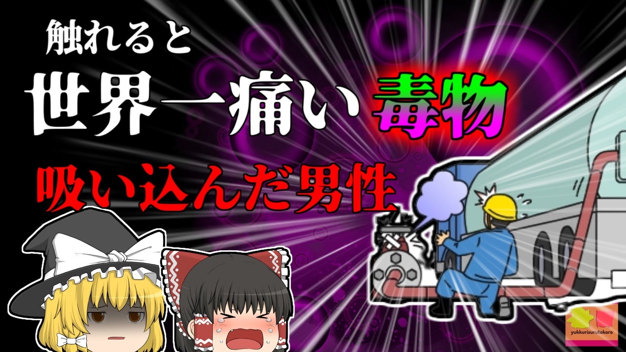 <a href="#" class="seekTime" data-seekTime="00:00" onclick="seekNicoPlayer('#00:00'); return false;">#00:00</a> 冒頭挨拶<br><a href="#" class="seekTime" data-seekTime="00:26" onclick="seekNicoPlayer('#00:26'); return false;">#00:26</a> 視聴上の注意<br><a href="#" class="seekTime" data-seekTime="1:08" onclick="seekNicoPlayer('#1:08'); return false;">#1:08</a> 本編開始<br><a href="#" class="seekTime" data-seekTime="1:45" onclick="seekNicoPlayer('#1:45'); return false;">#1:45</a> フッ化水素酸を運ぶ車<br><a href="#" class="seekTime" data-seekTime="2:45" onclick="seekNicoPlayer('#2:45'); return false;">#2:45</a> 補給作業を行っていた男性「Aさん」と「Bさん」<br><a href="#" class="seekTime" data-seekTime="3:49" onclick="seekNicoPlayer('#3:49'); return false;">#3:49</a> 移送作業後補給していたが…<br><a href="#" class="seekTime" data-seekTime="5:33" onclick="seekNicoPlayer('#5:33'); return false;">#5:33</a> 原因とその背景<br><a href="#" class="seekTime" data-seekTime="5:54" onclick="seekNicoPlayer('#5:54'); return false;">#5:54</a> フッ酸の有毒性<br><a href="#" class="seekTime" data-seekTime="6:48" onclick="seekNicoPlayer('#6:48'); return false;">#6:48</a> 必要だった対策<br><br><br>今回紹介するのは、以前リクエストがあった、「運送業」に関する事例です。<br>関東平野某所の都市には、とあるガラス工場がありました。<br>この工場は、窓ガラスをはじめとした、様々なガラス製品の製造、加工を行っている工場でした。<br>隣県の運送業者に勤める男性「Aさん」「Bさん」の二人はこの日、このガラス工場へ、ガラス加工に使用する「フッ酸」をトラックで運ぶという仕事を請け負っていました。<br>施設内建設された、フッ酸貯槽で作業を行っていた二人でしたが、その最中に突然フッ酸が噴出し、Bさんがこれを吸入してしまい、意識を失ってしまいました。<br>Aさんが直ちに現場周囲にホースで水をかけ、Bさんを救出。<br>その後到着した救急車によって、二人は近くの病院に搬送されて行きました。<br>不幸中の幸いで、二人は呼吸器に化学熱傷を負った者の、命に別状はありませんでした。<br>フッ酸は、皮膚に係ると化学熱傷を負い、それが内部へと侵入すると、体内のカルシウムイオンと反応し、どんどん体のカルシウムを奪っていってしまい、最悪の場合は急性カルシウム血症など、致命的な全身障害を発症し、命にかかわることも少なくない、非常に危険な毒物でした。<br><br>引用・出展・参考文献<br>フッ化水素酸 - Wikipedia<br><a href="https://ishort.ink/m6uU" target="_blank" rel="noopener nofollow">https://ishort.ink/m6uU</a><br>全日本トラック協会 危険物輸送の基本<br><a href="https://ishort.ink/gQe4" target="_blank" rel="noopener nofollow">https://ishort.ink/gQe4</a><br>日本作業環境測定協会 作業主任者技能講習<br><a href="https://ishort.ink/1tzR" target="_blank" rel="noopener nofollow">https://ishort.ink/1tzR</a><br>職場のあんぜんサイト 厚生労働省<br><a href="https://ishort.ink/GQnH" target="_blank" rel="noopener nofollow">https://ishort.ink/GQnH</a><br><a href="https://ishort.ink/RRtv" target="_blank" rel="noopener nofollow">https://ishort.ink/RRtv</a><br>フッ酸によるガラスの表面処理 <br><a href="https://ishort.ink/iBG9" target="_blank" rel="noopener nofollow">https://ishort.ink/iBG9</a><br>国立研究開発法人 科学技術振興機構<br><a href="https://ishort.ink/iBG9" target="_blank" rel="noopener nofollow">https://ishort.ink/iBG9</a><br>ガラスの精密加工 | 武蔵野ファインガラス株式会社<br><a href="https://ishort.ink/RqvF" target="_blank" rel="noopener nofollow">https://ishort.ink/RqvF</a><br><br><br><br />※この動画は過去の事件を知り、現在でも同じことが発生する危険性を再認識、関与しないように促すための動画であり、視聴者を扇動、動揺を誘うためのコンテンツではありません。<br><br>ご要望にお応えして、メンバーシップの開設を行いました。<br>下記URLからも登録可能ですので、ご興味がある方は是非ご参加ください。<br><a href="https://www.youtube.com/channel/UCcT5a1J7XJW7CLYI2RKl4pw/join" target="_blank" rel="noopener nofollow">https://www.youtube.com/channel/UCcT5a1J7XJW7CLYI2RKl4pw/join</a><br><br><br>Twitter<br>→<a href="https://twitter.com/yukkurisurutoko" target="_blank" rel="noopener nofollow">https://twitter.com/yukkurisurutoko</a><br><br>取り急ぎ、簡易的にですがマイリストを作りました。<br>【ゆっくり解説】事故・事件関係紹介リスト <br><a href="https://www.nicovideo.jp/mylist/71034319" target="_blank" rel="noopener nofollow">https://www.nicovideo.jp/mylist/71034319</a><br>【ゆっくり解説】放射線系事故<br><a href="https://www.nicovideo.jp/mylist/71034368" target="_blank" rel="noopener nofollow">https://www.nicovideo.jp/mylist/71034368</a><br>【ゆっくり解説】鉄道系事故・事件関連<br><a href="https://www.nicovideo.jp/mylist/71034379" target="_blank" rel="noopener nofollow">https://www.nicovideo.jp/mylist/71034379</a>