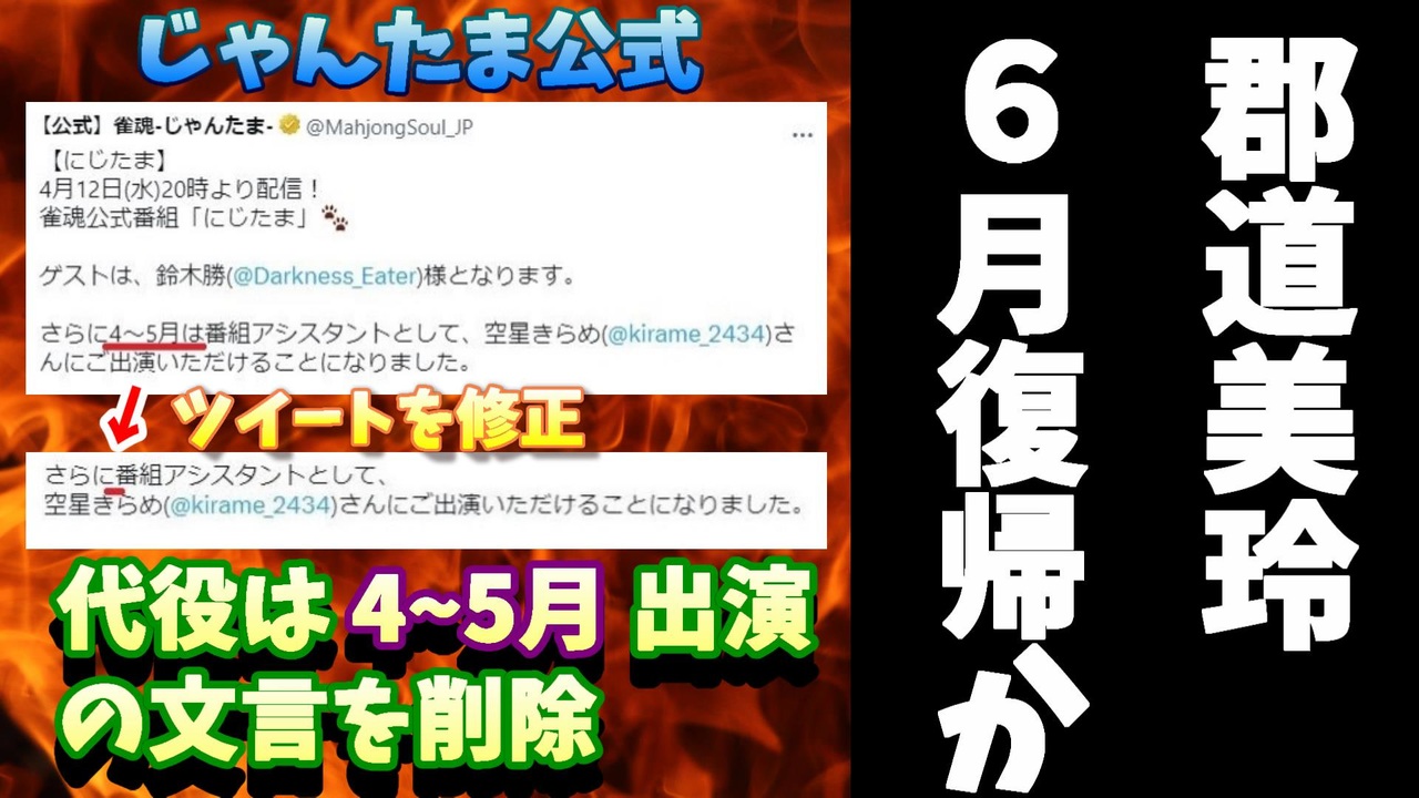 2023年4月3日午後5時、雀魂-じゃんたま-公式ツイッターより雀魂公式番組「にじたま」に『4~5月』の間空星きらめさんが出演することに決まったとツイートしたのですが、すぐにツイートを修正し『4~5月』という出演時期の文言を削除しました。<br><br>サムネイルと背景はAIイメージもしくはフリー画像です<br><br>引用<br><a href="https://twitter.com/MahjongSoul_JP/status/1643161485961510912" target="_blank" rel="noopener nofollow">https://twitter.com/MahjongSoul_JP/status/1643161485961510912</a><br><br>Youtube <a href="https://www.youtube.com/@V_Virgin_Mary" target="_blank" rel="noopener nofollow">https://www.youtube.com/@V_Virgin_Mary</a><br>twitter <a href="https://twitter.com/V_Virgin_Mary" target="_blank" rel="noopener nofollow">https://twitter.com/V_Virgin_Mary</a><br><br>使用素材<br>高品質なフリー動画素材 - Pixabay <a href="https://pixabay.com/ja/videos" target="_blank" rel="noopener nofollow">https://pixabay.com/ja/videos</a>