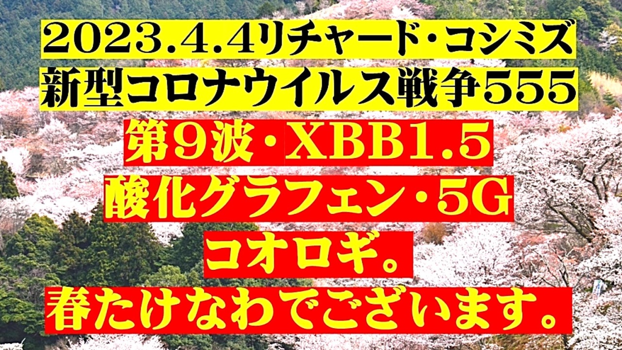 <span style="color: #cc4125;"><strong>「 テーマ : 新型コロナウイルス戦争 555 」</strong></span><br><br><span style="color: #ff0000;"><strong>「『 第9波・XBB1.5・酸化グラフェン・5G・コオロギ 』。『 春たけなわでございます。』」</strong></span><br><br><span style="color: #0000ff;"><strong>「『 イベルメクチン・アビガン・その他コロナ対策 』について、ご意見をお寄せ下さい! 」<br><br> ◐ E-mail:richardkoshimizu@gmail.com</strong></span><br><br><strong>◐「クリエイター・サポート」・「ニコニ広告」・「フォロー」等、ご協力の程宜しくお願い致します。RK</strong><br><br><span style="color: #38761d;"><strong>◐ リチャード・コシミズ 講演会 公式 動画ギャラリー</strong></span><br> <span style="color: #38761d;"><strong><a href="http://www.t-sskk.com/richardkoshimizu/video-gallery/index.html" target="_blank" rel="noopener nofollow">http://www.t-sskk.com/richardkoshimizu/video-gallery/index.html</a><br><br>◐ リチャード・コシミズ 講演会 「 ニコニコ生放送『 LIVE 』」</strong></span><br> <span style="color: #38761d;"><strong><a href="https://bit.ly/3Bx8F5w" target="_blank" rel="noopener nofollow">https://bit.ly/3Bx8F5w</a><br><br>◐ リチャード・コシミズ 公式 ブログ</strong></span><br> <span style="color: #38761d;"><strong><a href="http://08054623210.jugem.jp/" target="_blank" rel="noopener nofollow">http://08054623210.jugem.jp/</a><br><br>◐ リチャード・コシミズ 公式 ホームページ<br> <a href="http://richardkoshimizu.boo.jp/" target="_blank" rel="noopener nofollow">http://richardkoshimizu.boo.jp/</a><br><br>◐ リチャード・コシミズ 公式 Twitter</strong></span><br> <span style="color: #38761d;"><strong><a href="https://twitter.com/rickoshimizu" target="_blank" rel="noopener nofollow">https://twitter.com/rickoshimizu</a><br><br>◐ リチャード・コシミズ オンライン ショップ</strong></span><br> <span style="color: #38761d;"><strong><a href="https://rkonline.shop-pro.jp/" target="_blank" rel="noopener nofollow">https://rkonline.shop-pro.jp/</a></strong></span>