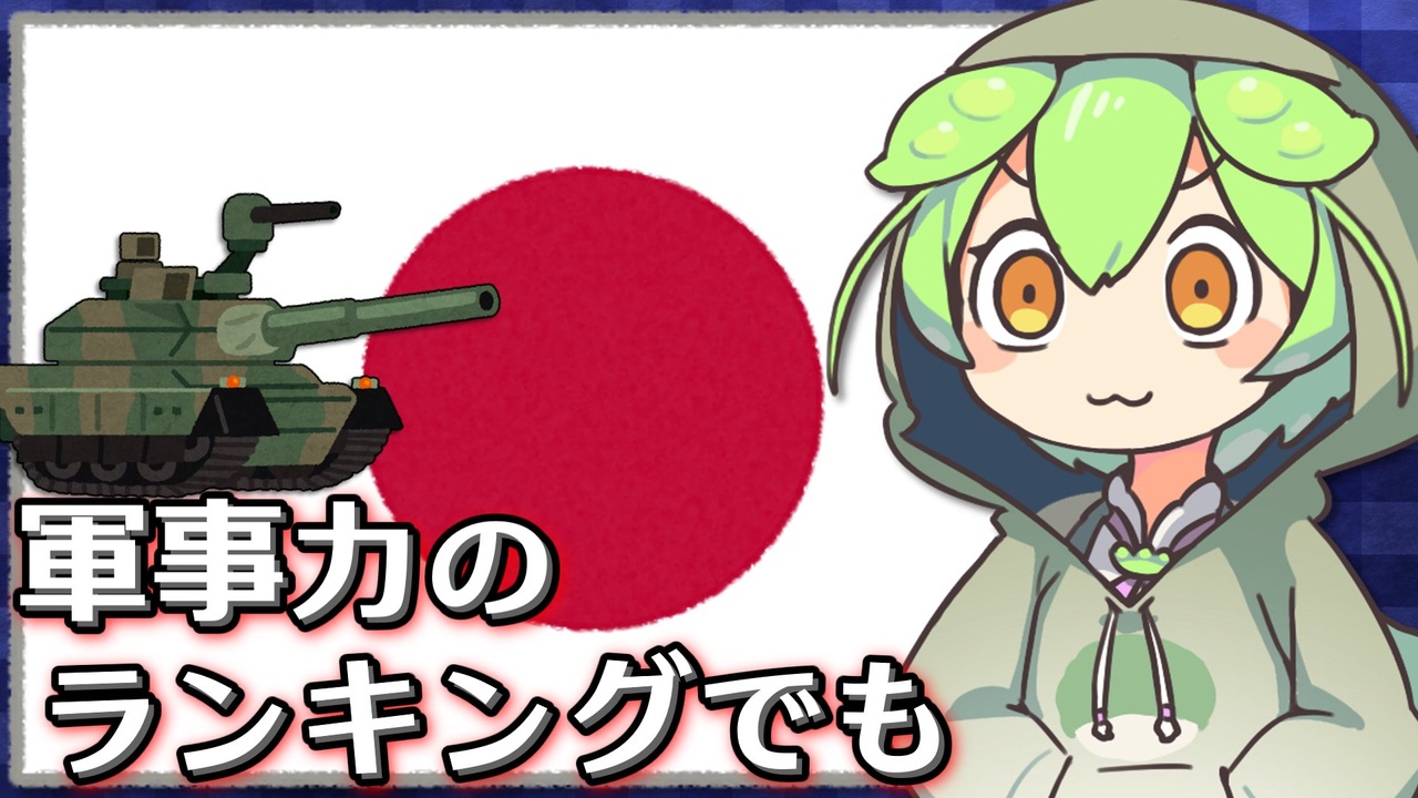 国旗イラストをいらすとやからFrame illustに変更<br><br>前:<a href="https://www.nicovideo.jp/watch/sm42020615" class="watch">sm42020615</a> (フィンランド加盟確定)<br>次:<a href="https://www.nicovideo.jp/watch/sm42070811" class="watch">sm42070811</a> (アルメニア欧米接近)<br>マイリスト:<a href="https://www.nicovideo.jp/mylist/73393608" target="_blank" rel="noopener">mylist/73393608</a><br><br><span style="font-size: 16px;"><strong>グローバル・ファイヤーパワー公式HPのURL(英語)</strong></span><br><a href="https://www.globalfirepower.com/" target="_blank" rel="noopener nofollow">https://www.globalfirepower.com/</a><br><br>使わせていただいているもの(敬称略)<br>VOICEVOX/hiho[ <a href="https://voicevox.hiroshiba.jp/" target="_blank" rel="noopener nofollow">https://voicevox.hiroshiba.jp/</a> ]<br>ずんだもん立ち絵素材/坂本アヒル[<a href="https://seiga.nicovideo.jp/seiga/im10788496" target="_blank" rel="noopener">im10788496</a>]<br>東北きりたん立ち絵素材/坂本アヒル[<a href="https://seiga.nicovideo.jp/seiga/im10849150" target="_blank" rel="noopener">im10849150</a>]<br><br>Youtube版:<a href="https://youtu.be/bMj2OoCQZss" target="_blank" rel="noopener nofollow">https://youtu.be/bMj2OoCQZss</a><br>Twitter:<a href="https://twitter.com/Yuharumuri" target="_blank" rel="noopener nofollow">https://twitter.com/Yuharumuri</a><br><br>[2023/4/5]<br>動画完成してから2023年版既に出てるのに気づいた。<br>2023年版では日本は8位とランクダウンしてます。