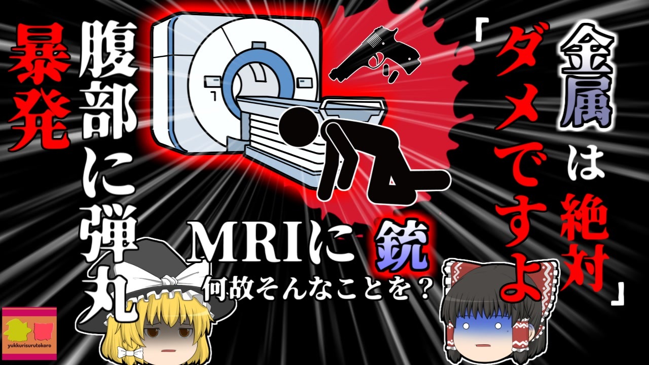 <a href="#" class="seekTime" data-seekTime="00:00" onclick="seekNicoPlayer('#00:00'); return false;">#00:00</a> 冒頭挨拶<br><a href="#" class="seekTime" data-seekTime="00:28" onclick="seekNicoPlayer('#00:28'); return false;">#00:28</a> 冒頭挨拶<br><a href="#" class="seekTime" data-seekTime="1:11" onclick="seekNicoPlayer('#1:11'); return false;">#1:11</a> 本編開始<br><a href="#" class="seekTime" data-seekTime="1:44" onclick="seekNicoPlayer('#1:44'); return false;">#1:44</a> 「MRI」<br><a href="#" class="seekTime" data-seekTime="2:54" onclick="seekNicoPlayer('#2:54'); return false;">#2:54</a> 医師からの説明と注意<br><a href="#" class="seekTime" data-seekTime="3:46" onclick="seekNicoPlayer('#3:46'); return false;">#3:46</a> 同意書にサイン<br><a href="#" class="seekTime" data-seekTime="4:07" onclick="seekNicoPlayer('#4:07'); return false;">#4:07</a> 被災<br><a href="#" class="seekTime" data-seekTime="5:27" onclick="seekNicoPlayer('#5:27'); return false;">#5:27</a> 何故そんなことを?<br><a href="#" class="seekTime" data-seekTime="5:52" onclick="seekNicoPlayer('#5:52'); return false;">#5:52</a> 彼のもう一つの顔<br><a href="#" class="seekTime" data-seekTime="7:18" onclick="seekNicoPlayer('#7:18'); return false;">#7:18</a> 背景<br><a href="#" class="seekTime" data-seekTime="9:06" onclick="seekNicoPlayer('#9:06'); return false;">#9:06</a> MRIの危険と注意点<br><br><br>今回紹介するのは、以前りくえすとがありました、医療機器に関する事例です。<br>南アメリカ、ブラジル某所の病院ではこの日、高齢者女性のMRI検査が行われており、この患者の息子である「Aさん」は、その立ち合いに訪れていました。<br>彼は母親と共に、医師の指導を受け、MRI検査を受ける前の注意事項、説明を聞いた後、同意書にサインをし、検査室に入室。<br>MIR検査が行われようとしたとき、突然室内で「パァン!」という大きな破裂音が鳴り響きました。<br>その直後、Aさんが床に倒れこみ、腹部には真っ赤な血が・・・<br><br>なんと、Aさんは医師に黙って小型の銃を隠しもち、MRI検査室に入室しており、危機の強力な磁力によって、銃が誤動作してしまい、彼の腹部に弾丸が発射されてしまっていました。<br><br>何故、彼は医師による注意を聞かず、そんなものを持ち込んでしまっていたのでしょうか?<br><br>引用・出展・参考文献<br>外務省 海外安全ホームページ<br>ブラジルの危険情報【危険レベル継続】(内容の更新)<br><a href="https://ishort.ink/WELR" target="_blank" rel="noopener nofollow">https://ishort.ink/WELR</a><br>The telegraph<br><a href="https://ishort.ink/vKj1" target="_blank" rel="noopener nofollow">https://ishort.ink/vKj1</a><br>How dangerous are magnetic items near an MRI magnet?<br><a href="https://ishort.ink/SLAJ(Youtube)" target="_blank" rel="noopener nofollow">https://ishort.ink/SLAJ(Youtube)</a><br>INDEPENDENT <br><a href="https://ishort.ink/NRFa" target="_blank" rel="noopener nofollow">https://ishort.ink/NRFa</a><br>その他視聴者提供資料など<br><br><br />※この動画は過去の事件を知り、現在でも同じことが発生する危険性を再認識、関与しないように促すための動画であり、視聴者を扇動、動揺を誘うためのコンテンツではありません。<br><br>ご要望にお応えして、メンバーシップの開設を行いました。<br>下記URLからも登録可能ですので、ご興味がある方は是非ご参加ください。<br><a href="https://www.youtube.com/channel/UCcT5a1J7XJW7CLYI2RKl4pw/join" target="_blank" rel="noopener nofollow">https://www.youtube.com/channel/UCcT5a1J7XJW7CLYI2RKl4pw/join</a><br><br><br>Twitter<br>→<a href="https://twitter.com/yukkurisurutoko" target="_blank" rel="noopener nofollow">https://twitter.com/yukkurisurutoko</a><br><br>取り急ぎ、簡易的にですがマイリストを作りました。<br>【ゆっくり解説】事故・事件関係紹介リスト <br><a href="https://www.nicovideo.jp/mylist/71034319" target="_blank" rel="noopener nofollow">https://www.nicovideo.jp/mylist/71034319</a><br>【ゆっくり解説】放射線系事故<br><a href="https://www.nicovideo.jp/mylist/71034368" target="_blank" rel="noopener nofollow">https://www.nicovideo.jp/mylist/71034368</a><br>【ゆっくり解説】鉄道系事故・事件関連<br><a href="https://www.nicovideo.jp/mylist/71034379" target="_blank" rel="noopener nofollow">https://www.nicovideo.jp/mylist/71034379</a>