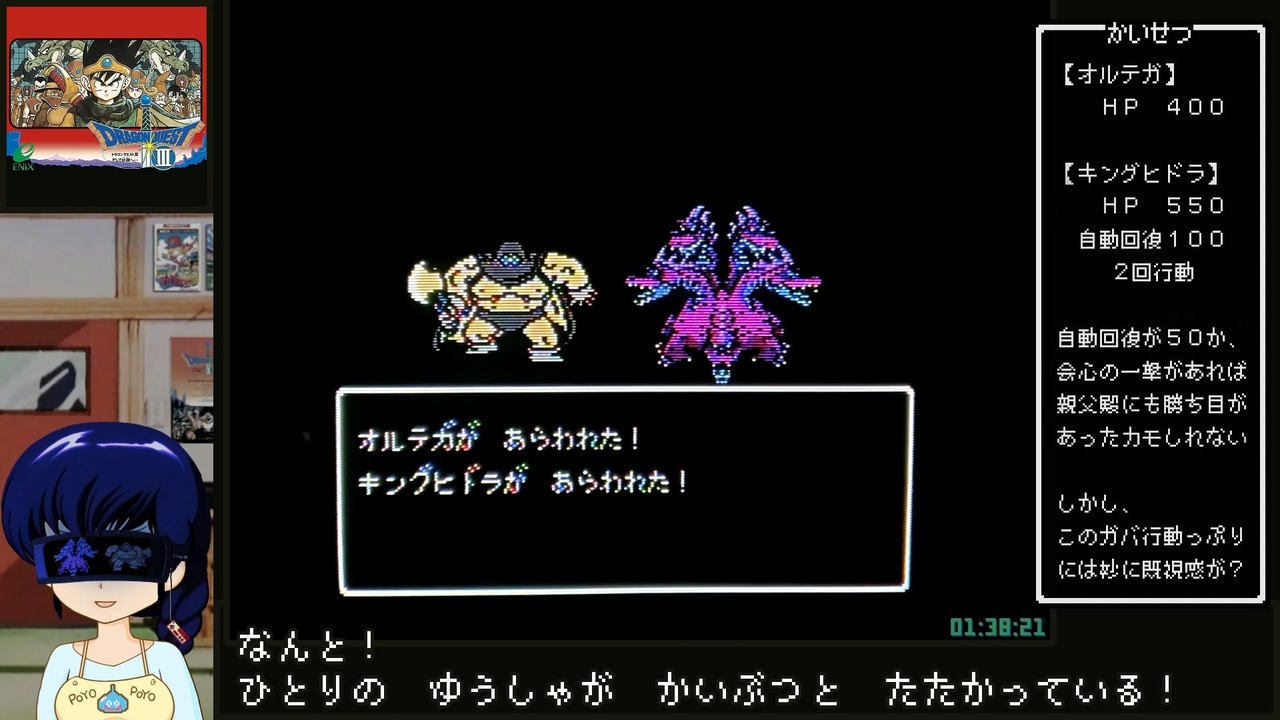なんと! <br>ひとりの ゆうしゃが かいぶつと <br>たたかっている? <br><br><br>【参考文献】<br>めぞん一刻 デジタルリマスター版<br> 01話~: <a href="https://amzn.to/3ojH2WC" target="_blank" rel="noopener nofollow">https://amzn.to/3ojH2WC</a> or <a href="https://abema.app/eYTo" target="_blank" rel="noopener nofollow">https://abema.app/eYTo</a><br> 49話~: <a href="https://amzn.to/3IVRFJd" target="_blank" rel="noopener nofollow">https://amzn.to/3IVRFJd</a> or <a href="https://abema.app/wroh" target="_blank" rel="noopener nofollow">https://abema.app/wroh</a><br>ダイの大冒険 (1991) <a href="https://amzn.to/3zMFvOy" target="_blank" rel="noopener nofollow">https://amzn.to/3zMFvOy</a><br>ダイの大冒険 (2020) <a href="https://amzn.to/3KLs08h" target="_blank" rel="noopener nofollow">https://amzn.to/3KLs08h</a> or <a href="https://abema.tv/video/title/5-25" target="_blank" rel="noopener nofollow">https://abema.tv/video/title/5-25</a><br><br>ミミックチャート <a href="https://www.nicovideo.jp/watch/sm19352617?from=930" target="_blank" rel="noopener nofollow">https://www.nicovideo.jp/watch/sm19352617?from=930</a><br>オルテガが勝つとどーなるの!? <a href="https://youtu.be/jLvsybevYRo?t=1190" target="_blank" rel="noopener nofollow">https://youtu.be/jLvsybevYRo?t=1190</a><br /> <br><br><span style="color: #e69138;">//共通説明文てすと</span><br><span style="color: #ff00ff;"><strong>【New!】</strong></span>F-ZERO RTA:<a href="https://www.nicovideo.jp/watch/sm45660939" class="watch">sm45660939</a><br>【New!】Romancing Sa・Ga2:<a href="https://www.nicovideo.jp/watch/sm44400984" class="watch">sm44400984</a> <br>【New!】らんま½爆烈乱闘篇RTA (WR):<a href="https://www.nicovideo.jp/watch/sm44178414" class="watch">sm44178414</a>(デバイス制限対策版: <a href="https://www.nicovideo.jp/watch/sm44432134" class="watch">sm44432134</a>)<br>【New!】スーパーファミスタRTA:<a href="https://www.nicovideo.jp/watch/sm43890432" class="watch">sm43890432</a><br>【New!】ファミコンRTA落とし穴可視化用アイコン:<a href="https://seiga.nicovideo.jp/seiga/im11438499" target="_blank" rel="noopener">im11438499</a>(←5月23日以降に投稿したのは消えちゃったぽい...?)<br><br>【直撮り】ブラウン管テレビでファミコンする管理人さん:<a href="https://www.nicovideo.jp/series/423780" target="_blank" rel="noopener">series/423780</a><br>【ミンサガ】RTAとか:<a href="https://www.nicovideo.jp/series/416017" target="_blank" rel="noopener">series/416017</a><br>【WS版FF2】RTA:<a href="https://www.nicovideo.jp/series/426767" target="_blank" rel="noopener">series/426767</a><br>【DEAD OR ALIVE】RTA:<a href="https://www.nicovideo.jp/series/79228" target="_blank" rel="noopener">series/79228</a><br>【バブルボブル】RTA:<a href="https://www.nicovideo.jp/series/366167" target="_blank" rel="noopener">series/366167</a><br><span style="font-size: 14px;">【アーケードアーカイブス】</span>RTA:<a href="https://www.nicovideo.jp/series/79229" target="_blank" rel="noopener">series/79229</a>
