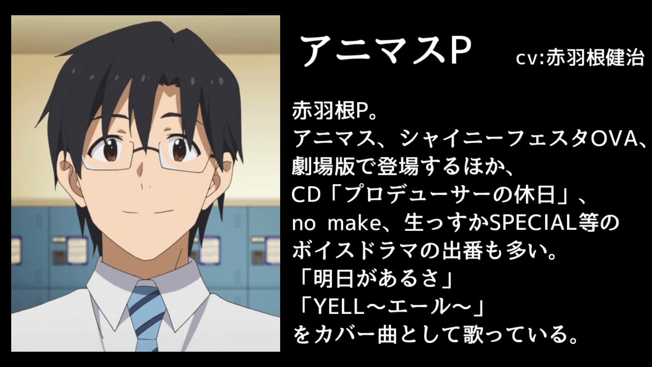 「ゲームの主人公であるP」以外のプロデューサー(漫画PとかアニメPとか)を紹介する動画です。<br><br>※ゲーム内で読める漫画のP(特に雑誌P)はゲームPな気がしますが、せっかくなので紹介しています。<br>※ゲーム初出でも主人公ではないPは紹介しています(尾崎さんとか)。<br>※追記:制作中にシャニマスのアニメ化発表がきてしまった…Pはまだどんどん増えると思うのでまた作るかも(スタマスの鳥桝和雄・金成大蔵も入れ忘れです)<br><br>アイドルマスターの名鑑外のアイドルを紹介する動画 <a href="https://www.nicovideo.jp/watch/sm38032877" class="watch">sm38032877</a> /後編 <a href="https://www.nicovideo.jp/watch/sm38034094" class="watch">sm38034094</a><br>アイドルマスターの小鳥さんを紹介する動画 <a href="https://www.nicovideo.jp/watch/sm37490878" class="watch">sm37490878</a><br>衣装名で繋ぐアイマスメドレー2 <a href="https://www.nicovideo.jp/watch/sm41775287" class="watch">sm41775287</a><br>しりとりアイマスメドレー他 <a href="https://www.nicovideo.jp/mylist/55925282" target="_blank" rel="noopener">mylist/55925282</a> /ラジオ等 <a href="https://www.nicovideo.jp/mylist/55925312" target="_blank" rel="noopener">mylist/55925312</a>