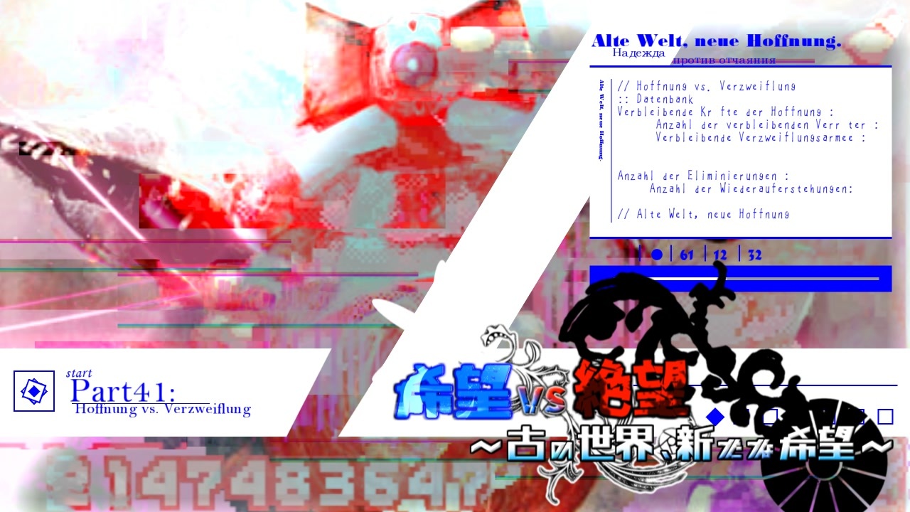 <span style="color: #ff0000; font-size: 18px;"><strong>2147483647</strong></span><br><br>いいねは35位について<br><br>BGMのリクエストは戦績表とかおまけの時にでも書いといてくれると助かります<br><br>ブログにて希望軍がどの大会から持ってきたかをメモしておきました。気になる方はどうぞ<br><span style="font-size: 10px;">BGM音量とか久々にやったので大きいとかあったら言ってください。</span><br><br>例によって戦績表ないです<br>---------------------------------------------------------------------------------------------------------------------<br>希望軍対象大会OPまとめ【<a href="https://www.nicovideo.jp/mylist/74106383" target="_blank" rel="noopener">mylist/74106383</a>】<br>絶望軍対象大会OPまとめ【<a href="https://www.nicovideo.jp/mylist/74259169" target="_blank" rel="noopener">mylist/74259169</a>】<br>大会マイリスト【<a href="https://www.nicovideo.jp/mylist/74275695" target="_blank" rel="noopener">mylist/74275695</a>】<br>大会ルール【 <a href="https://yukkuri-fie.hatenablog.com/entry/2022/12/20/005122" target="_blank" rel="noopener nofollow">https://yukkuri-fie.hatenablog.com/entry/2022/12/20/005122</a> 】<br>希望軍まとめ【 <a href="https://yukkuri-fie.hatenablog.com/entry/2022/11/23/213455" target="_blank" rel="noopener nofollow">https://yukkuri-fie.hatenablog.com/entry/2022/11/23/213455</a> 】<br>絶望軍まとめ【 <a href="https://yukkuri-fie.hatenablog.com/entry/2023/01/03/201554" target="_blank" rel="noopener nofollow">https://yukkuri-fie.hatenablog.com/entry/2023/01/03/201554</a> 】<br><br>OP : <a href="https://www.nicovideo.jp/watch/sm41581724" class="watch">sm41581724</a><br>前 : <a href="https://www.nicovideo.jp/watch/sm42051643" class="watch">sm42051643</a><br>次 : <a href="https://www.nicovideo.jp/watch/sm42082809" class="watch">sm42082809</a>