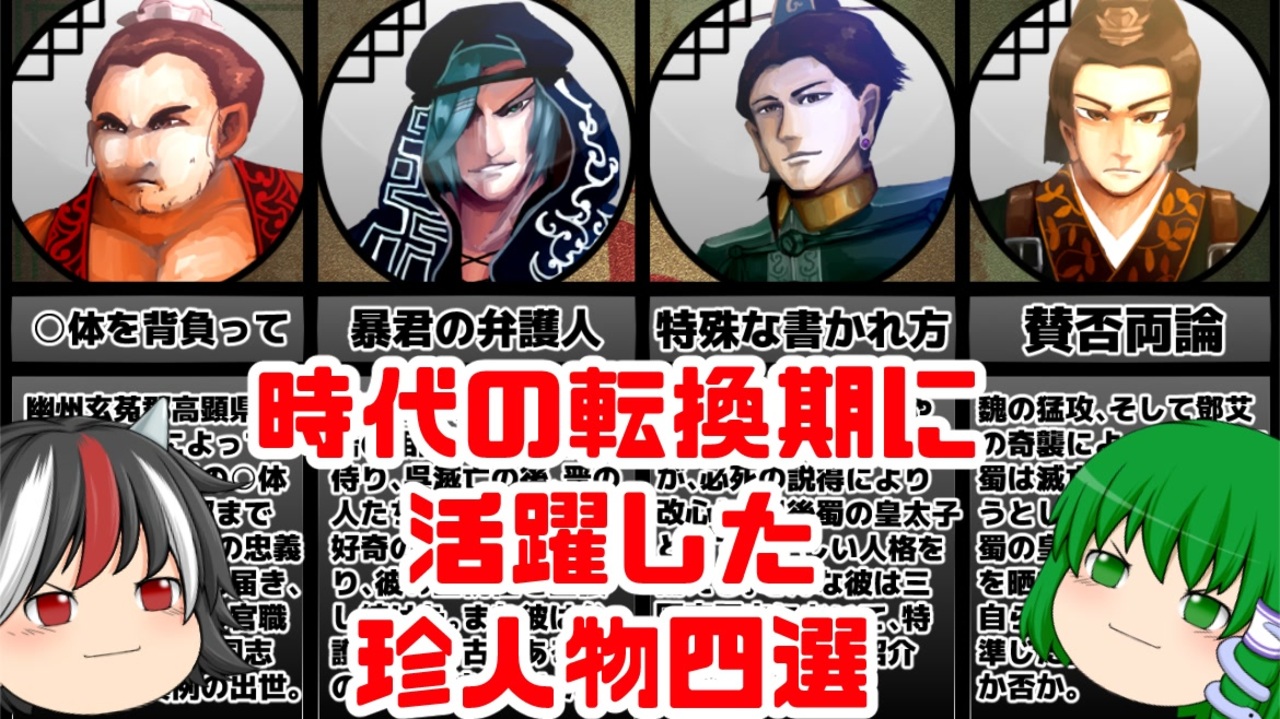 この動画は東方projectの二次創作です。AquesTalkライセンス購入済み。<br><br>◇反三国志二次創作同人誌「叔漢二國史」<br>冊子版 <a href="https://onl.sc/tKwXmmJ" target="_blank" rel="noopener nofollow">https://onl.sc/tKwXmmJ</a><br>電子書籍版 <a href="https://onl.sc/HAJFhCp" target="_blank" rel="noopener nofollow">https://onl.sc/HAJFhCp</a><br><br>三国志のメジャーではないけれど面白い人物や評価されるべき人物を紹介していきます。<br>今回は短編形式で4人の人物を解説いたします。<br>魏の末期、中華と北狄の境の町では、亡き長のために忠義を尽くし、異例の出世をした平民がいました。<br>呉の末期、三国最悪の暴君の側に侍り、国滅んでなお、旧主の名誉を守った男がいました。<br>蜀の末期、将来の皇帝となるため自らを変えた皇太子と、国に殉じて命を捧げた王がいました。<br>「各勢力の転換期」をテーマに、それぞれ人物たちの生き様を見ていきましょう。<br><br>▷第五十五回「眭固」<a href="https://www.nicovideo.jp/watch/sm41738325" class="watch">sm41738325</a><br>▷第五十七回「郭援」<a href="https://www.nicovideo.jp/watch/sm42266117" class="watch">sm42266117</a><br><br>◆◆◆◆◆◆◆◆◆◆◆◆◆◆◆◆◆◆◆◆◆◆◆<br>参考文献、補足など<br>亶夏王朝府 <a href="https://danxiawangchao.hatenablog.com/" target="_blank" rel="noopener nofollow">https://danxiawangchao.hatenablog.com/</a><br>この動画の参考文献 <a href="https://danxiawangchao.hatenablog.com/entry/2023/04/10/201528" target="_blank" rel="noopener nofollow">https://danxiawangchao.hatenablog.com/entry/2023/04/10/201528</a><br><br>この動画のイラストまとめ<br>Pixiv <a href="https://www.pixiv.net/artworks/107068110" target="_blank" rel="noopener nofollow">https://www.pixiv.net/artworks/107068110</a><br>ニコニコ静画 <a href="https://seiga.nicovideo.jp/seiga/im11166287" target="_blank" rel="noopener">im11166287</a><br>BOOTH <a href="https://danxiawangchao.booth.pm/items/4682596" target="_blank" rel="noopener nofollow">https://danxiawangchao.booth.pm/items/4682596</a><br><br>YouTubeにもアップロードしています。よろしければ評価、チャンネル登録よろしくお願いします。<br><a href="https://youtu.be/D5KlAPAqGjM" target="_blank" rel="noopener nofollow">https://youtu.be/D5KlAPAqGjM</a><br>◆◆◆◆◆◆◆◆◆◆◆◆◆◆◆◆◆◆◆◆◆◆◆<br><br>音楽効果音提供<br>チンドン演歌/稿屋 隆 様<br>オープニング/甘茶の音楽工房 様<br>民族舞踊風BGM01/バルベイタス 様<br>テーマ10/魔王魂 様<br>Battle - 侵攻/いえり 様<br>効果音提供/効果音ラボ 様<br>