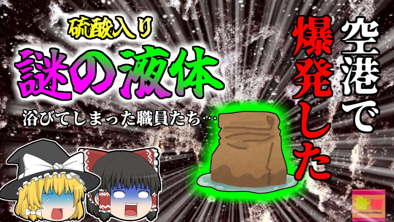 <a href="#" class="seekTime" data-seekTime="00:00" onclick="seekNicoPlayer('#00:00'); return false;">#00:00</a> 冒頭挨拶<br><a href="#" class="seekTime" data-seekTime="00:24" onclick="seekNicoPlayer('#00:24'); return false;">#00:24</a> 視聴上の注意<br><a href="#" class="seekTime" data-seekTime="1:06" onclick="seekNicoPlayer('#1:06'); return false;">#1:06</a> 本編開始<br><a href="#" class="seekTime" data-seekTime="1:57" onclick="seekNicoPlayer('#1:57'); return false;">#1:57</a> 手荷物検査で引っかかったある物<br><a href="#" class="seekTime" data-seekTime="3:27" onclick="seekNicoPlayer('#3:27'); return false;">#3:27</a> 一時的に預かることに<br><a href="#" class="seekTime" data-seekTime="4:55" onclick="seekNicoPlayer('#4:55'); return false;">#4:55</a> 紙袋が突然爆発<br><a href="#" class="seekTime" data-seekTime="6:01" onclick="seekNicoPlayer('#6:01'); return false;">#6:01</a> 再び同じことが…<br><a href="#" class="seekTime" data-seekTime="6:44" onclick="seekNicoPlayer('#6:44'); return false;">#6:44</a> 中身には硫酸も含まれていた<br><a href="#" class="seekTime" data-seekTime="8:04" onclick="seekNicoPlayer('#8:04'); return false;">#8:04</a> 爆発に至るまでの背景や要因<br><a href="#" class="seekTime" data-seekTime="9:32" onclick="seekNicoPlayer('#9:32'); return false;">#9:32</a> 必要だった対策<br><br>今回紹介するのは、空港で起きた少し珍しい事例です。<br>わが国のとある空港ではこの日、検査員男性の「Aさん」によって、機内持ち込み荷物の検査が行われていました。<br>彼は金属探知ゲート、X線検査場のある、保安検査場で乗客が機内に持ち込もうとする手荷物の中身を調べる業務についていましたが、その最中に一人の男性の荷物から、4本のペットボトルがでてきました。<br>空港のルールでは、液体の持ち込みについては、厳しい基準があり、このペットボトルの持ち込みは許可されませんでした。<br>Aさんがその旨を伝えると男性は「日帰りでまた帰ってくるから、それまで預かってほしい」と申し出たので、Aさんはそのペットボトルを別の空港職員に預け、一時保管することに。<br>しかし、その数時間後、二つの紙袋に分けて保管されていたこのペットボトルが、保管室の中で突然爆発。<br>作業をしていた男性四名の体に中身が飛散し、彼らはのどの痛みなどを訴え、病院に搬送されて行きました。<br><br>引用・出展・参考文献<br>㈱エアトリ 保安検査場をスムーズに通過するポイント<br><a href="https://ishort.ink/GWo2" target="_blank" rel="noopener nofollow">https://ishort.ink/GWo2</a><br>政府広報オンライン 空港保安検査をスムーズに通過するためのコツは?<br><a href="https://ishort.ink/PKv9" target="_blank" rel="noopener nofollow">https://ishort.ink/PKv9</a><br>液体物の持ち込みについて(国際線) | 成田国際空港公式WEB<br><a href="https://ishort.ink/7hgv" target="_blank" rel="noopener nofollow">https://ishort.ink/7hgv</a><br>厚生労働省 職場のあんぜんサイト<br><a href="https://ishort.ink/GQnH" target="_blank" rel="noopener nofollow">https://ishort.ink/GQnH</a><br><a href="https://ishort.ink/9psk" target="_blank" rel="noopener nofollow">https://ishort.ink/9psk</a><br><br><br><br />※この動画は過去の事件を知り、現在でも同じことが発生する危険性を再認識、関与しないように促すための動画であり、視聴者を扇動、動揺を誘うためのコンテンツではありません。<br><br>ご要望にお応えして、メンバーシップの開設を行いました。<br>下記URLからも登録可能ですので、ご興味がある方は是非ご参加ください。<br><a href="https://www.youtube.com/channel/UCcT5a1J7XJW7CLYI2RKl4pw/join" target="_blank" rel="noopener nofollow">https://www.youtube.com/channel/UCcT5a1J7XJW7CLYI2RKl4pw/join</a><br><br><br>Twitter<br>→<a href="https://twitter.com/yukkurisurutoko" target="_blank" rel="noopener nofollow">https://twitter.com/yukkurisurutoko</a><br><br>取り急ぎ、簡易的にですがマイリストを作りました。<br>【ゆっくり解説】事故・事件関係紹介リスト <br><a href="https://www.nicovideo.jp/mylist/71034319" target="_blank" rel="noopener nofollow">https://www.nicovideo.jp/mylist/71034319</a><br>【ゆっくり解説】放射線系事故<br><a href="https://www.nicovideo.jp/mylist/71034368" target="_blank" rel="noopener nofollow">https://www.nicovideo.jp/mylist/71034368</a><br>【ゆっくり解説】鉄道系事故・事件関連<br><a href="https://www.nicovideo.jp/mylist/71034379" target="_blank" rel="noopener nofollow">https://www.nicovideo.jp/mylist/71034379</a>