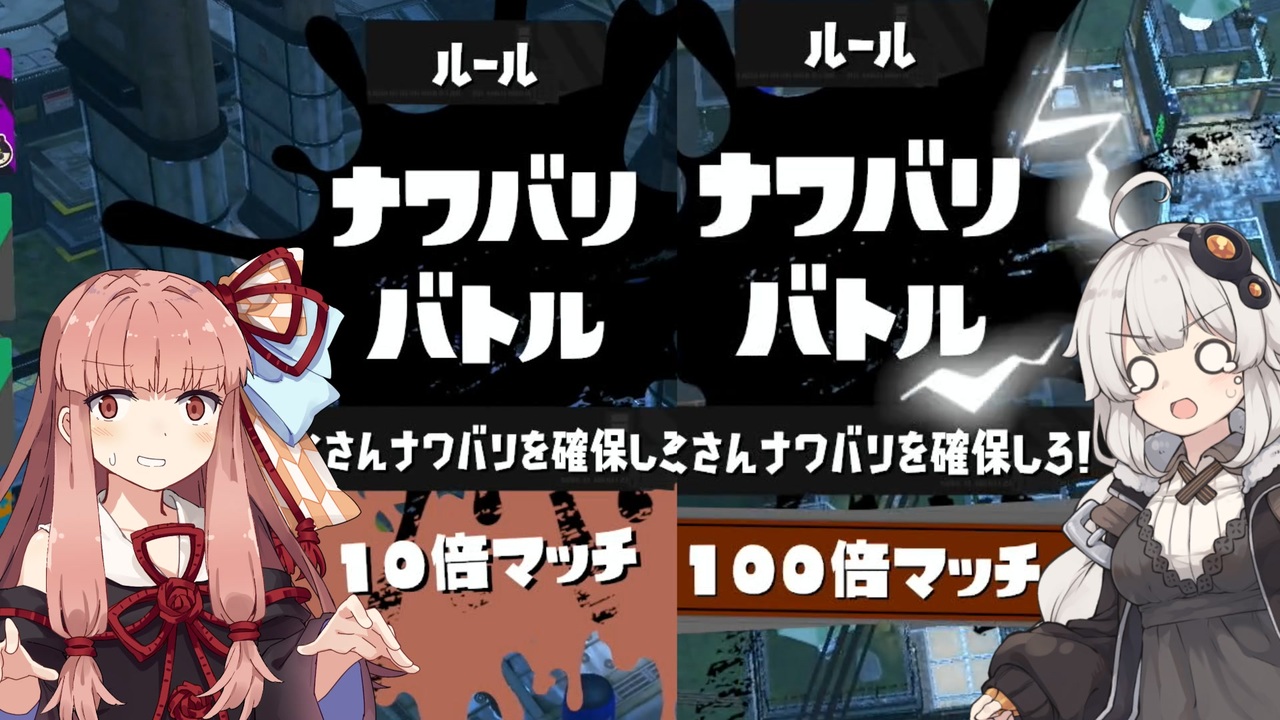 ※エンジョイ勢につきスゴ腕スーパープレイはありません。<br>みなさんフェスはいかがでしたか?葵ちゃん達は8%陣営での参入でした。8%ってどういうこと…!<br><br>4人分まとめてすると20分コースになっちゃうので、前編となる今回はナワバリバトルの10倍マッチと100倍マッチの試合をおとどけ。初心者の2人である茜ちゃんの10倍マッチとあかりちゃんの100倍マッチの試合の結果やいかに…?<br> 主役(?)の葵ちゃんとゆかりさんのトリカラバトルは動画が長くなりすぎてしまうので分割して後編として次の動画にて…。<br><br>前回のフェスの動画はコチラ。→ <a href="https://www.nicovideo.jp/watch/sm41863095" class="watch">sm41863095</a><br>〇試合リザルト<br>(K…倒した数、D…やられた数、S…スペシャル発動数、括弧内…塗りポイント順位)<br>あかね:K07,D03,S02 757p(3)<br>あかり:K04,D04,S03 1007p(1)<br><br><strong><u>〇フェス当日にいっしょにあそんでくれたSpecialThanksなイカした皆さん</u></strong><br> moko256さん <a href="https://www.nicovideo.jp/user/59390892" target="_blank" rel="noopener">user/59390892</a><br> 菱合さん <a href="https://www.nicovideo.jp/user/26727599" target="_blank" rel="noopener">user/26727599</a><br> 09(れいくう)さん <a href="https://www.nicovideo.jp/user/32709883" target="_blank" rel="noopener">user/32709883</a><br> NMLNDさん <a href="https://twitter.com/nomalandnomal" target="_blank" rel="noopener nofollow">https://twitter.com/nomalandnomal</a><br><br><strong><u>〇遊んだゲーム</u></strong><br>スプラトゥーン3 | Nintendo Switch - 任天堂<br><a href="https://www.nintendo.co.jp/switch/av5ja/index.html" target="_blank" rel="noopener nofollow">https://www.nintendo.co.jp/switch/av5ja/index.html</a><br><br>---------------------------------<br>◎いつも投稿してるいえい、葵ちゃんだぞ?のシリーズ :<a href="https://www.nicovideo.jp/series/126180" target="_blank" rel="noopener">series/126180</a>