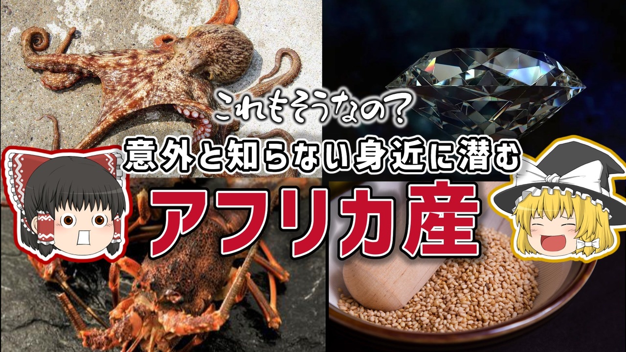 <strong>今回は意外と知られていないアフリカ産のものを解説してみました!</strong><br><u>心理的にも距離的にも遠いアフリカ</u>を身近に感じてもらいたくて、今回は日常生活に潜むアフリカ産を紹介してみましたがどうですかね?<br><br><s>あれもこれも実はアフリカ由来と考えると、なんだか生活が楽しくなってきますね</s><br><br>◆マイリスト→<a href="https://www.nicovideo.jp/mylist/73354161" target="_blank" rel="noopener nofollow">https://www.nicovideo.jp/mylist/73354161</a><br>◆アフリカの情報を上げてるうぷ主のTwitter→<a href="https://twitter.com/AfrikaanerMaris" target="_blank" rel="noopener nofollow">https://twitter.com/AfrikaanerMaris</a><br><br><br>あといいねくれるとうれしいです(いいねを押すとお礼メッセージで次の動画の予告が見れます!なお80%で外れる模様)<br>あといっぱいコメントしてくれるとうぷ主が喜びます。<br><br>アフリカに興味を持った人におすすめの本<br>→<a href="https://amzn.to/3JxjVCb" target="_blank" rel="noopener nofollow">https://amzn.to/3JxjVCb</a><br>それのkindle版<br>→<a href="https://amzn.to/3LEUGAx" target="_blank" rel="noopener nofollow">https://amzn.to/3LEUGAx</a><br>