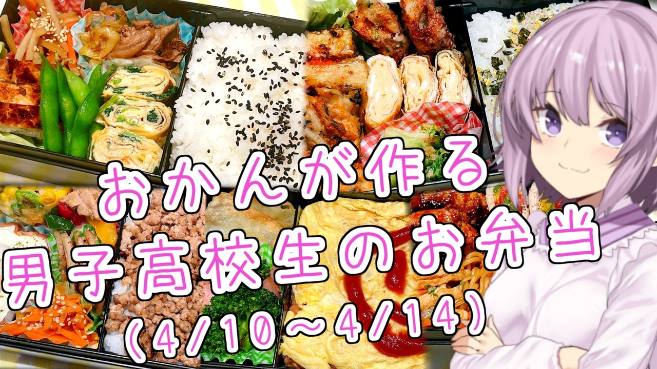 <span style="color: #262626; font-size: 16px;">(長男が高校生になり、お弁当が始まりましたので)</span><span style="color: #ff0000; font-size: 18px;"><strong>新シリーズ始動しました!</strong></span><br>※土日祝、夏休み等の長期休み以外はお弁当を作ることになると思いますので、<br>しばらくこのシリーズがメイン投稿になります。<br><br><br><span style="color: #0000ff;">~2:23 お弁当紹介<br>2:24~ 調理工程</span><br><br><br>【☆お借りした素敵な素材☆(順不同)】<br><br>【立ち絵】<br>ゆかりおかん: ヤッペン 様<br>マキちゃん:からい(かれい) 様<br>タカハシ: MtU 様<br>琴葉姉妹: 山風P 様<br>ずんだもん: 坂本アヒル 様<br><br>【素材】<br>ニコニ・コモンズ 様<br>フリーBGM:DOVA-SYNDROME 様<br>いらすとや 様<br><br><br>最後にこの動画を見てくださった皆様に心からの感謝と、<br>これからも良きご縁がありますように!(*´ω`*)<br><br><br>前作品:イカフリッター【<a href="https://www.nicovideo.jp/watch/sm42005080" class="watch">sm42005080</a> 】<br>次回作:ゆかりおかんのお弁当紹介(4/17~4/21)【<a href="https://www.nicovideo.jp/watch/sm42115995" class="watch">sm42115995</a> 】<br><br><br>Twitter:<a href="https://twitter.com/moegimon " target="_blank" rel="noopener nofollow">https://twitter.com/moegimon </a><br><br>you tube:<a href="https://www.youtube.com/channel/UCP2N3uBfzKEoqCGviIvs0Ew " target="_blank" rel="noopener nofollow">https://www.youtube.com/channel/UCP2N3uBfzKEoqCGviIvs0Ew </a><br><br>ご支援:<a href="https://www.amazon.co.jp/hz/wishlist/ls/ZBWL10H8ML75?ref_=wl_share" target="_blank" rel="noopener nofollow">https://www.amazon.co.jp/hz/wishlist/ls/ZBWL10H8ML75?ref_=wl_share</a><br><br><br><span style="color: #ff0000;">実妹の縁と合同アカウント(DW-Double Witch-)<br>こちらも宜しくおねがいします!</span><br><br>Twitter:<a href="https://twitter.com/witchdouble2" target="_blank" rel="noopener nofollow">https://twitter.com/witchdouble2</a><br><br>ニコ動:<a href="https://www.nicovideo.jp/user/89325934" target="_blank" rel="noopener nofollow">https://www.nicovideo.jp/user/89325934</a><br><br>you tube:<a href="https://www.youtube.com/channel/UC12q0n98NSyGykCbsP2G8ig" target="_blank" rel="noopener nofollow">https://www.youtube.com/channel/UC12q0n98NSyGykCbsP2G8ig</a><br>