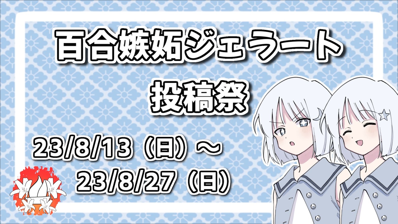期間:23/8/13~23/8/27(お盆休み~ジェラートの日まで)<br><br>補足動画:<a href="https://www.nicovideo.jp/watch/sm42263394" class="watch">sm42263394</a> 一斉投稿告知:<a href="https://www.nicovideo.jp/watch/sm42310838" class="watch">sm42310838</a><br><br><u>どんな作品を作れば良いの?<br>→<a href="#" class="seekTime" data-seekTime="2:27" onclick="seekNicoPlayer('#2:27'); return false;">#2:27</a>(言葉を分解)、<a href="#" class="seekTime" data-seekTime="3:18" onclick="seekNicoPlayer('#3:18'); return false;">#3:18</a>(言葉をそのまま)</u><br><br>タグ:百合嫉妬ジェラート投稿祭<br>投稿祭のロゴ:<a href="https://commons.nicovideo.jp/works/nc300706" target="_blank" rel="noopener">nc300706</a>(嫉妬の炎付)<a href="https://commons.nicovideo.jp/works/nc300707" target="_blank" rel="noopener">nc300707</a>(嫉妬の炎無し)<br>投稿祭動画一覧:<a href="https://www.nicovideo.jp/mylist/75048278" target="_blank" rel="noopener">mylist/75048278</a><br><br><a href="#" class="seekTime" data-seekTime="0:11" onclick="seekNicoPlayer('#0:11'); return false;">#0:11</a> 開催時期<br><a href="#" class="seekTime" data-seekTime="0:25" onclick="seekNicoPlayer('#0:25'); return false;">#0:25</a> 対象<br><a href="#" class="seekTime" data-seekTime="0:45" onclick="seekNicoPlayer('#0:45'); return false;">#0:45</a> ジャンル<br><a href="#" class="seekTime" data-seekTime="0:58" onclick="seekNicoPlayer('#0:58'); return false;">#0:58</a> 禁則事項<br><a href="#" class="seekTime" data-seekTime="2:27" onclick="seekNicoPlayer('#2:27'); return false;">#2:27</a> 『百合嫉妬ジェラート』(原則)<br><a href="#" class="seekTime" data-seekTime="3:18" onclick="seekNicoPlayer('#3:18'); return false;">#3:18</a> 『百合嫉妬ジェラート』(例外)<br><a href="#" class="seekTime" data-seekTime="3:58" onclick="seekNicoPlayer('#3:58'); return false;">#3:58</a> 補足説明<br><a href="#" class="seekTime" data-seekTime="4:25" onclick="seekNicoPlayer('#4:25'); return false;">#4:25</a> Q&A<br><a href="#" class="seekTime" data-seekTime="9:34" onclick="seekNicoPlayer('#9:34'); return false;">#9:34</a> もち子さんのご紹介<br><a href="#" class="seekTime" data-seekTime="10:46" onclick="seekNicoPlayer('#10:46'); return false;">#10:46</a> サンプル動画<br><br>各種ボイスの配布・販売先!<br><a href="https://manakana-vt.booth.pm/items/3884645" target="_blank" rel="noopener nofollow">https://manakana-vt.booth.pm/items/3884645</a><br><a href="https://manakana-vt.booth.pm/items/4222328" target="_blank" rel="noopener nofollow">https://manakana-vt.booth.pm/items/4222328</a><br><a href="https://mochizoram.booth.pm/items/4861170" target="_blank" rel="noopener nofollow">https://mochizoram.booth.pm/items/4861170</a><br><br>【その他簡易レギュレーション】<br>対象:音声合成ソフトウェアキャラクターの動画、静画、小説<br><span style="font-size: 10px;">※CoeFont様は『アリアルさん、ミリアルさん、アベルーニくんのみ参加OK』※</span><br>ジャンル:不問(R-18、R-18G作品は除く)<br>他の企画と同時参加:NG(トラブル防止のため)<br><br>□キャスト<br>ナコ(NAKO):MANA@COEIROINK+ボイス素材/<a href="https://commons.nicovideo.jp/works/nc272258" target="_blank" rel="noopener">nc272258</a><br>レコ(RECO):つくよみちゃん@COEIROINK<br>もち子(cv 明日葉よもぎ)<br>IA・ONE(CS7)<br>琴葉茜(A.I.VOICE)弦巻マキ(CeVIO_AI)<br>COEIROINK: <a href="https://coeiroink.com" target="_blank" rel="noopener nofollow">https://coeiroink.com</a><br>VOICEVOX公式サイト:<a href="https://voicevox.hiroshiba.jp/" target="_blank" rel="noopener nofollow">https://voicevox.hiroshiba.jp/</a><br><br>□立ち絵<br>ナコ/<a href="https://seiga.nicovideo.jp/seiga/im10866912" target="_blank" rel="noopener">im10866912</a><br>レコ/<a href="https://seiga.nicovideo.jp/seiga/im10866915" target="_blank" rel="noopener">im10866915</a><br>MANAさん/<a href="https://seiga.nicovideo.jp/seiga/im10970918" target="_blank" rel="noopener">im10970918</a><br>KANAさん/<a href="https://seiga.nicovideo.jp/seiga/im11027187" target="_blank" rel="noopener">im11027187</a><br>もち子さん/<a href="https://seiga.nicovideo.jp/seiga/im10972243" target="_blank" rel="noopener">im10972243</a><br>琴葉茜/<a href="https://seiga.nicovideo.jp/seiga/im10706241" target="_blank" rel="noopener">im10706241</a><br><br>□BGM・効果音等<br>音楽の卵様/step on the road、ミルクティー<br>効果音ラボ様<br>ニコニコモンズ様(コンテンツツリー参照)