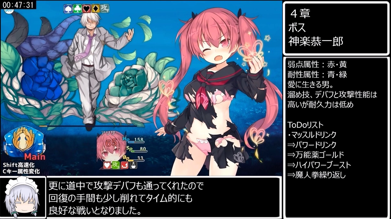 純愛というのはとても美しい呪いのような異常性癖なのです。<br><br>おまけ動画は個人的に少年漫画ソウルを感じたシーンを載せていきます。<br><br><strong>【サークルくらすけ倉庫】</strong>様制作のR-18RPG<br><strong>【アリサグリモア】</strong>RTAです。<br><br>計測開始:ニューゲームを選択した瞬間<br>計測終了:最後の選択肢で「はい」を選択した瞬間<br><br><a href="https://www.nicovideo.jp/watch/sm42072296" class="watch">sm42072296</a>←前 次→<a href="https://www.nicovideo.jp/watch/sm42132892" class="watch">sm42132892</a><br><br>前作、ナイトテールRTA→<a href="https://www.nicovideo.jp/watch/sm40831905" class="watch">sm40831905</a><br><br>アリサグリモアRTAマイリスト→<a href="https://www.nicovideo.jp/mylist/75009297" target="_blank" rel="noopener">mylist/75009297</a><br>前作、ナイトテールRTAマイリスト→<a href="https://www.nicovideo.jp/mylist/73559923" target="_blank" rel="noopener">mylist/73559923</a><br><br>パート1と単発のマイリスト→<a href="https://www.nicovideo.jp/mylist/70659794" target="_blank" rel="noopener">mylist/70659794</a><br><br><br>twitter:<a href="https://twitter.com/hihidowser" target="_blank" rel="noopener nofollow">https://twitter.com/hihidowser</a><br><br>スマホやタブレット等から見られない方はこちらの動画を参考にすると<br>見られるようになるはずです→ <a href="https://www.nicovideo.jp/watch/sm38575952" class="watch">sm38575952</a><br><br><strong>[アリサグリモア]の購入は下記サイトにて!<br>DLsite(PC):</strong>ttps://www.dlsite.com/maniax/work/=/product_id/RJ383251.html<br><br>作者様twitter:<a href="https://twitter.com/kura242" target="_blank" rel="noopener nofollow">https://twitter.com/kura242</a><br><br><br>