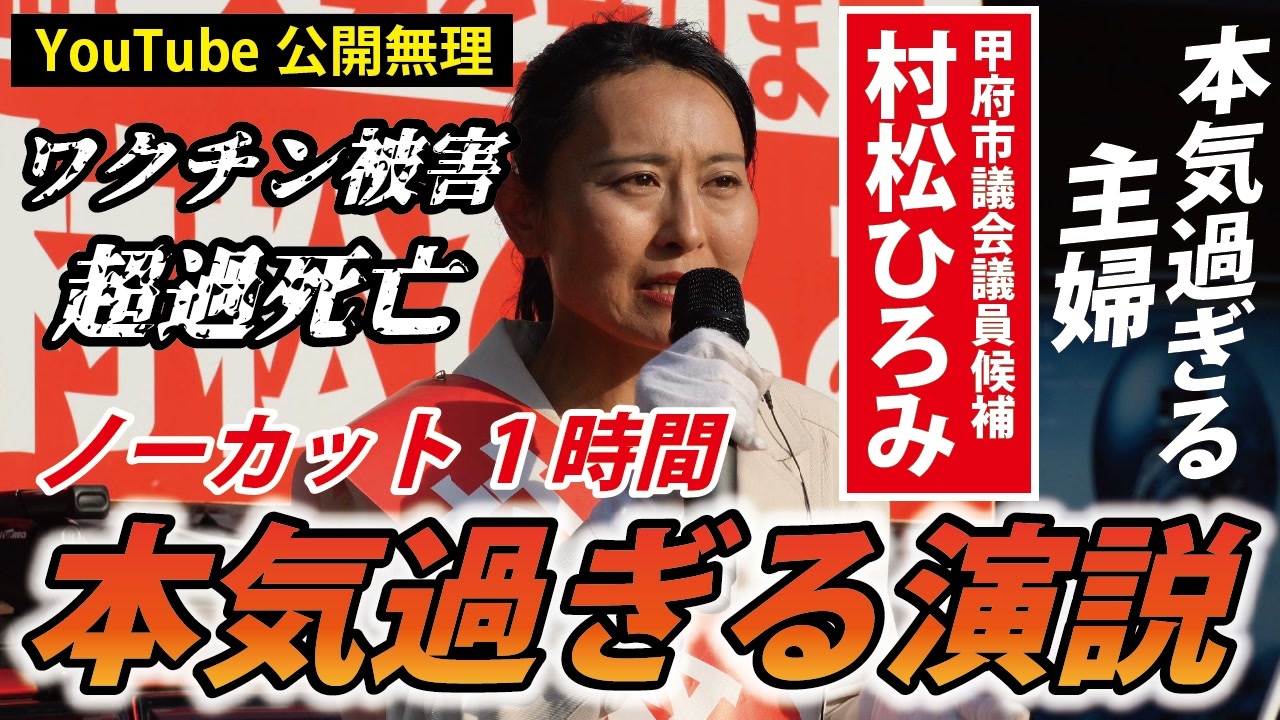 令和5年4月20日 甲府駅南口にて<br><br>この動画は、投稿者が現地で撮影したものです。<br><br>村松ひろみ候補のこれまでの活動はこちら<br>【甲府市議選】主婦/村松ひろみ、やむにやまれず立候補―<br><a href="https://www.nicovideo.jp/watch/sm42100414" target="_blank" rel="noopener nofollow">https://www.nicovideo.jp/watch/sm42100414</a><br><br>―――――――――――――――――――――――――――――――<br><br>❑4月10日発売予定「世界を欺いた〇〇〇〇〇〇〇」(宝島社新書)<br><a href="https://amzn.to/3ymDfgr" target="_blank" rel="noopener nofollow">https://amzn.to/3ymDfgr</a><br>鳥集徹(著) 闇のダディ(著) 藤江成光(著)←私<br><br>―――――――――――――――――――――――――――――――<br><br>❑新しい動画サイト「真の日本人増加計画」始めました!<br><a href="https://nicochannel.jp/fujie/" target="_blank" rel="noopener nofollow">https://nicochannel.jp/fujie/</a><br>(ニコニコチャンネル+)<br><br><br>❏藤江の活動を支援していただける方向け<br>【藤江支援口座】のご案内<br>住信SBIネット銀行 ミカン支店(店番号103)<br>口座番号 3107694<br>口座名義 フジエ マサミツ<br><br>――――――――――――――――――――――――――――――<br><br>日本の人口増加を目指す男、藤江です!【メインチャンネル】<br><a href="https://www.youtube.com/c/JINKOUZOUKA/" target="_blank" rel="noopener nofollow">https://www.youtube.com/c/JINKOUZOUKA/</a><br><br>地域と日本の存続のためニ!【藤江2ndチャンネル】<br><a href="https://www.youtube.com/channel/UCfBh4rv5UT7D-qR6KsoZrsA" target="_blank" rel="noopener nofollow">https://www.youtube.com/channel/UCfBh4rv5UT7D-qR6KsoZrsA</a><br><br>今こそ!三千年の底力【藤江3rdチャンネル】<br><a href="https://www.youtube.com/channel/UC5Yrsm8-X8nZj4uKgvE7CBw" target="_blank" rel="noopener nofollow">https://www.youtube.com/channel/UC5Yrsm8-X8nZj4uKgvE7CBw</a><br><br>四海兄弟【藤江4thチャンネル】<br><a href="https://www.youtube.com/channel/UCiyJNO57quj80Ysy7nOABvA" target="_blank" rel="noopener nofollow">https://www.youtube.com/channel/UCiyJNO57quj80Ysy7nOABvA</a><br><br>五穀豊穣【藤江5thチャンネル】<br><a href="https://www.youtube.com/channel/UCptMJCoKYghfew5tDzoEqHQ" target="_blank" rel="noopener nofollow">https://www.youtube.com/channel/UCptMJCoKYghfew5tDzoEqHQ</a><br><br>六根清浄【藤江6thチャンネル】<br><a href="https://www.youtube.com/@FUJIE6th" target="_blank" rel="noopener nofollow">https://www.youtube.com/@FUJIE6th</a><br><br>藤江のTwitter<br><a href="https://twitter.com/JINKOUZOUKA_jp" target="_blank" rel="noopener nofollow">https://twitter.com/JINKOUZOUKA_jp</a><br><br>藤江のニコニコ動画<br><a href="https://www.nicovideo.jp/user/5457748" target="_blank" rel="noopener nofollow">https://www.nicovideo.jp/user/5457748</a>