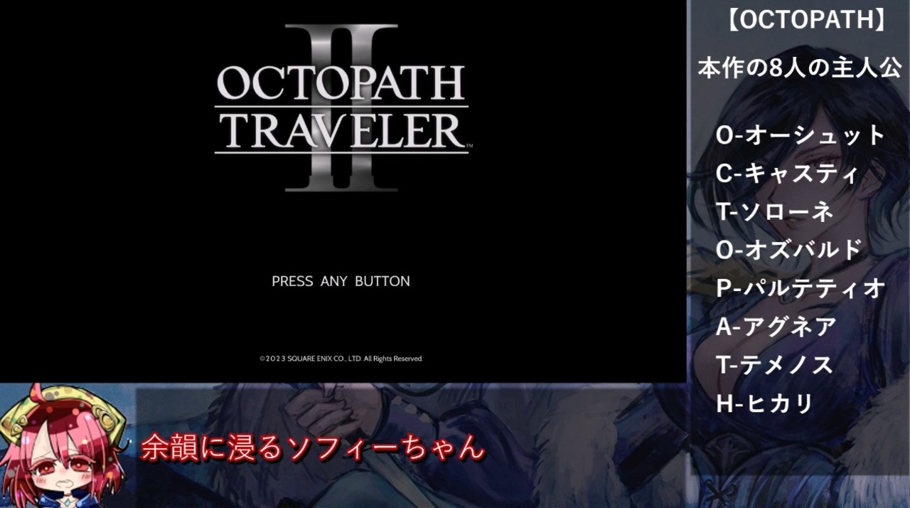 前回の投稿から4年弱経っていたので初投稿です<br>4/13に世界記録達成しましたが、6/9に抜かれちゃいました。新しい世界記録もめでたい!<br><br><strong><i><u>パルテティオ1章スタート ~ オズバルド4章終わりまで</u></i></strong><br><br>本ゆっくり解説動画はPS5版オクトパストラベラー2 (OCTOPATH TRAVELERⅡ) any% RTAとなります<br><strong><u>ネタバレを含みますので視聴する際はご注意ください</u></strong><br><br>【レギュレーションとプレイ環境】<br>計測開始:主人公を選択した瞬間<br>計測終了:EDが始まった瞬間<br>使用行為:打消し玉の仕様<br>禁止事項:バグ技<br>プラットフォーム:PS5(60FPS)<br><br><strong>【チャート】<br><a href="https://note.com/sakanajoyu/n/nc36cebb664dc" target="_blank" rel="noopener nofollow">https://note.com/sakanajoyu/n/nc36cebb664dc</a></strong><br><br>【Twitter】<br><a href="https://twitter.com/sakanajoyu" target="_blank" rel="noopener nofollow">https://twitter.com/sakanajoyu</a><br><br><br>今まで作った動画part1集→【<a href="https://www.nicovideo.jp/mylist/59046456" target="_blank" rel="noopener">mylist/59046456</a>】<br>オクトパストラベラー2 any% RTAマイリスト→【<a href="https://www.nicovideo.jp/mylist/75073247" target="_blank" rel="noopener">mylist/75073247</a>】<br><strong>前→【なし】<br>次→【<a href="https://www.nicovideo.jp/watch/sm42116311" class="watch">sm42116311</a>】</strong><br><br><br>© 2023 SQUARE ENIX CO., LTD. All Rights Reserved.