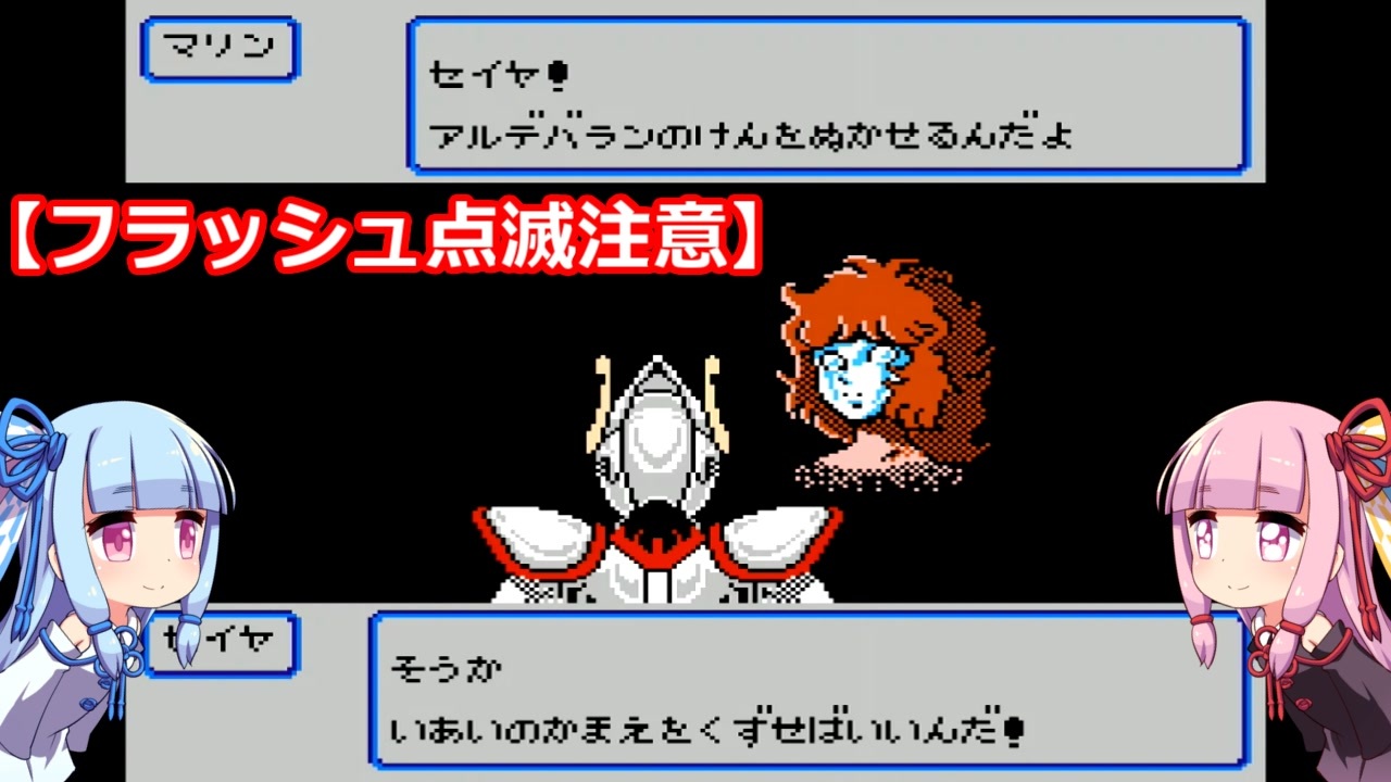フラッシュが点滅するシーンがありますので、ご視聴の際はご注意願います。<br><br>FCソフト、聖闘士星矢黄金伝説完結編をプレイしました。<br>金牛宮編です。<br>原作を再現しない場合の if ストーリーが沢山あれば<br>色々と選択の幅が広がるのに…と思ってしまいます。<br><br>最後の全員のコスモとライフの上限の記載が間違っていますので、早期に修正投稿します。<br><br>お借りした素材<br>blueberry様 <a href="https://seiga.nicovideo.jp/seiga/im6561508" target="_blank" rel="noopener">im6561508</a> <br><br>琴葉姉妹Part1マイリスト⇒<a href="https://www.nicovideo.jp/mylist/74721174" target="_blank" rel="noopener">mylist/74721174</a><br>前作の黄金伝説 ⇒<a href="https://www.nicovideo.jp/watch/sm41667752" class="watch">sm41667752</a><br>完結編 ♯1白羊宮 ⇒<a href="https://www.nicovideo.jp/watch/sm42105873" class="watch">sm42105873</a><br><br><a target="_blank" href="https://qa.nicovideo.jp/faq/show/19424?site_domain=default" style="font-size: 13px;color: #657586; text-decoration: underline; line-height: 1.4">この動画は投稿者によって修正されました</a>