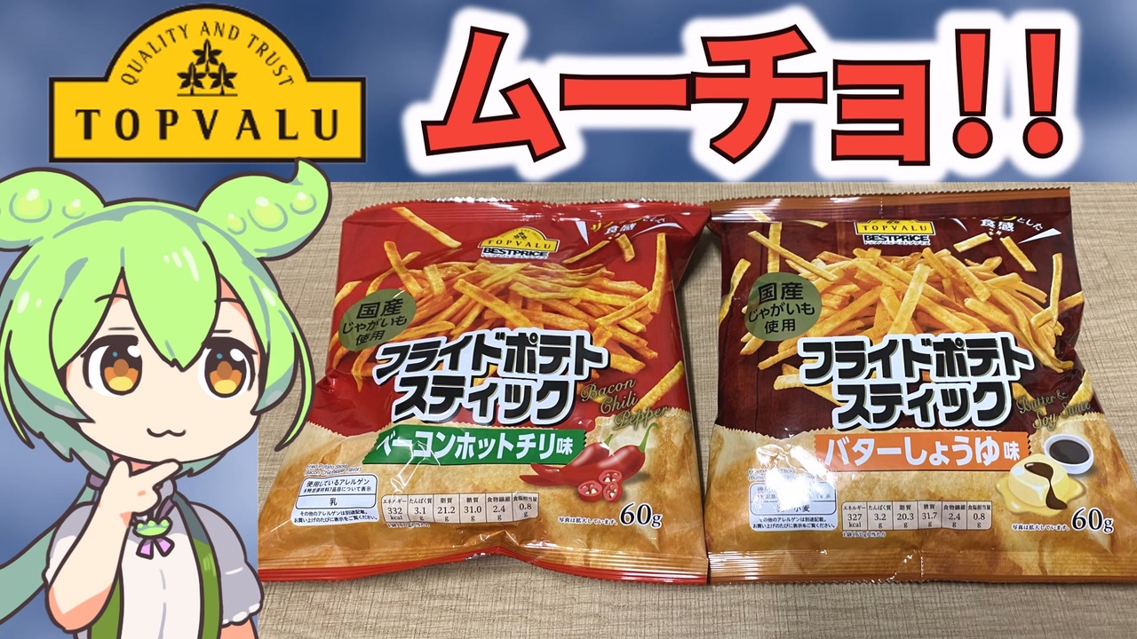 カラムーチョに似てるのを見つけました<br><br>【参考】<br>フライドポテトスティックベーコンホットチリ味<br><a href="https://www.topvalu.net/items/detail/4549414167078/" target="_blank" rel="noopener nofollow">https://www.topvalu.net/items/detail/4549414167078/</a><br>フライドポテトスティックバターしょうゆ味<br><a href="https://www.topvalu.net/items/detail/4549414167061/" target="_blank" rel="noopener nofollow">https://www.topvalu.net/items/detail/4549414167061/</a><br>イケイケGOGO! 未来へGOGO!おいしく、たのしく、湖池屋SDGs!<br><a href="https://koike-ya.com/sdgs/index.html" target="_blank" rel="noopener nofollow">https://koike-ya.com/sdgs/index.html</a><br>「トップバリュの赤いヤツ」と「モーリッシュスナック」食べ比べ(ポテトチップス編)<br><a href="https://www.youtube.com/watch?v=Lz5kB7cb5cM&ab_channel=maryu4492" target="_blank" rel="noopener nofollow">https://www.youtube.com/watch?v=Lz5kB7cb5cM&ab_channel=maryu4492</a><br><br><br>【使用した素材】(※敬称略)<br>(合成音声)VOICEVOX/ずんだもん/四国めたん<br><a href="https://voicevox.hiroshiba.jp/" target="_blank" rel="noopener nofollow">https://voicevox.hiroshiba.jp/</a><br>(立ち絵)坂本アヒル<br><a href="https://seiga.nicovideo.jp/seiga/im10788496" target="_blank" rel="noopener">im10788496</a>/<a href="https://seiga.nicovideo.jp/seiga/im10791276" target="_blank" rel="noopener">im10791276</a><br>(楽曲)甘茶の音楽工房/「楽しい麦畑」「フルーツパフェ」<br><a href="https://amachamusic.chagasi.com/" target="_blank" rel="noopener nofollow">https://amachamusic.chagasi.com/</a><br>(効果音)音人<br><a href="https://on-jin.com/" target="_blank" rel="noopener nofollow">https://on-jin.com/</a>