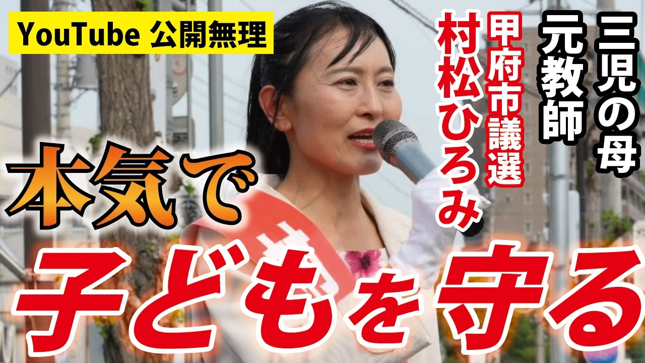 令和5年4月21日 甲府市にて<br><br>この動画は投稿者が現地で撮影したものです。<br><br>甲府市議会議員候補 村松ひろみ<br><br>❑村松ひろみさんのこれまでの「本気過ぎる活動」はこちら<br><a href="https://www.nicovideo.jp/watch/sm42100414" target="_blank" rel="noopener nofollow">https://www.nicovideo.jp/watch/sm42100414</a><br><br>―――――――――――――――――――――――――――――――<br><br>❑4月10日発売予定「世界を欺いた〇〇〇〇〇〇〇」(宝島社新書)<br><a href="https://amzn.to/3ymDfgr" target="_blank" rel="noopener nofollow">https://amzn.to/3ymDfgr</a><br>鳥集徹(著) 闇のダディ(著) 藤江成光(著)←私<br><br>―――――――――――――――――――――――――――――――<br><br>❑新しい動画サイト「真の日本人増加計画」始めました!<br><a href="https://nicochannel.jp/fujie/" target="_blank" rel="noopener nofollow">https://nicochannel.jp/fujie/</a><br>(ニコニコチャンネル+)<br><br><br>❏藤江の活動を支援していただける方向け<br>【藤江支援口座】のご案内<br>住信SBIネット銀行 ミカン支店(店番号103)<br>口座番号 3107694<br>口座名義 フジエ マサミツ<br><br>――――――――――――――――――――――――――――――<br><br>日本の人口増加を目指す男、藤江です!【メインチャンネル】<br><a href="https://www.youtube.com/c/JINKOUZOUKA/" target="_blank" rel="noopener nofollow">https://www.youtube.com/c/JINKOUZOUKA/</a><br><br>地域と日本の存続のためニ!【藤江2ndチャンネル】<br><a href="https://www.youtube.com/channel/UCfBh4rv5UT7D-qR6KsoZrsA" target="_blank" rel="noopener nofollow">https://www.youtube.com/channel/UCfBh4rv5UT7D-qR6KsoZrsA</a><br><br>今こそ!三千年の底力【藤江3rdチャンネル】<br><a href="https://www.youtube.com/channel/UC5Yrsm8-X8nZj4uKgvE7CBw" target="_blank" rel="noopener nofollow">https://www.youtube.com/channel/UC5Yrsm8-X8nZj4uKgvE7CBw</a><br><br>四海兄弟【藤江4thチャンネル】<br><a href="https://www.youtube.com/channel/UCiyJNO57quj80Ysy7nOABvA" target="_blank" rel="noopener nofollow">https://www.youtube.com/channel/UCiyJNO57quj80Ysy7nOABvA</a><br><br>五穀豊穣【藤江5thチャンネル】<br><a href="https://www.youtube.com/channel/UCptMJCoKYghfew5tDzoEqHQ" target="_blank" rel="noopener nofollow">https://www.youtube.com/channel/UCptMJCoKYghfew5tDzoEqHQ</a><br><br>六根清浄【藤江6thチャンネル】<br><a href="https://www.youtube.com/@FUJIE6th" target="_blank" rel="noopener nofollow">https://www.youtube.com/@FUJIE6th</a><br><br>藤江のTwitter<br><a href="https://twitter.com/JINKOUZOUKA_jp" target="_blank" rel="noopener nofollow">https://twitter.com/JINKOUZOUKA_jp</a><br><br>藤江のニコニコ動画<br><a href="https://www.nicovideo.jp/user/5457748" target="_blank" rel="noopener nofollow">https://www.nicovideo.jp/user/5457748</a>