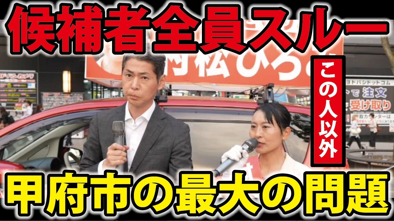 令和5年4月21日 甲府駅南口にて<br><br>この動画は投稿者が現地で撮影したものです。<br>っていうか、投稿者が画面に出ています。<br><br>甲府市議会議員候補 村松ひろみ<br><a href="https://go2senkyo.com/seijika/186037" target="_blank" rel="noopener nofollow">https://go2senkyo.com/seijika/186037</a><br><br>―――――――――――――――――――――――――――――――<br><br>❑4月10日発売予定「世界を欺いた〇〇〇〇〇〇〇」(宝島社新書)<br><a href="https://amzn.to/3ymDfgr" target="_blank" rel="noopener nofollow">https://amzn.to/3ymDfgr</a><br>鳥集徹(著) 闇のダディ(著) 藤江成光(著)←私<br><br>―――――――――――――――――――――――――――――――<br><br>❑新しい動画サイト「真の日本人増加計画」始めました!<br><a href="https://nicochannel.jp/fujie/" target="_blank" rel="noopener nofollow">https://nicochannel.jp/fujie/</a><br>(ニコニコチャンネル+)<br><br><br>❏藤江の活動を支援していただける方向け<br>【藤江支援口座】のご案内<br>住信SBIネット銀行 ミカン支店(店番号103)<br>口座番号 3107694<br>口座名義 フジエ マサミツ<br><br>――――――――――――――――――――――――――――――<br><br>日本の人口増加を目指す男、藤江です!【メインチャンネル】<br><a href="https://www.youtube.com/c/JINKOUZOUKA/" target="_blank" rel="noopener nofollow">https://www.youtube.com/c/JINKOUZOUKA/</a><br><br>地域と日本の存続のためニ!【藤江2ndチャンネル】<br><a href="https://www.youtube.com/channel/UCfBh4rv5UT7D-qR6KsoZrsA" target="_blank" rel="noopener nofollow">https://www.youtube.com/channel/UCfBh4rv5UT7D-qR6KsoZrsA</a><br><br>今こそ!三千年の底力【藤江3rdチャンネル】<br><a href="https://www.youtube.com/channel/UC5Yrsm8-X8nZj4uKgvE7CBw" target="_blank" rel="noopener nofollow">https://www.youtube.com/channel/UC5Yrsm8-X8nZj4uKgvE7CBw</a><br><br>四海兄弟【藤江4thチャンネル】<br><a href="https://www.youtube.com/channel/UCiyJNO57quj80Ysy7nOABvA" target="_blank" rel="noopener nofollow">https://www.youtube.com/channel/UCiyJNO57quj80Ysy7nOABvA</a><br><br>五穀豊穣【藤江5thチャンネル】<br><a href="https://www.youtube.com/channel/UCptMJCoKYghfew5tDzoEqHQ" target="_blank" rel="noopener nofollow">https://www.youtube.com/channel/UCptMJCoKYghfew5tDzoEqHQ</a><br><br>六根清浄【藤江6thチャンネル】<br><a href="https://www.youtube.com/@FUJIE6th" target="_blank" rel="noopener nofollow">https://www.youtube.com/@FUJIE6th</a><br><br>藤江のTwitter<br><a href="https://twitter.com/JINKOUZOUKA_jp" target="_blank" rel="noopener nofollow">https://twitter.com/JINKOUZOUKA_jp</a><br><br>藤江のニコニコ動画<br><a href="https://www.nicovideo.jp/user/5457748" target="_blank" rel="noopener nofollow">https://www.nicovideo.jp/user/5457748</a>