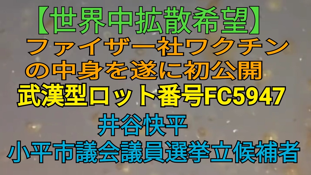 SNSでの拡散にご協力願います<br><br>ファイザー社ワクチンの中身を遂に初公開。武漢型ロット番号FC5947 死亡者21名出ているロットで す。 井谷と井谷の支援者(反ワ クチンおじさん) が小平市議会 選挙の個人演説会にて命をかけて映像公開します。 沢山の金属 ナノ粒子のような物が見えると 思います。 そしてクルクル回る 物体もしっかり捉えています。<br><br>『私が日々いくら国民の皆様に ワクチンが危険だと訴えてもな かなか広がらず悩んでいた所、 手を差し伸べてくれたのがワクチンの中身を調べてる反ワクお じさんです。 そして今回出演と 情報公開を依頼し快く承諾して くれました』<br><br><a href="https://www.newsweekjapan.jp/stories/world/2016/04/post-4998_1.php" target="_blank" rel="noopener nofollow">https://www.newsweekjapan.jp/stories/world/2016/04/post-4998_1.php</a><br><br>↑ 『テスラ泳動<br><br>(Teslaphoresis) で動くワク チン内のナノボットの映像を選挙で見せれば、 自己組織化して Bluetooth信号を発信させる可能性があることなど含め、 ポス ターに書いた酸化グラフェンの 危険性を証明できると思いました』<br>※グラフェンを筒状にしたのが カーボンナノチューブ<br><br>【接種者で体調が不安な人へ】 グルタチオン、 Nアセチルシステインなどで(スペイン学者推 奨の動画で解毒が自分でもきま す)<br><br><a href="https://rumble.com/vjf3dh-covid-19-covid-19-is-caused-by-graphene-oxide-20210625.html" target="_blank" rel="noopener nofollow">https://rumble.com/vjf3dh-covid-19-covid-19-is-caused-by-graphene-oxide-20210625.html</a><br><br>また後遺症で成果を出してる医師に繋げます<br>井谷は国民の命を守る政策を最優先致します。<br><br>明日4/23の小平市議会議員選挙日は「井谷快平」 に一票よろしくお願い致します。 皆様本日が 革命の日です大拡散をよろしく お願い致します。<br><br>政府メディア警察はワクチン成分をしっかり調査し国民に公表 して下さい。 国民の命がかかってるんです。<br><br>【酸化グラフェン、5G、ナノマ<br><br>シン】 <a href="https://twitter.com/sibirekurage369/status/1635518747439153159?t=ou5bnT-zo3vuyvGLtOMD3w&s=19" target="_blank" rel="noopener nofollow">https://twitter.com/sibirekurage369/status/1635518747439153159?t=ou5bnT-zo3vuyvGLtOMD3w&s=19</a><br><br>【 井谷のドキュメンタリー】 <a href="https://twitter.com/sibirekurage369/status/1648761427040296960?t=nNPeDAkjp2kdYz14QZ0-WA&s=19" target="_blank" rel="noopener nofollow">https://twitter.com/sibirekurage369/status/1648761427040296960?t=nNPeDAkjp2kdYz14QZ0-WA&s=19</a>