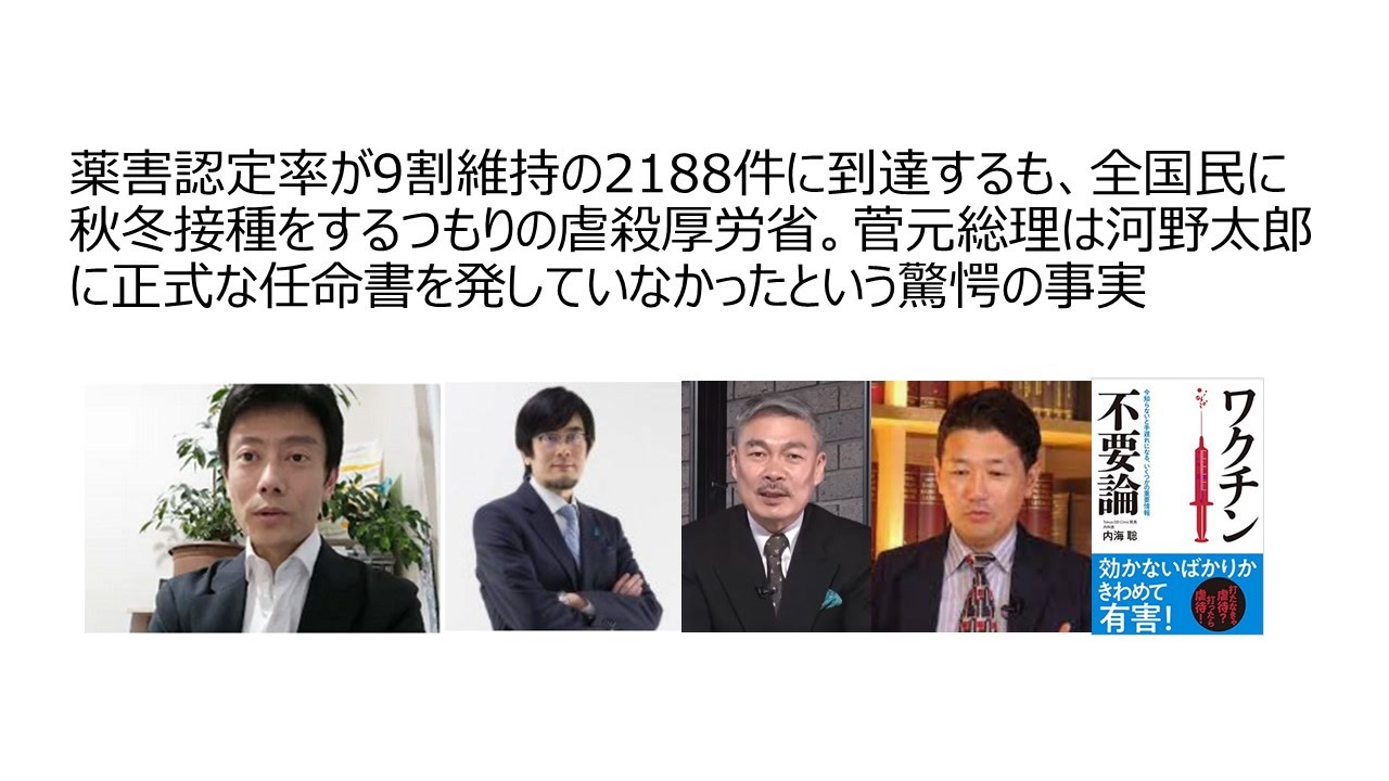 【特別鼎談】次の総理大臣候補NO1.河野太郎|この人、マジで危険です、、、|絶対に総理にしてはならない3つの理由<br><strong>室伏先生が河野太郎にはワクチン担当大臣の正式な任命書がないことを明言 27分過ぎ</strong><br><a href="https://www.youtube.com/watch?v=EqYoSS65yUk" target="_blank" rel="noopener nofollow">https://www.youtube.com/watch?v=EqYoSS65yUk</a><br><br>2021年1月18日、当時内閣総理大臣の菅義偉が行政改革担当大臣の河野太郎に新型コロナウイルス感染症のワクチン接種を円滑に推進するため、行政各部の所管する事務の調整の担当を指示した[6]。 <br>河野太郎に対しては、国務大臣として「ワクチン接種に向けた総合調整の担当」を命じる等の発令は官報に掲載されておらず、この人事は辞令を用いたものではなく口頭での指示によるものであった。同様の口頭による指示は、新型インフルエンザ等対策特別措置法に関する事務の担当を指示されていた経済再生担当大臣の西村康稔の場合も同様であることから[7]、新型コロナウイルスワクチン接種推進担当についても同様であると考えられる。<br>2022年4月1日の第2次岸田内閣においては内閣官房長官の松野博一が、辞令による担当として命じられた。<br><a href="https://ja.wikipedia.org/wiki/%E3%83%AF%E3%82%AF%E3%83%81%E3%83%B3%E6%8E%A5%E7%A8%AE%E6%8E%A8%E9%80%B2%E6%8B%85%E5%BD%93%E5%A4%A7%E8%87%A3" target="_blank" rel="noopener nofollow">https://ja.wikipedia.org/wiki/%E3%83%AF%E3%82%AF%E3%83%81%E3%83%B3%E6%8E%A5%E7%A8%AE%E6%8E%A8%E9%80%B2%E6%8B%85%E5%BD%93%E5%A4%A7%E8%87%A3</a><br><br><br>運び屋は正式に任命されていないから法的な責任がなく、言いたい方だい嘘を言っていた。<br>しかし、内閣を構成している人間が嘘をつくことは、行政府の最高機関の長として法的に問題があると思います。政治家として失格ですし、人間としても失格です。それを総理大臣候補として持ち上げる自民党は終わっています。北斗の拳的にいうと「自民党、おまえはもう死んでいる」です。<br><br>約9割の薬害認定率を維持している劇薬コロナワクチン生物兵器。4か月前から薬害認定が約千件増えました。審査待ちが約600件増えて、4600件です。<br>救済制度が機能していないのは明らかです。人体実験接種して副作用でたら救済されますとワクチンチケット死の手紙に書いてますが嘘ですよね。これでは。<br>前も言いましたが、ハゲを治せない西洋医学<br><br>日本国独立宣言論 私は独立を宣言する! 真田信秋<br><a href="https://amzn.to/3D90lwx" target="_blank" rel="noopener nofollow">https://amzn.to/3D90lwx</a><br> <br>主権者命令書 主権破壊を許すな 売国傀儡日本政府を解体せよ<br><a href="https://amzn.to/49z51b5" target="_blank" rel="noopener nofollow">https://amzn.to/49z51b5</a>