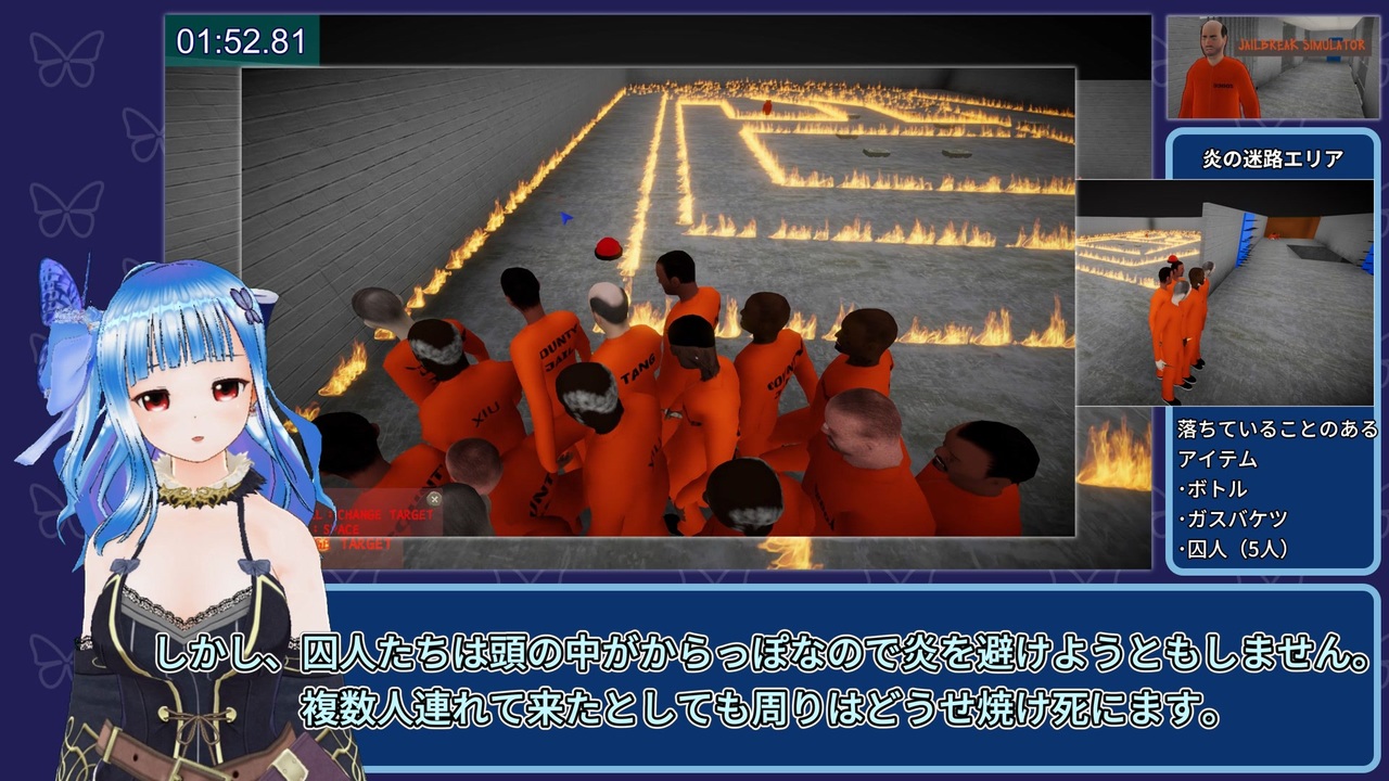 ガバガバどころかスカスカ♡刑務所の末路♡<br><br><strong><u>レギュレーション<br>ステージ:レベル1、難易度Easy<br>計測区間:キャラクターを操作可能になった瞬間~OPENDOOR押下まで</u></strong><br><br>ゲーム正式名:Jailbreak Simulator<br><br>タイマー付けただけ版→<a href="https://youtu.be/6k0RAacAz2s" target="_blank" rel="noopener nofollow">https://youtu.be/6k0RAacAz2s</a><br><br>味噌人ノ命様が作ってくださったあみぐるみ<br>→<a href="https://twitter.com/miso_mikoto/status/1647454568723415045?s=20" target="_blank" rel="noopener nofollow">https://twitter.com/miso_mikoto/status/1647454568723415045?s=20</a><br><br>前→<a href="https://www.nicovideo.jp/watch/sm42090881" class="watch">sm42090881</a><br>次→<a href="https://www.nicovideo.jp/watch/sm42165405" class="watch">sm42165405</a><br>RTAマイリス→<a href="https://www.nicovideo.jp/mylist/74656323" target="_blank" rel="noopener">mylist/74656323</a><br><br>コメント返しのところ:世界のアソビ大全51 テキサスポーカー<br>一緒に遊んだひと→にんどうちゃん:<a href="https://www.nicovideo.jp/user/7022520" target="_blank" rel="noopener">user/7022520</a><br>一緒に遊んだヒットアンドブロー→<a href="https://www.nicovideo.jp/watch/sm42071380" class="watch">sm42071380</a><br><br><u>使用させていただいた素材・ソフト等</u><br>AviUtl<br>A.I.VOICE 琴葉葵<br>VOICEVOX WhiteCULほか<br>COEIROINK リリンちゃんほか<br>COM3D2(VAS使用)<br><br>その他お借りした素材はコンテンツツリーをご覧ください。<br /><br>ついった(旧Twitter):<a href="https://twitter.com/tsubame_sizimi" target="_blank" rel="noopener nofollow">https://twitter.com/tsubame_sizimi</a><br><br><a target="_blank" href="https://qa.nicovideo.jp/faq/show/19424?site_domain=default" style="font-size: 13px;color: #657586; text-decoration: underline; line-height: 1.4">この動画は投稿者によって修正されました</a>