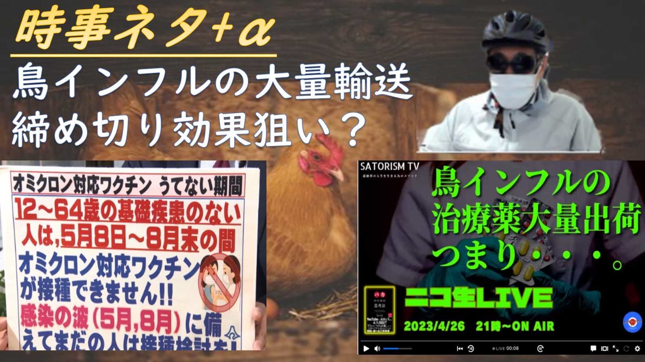 リチャード・コシミズ動画<br>日本人は世界で唯一ワクチン後遺症から生還する<br><a href="https://live.nicovideo.jp/watch/lv341121731?status=closed&ref=follow" target="_blank" rel="noopener nofollow">https://live.nicovideo.jp/watch/lv341121731?status=closed&ref=follow</a><br><br>■ダディのサバイバル研究所<br>なぜ全てをさらけ出したのか? 2023年4月26日知っといてニュース<br><a href="https://www.youtube.com/watch?v=GIv7dQjKicQ" target="_blank" rel="noopener nofollow">https://www.youtube.com/watch?v=GIv7dQjKicQ</a><br><br><br>ビッグデータが示す昨年後半から続く超過死亡の要因<br><a href="https://onl.bz/L216Pdd" target="_blank" rel="noopener nofollow">https://onl.bz/L216Pdd</a><br><br><br><br>5月8日から“コロナワクチン”打てなくなる? オミクロン対応「GW前に検討を」ー静岡県<br><a href="https://onl.bz/tR4KXrn" target="_blank" rel="noopener nofollow">https://onl.bz/tR4KXrn</a><br><br><br>【速報】養鶏場で火事 ニワトリ15万羽焼け死ぬ 茨城<br><a href="https://onl.bz/G8uqb85" target="_blank" rel="noopener nofollow">https://onl.bz/G8uqb85</a><br><br>--------コメント------------<br><br>煙草は本来、薬草である<br><br>理系出身です。科(化)学者は真実のしもべとなれ と教育されました。仮説を立てて実験してもその通りにならない時、真実を中心に据えてアプローチし続けろと。<br><br>ダイソーのサポーターですが今度ワークマンに行ってみようかな<br><br>モンベルの腹巻きが良いですよ。<br><br>どちらも有害なので両方アクセル<br><br>あの人の動画はよく見るけどまったく信用してない(鹿先生?)<br><br>鹿先生のアクセルとブレーキの話は忘れられません。非常に分かりやすく、鹿先生にもごんべえさんにも感謝しております□♀️<br><br>スワイショウで体を鍛えましょう<br><br>最新型の毒チン作らないね。BA5とっくにないよ。<br><br>CM流れてきたら ふざけるな!といつも呟く<br><br>薬の宣伝は市販の薬か会社名そのものくらいしかできなかったと思う。医者に処方してもらう薬は公共の電波で宣伝できなかったと思う。<br><br>私は検討すること無く打ちません、ごめんなさい<br><br>電車でもCMやってて度肝抜かれた<br><br>モデルナ殺人工場を日本から追い出さないと!ころされる!<br><br>あれごんべえさん ヘルメットは<br><br>感染の拡大を防ぐ効果が無いと判った今、打たなかった人に対するGO TO TRAVELをしないと不公平だろ!<br><br>パン屋で追い出されるてあり得ないですね<br><br>原口議員は3回打ってるのでワクチンで悪性リンパ腫だろう<br><br>コロコロ政党渡り歩く人、信念よりも当選確率重視<br><br>