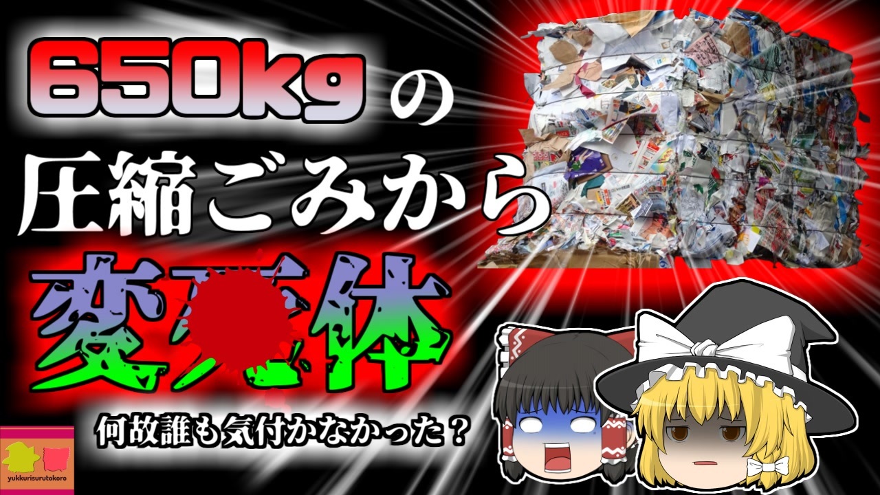 <a href="#" class="seekTime" data-seekTime="00:00" onclick="seekNicoPlayer('#00:00'); return false;">#00:00</a> 冒頭挨拶<br><a href="#" class="seekTime" data-seekTime="00:19" onclick="seekNicoPlayer('#00:19'); return false;">#00:19</a> リサイクルセンター<br><a href="#" class="seekTime" data-seekTime="1:01" onclick="seekNicoPlayer('#1:01'); return false;">#1:01</a> 視聴上の注意<br><a href="#" class="seekTime" data-seekTime="1:39" onclick="seekNicoPlayer('#1:39'); return false;">#1:39</a> 本編開始<br><a href="#" class="seekTime" data-seekTime="2:23" onclick="seekNicoPlayer('#2:23'); return false;">#2:23</a> 行方不明になっていた男性<br><a href="#" class="seekTime" data-seekTime="3:35" onclick="seekNicoPlayer('#3:35'); return false;">#3:35</a> 発見<br><a href="#" class="seekTime" data-seekTime="4:07" onclick="seekNicoPlayer('#4:07'); return false;">#4:07</a> 偶然通りかかっていた経営者の行動<br><a href="#" class="seekTime" data-seekTime="4:44" onclick="seekNicoPlayer('#4:44'); return false;">#4:44</a> はい作業中にブロックが転倒<br><a href="#" class="seekTime" data-seekTime="5:31" onclick="seekNicoPlayer('#5:31'); return false;">#5:31</a> 気が付かなかった要因の数々<br><a href="#" class="seekTime" data-seekTime="6:38" onclick="seekNicoPlayer('#6:38'); return false;">#6:38</a> 原因、その他の要因と背景<br><a href="#" class="seekTime" data-seekTime="7:45" onclick="seekNicoPlayer('#7:45'); return false;">#7:45</a> 必要だった対策<br><br><br>今回紹介するのは、以前リクエストがあった、リサイクルセンターでの事例です。<br>この工場では、様々な資源ごみを回収し、再分別して別のリサイクル事業者へと送り出す事業を行っていました。<br>最も多く扱っていたのが古紙でしたが、ある日の夕方、この圧縮された古紙のブロックの下から、行く不明になっていた作業員「Aさん」が、原形をとどめない、変わり果てた姿で発見されました。<br>彼はすでに亡くなってから、少なくとも1時間以上は経過しているとみられ、原因の調査が行われました。<br>この古紙ブロックは、数万枚の古紙を特殊な機械で圧縮、結束されたもので、約650kg以上の重量のある、非常に大きなものでした。<br>ブロックは事業所内の倉庫に積み上げて保管されていましたが、彼はこの積み上げられたブロックの下敷きになった状態で見つかっており、当初は全くと言っていいほど、原因がわかりませんでした。<br><br>しかし、調査を進めると、この事業所の安全に対する意識の低さなどが露呈し、恐ろしい事実が明らかになっていきます。<br><br>引用・出展・参考文献<br>国立研究開発法人 科学技術振興機構<br>ハインリッヒの法則<br><a href="https://ishort.ink/hs63" target="_blank" rel="noopener nofollow">https://ishort.ink/hs63</a><br>ハインリッヒの法則(1:29:300の法則)[安全衛生キーワード]厚生労働省<br><a href="https://ishort.ink/emNT" target="_blank" rel="noopener nofollow">https://ishort.ink/emNT</a><br>厚生労働省「はい作業主任者を選任していますか?」福井労働局<br><a href="https://ishort.ink/CSYc" target="_blank" rel="noopener nofollow">https://ishort.ink/CSYc</a><br><br><br />※この動画は過去の事件を知り、現在でも同じことが発生する危険性を再認識、関与しないように促すための動画であり、視聴者を扇動、動揺を誘うためのコンテンツではありません。<br><br>ご要望にお応えして、メンバーシップの開設を行いました。<br>下記URLからも登録可能ですので、ご興味がある方は是非ご参加ください。<br><a href="https://www.youtube.com/channel/UCcT5a1J7XJW7CLYI2RKl4pw/join" target="_blank" rel="noopener nofollow">https://www.youtube.com/channel/UCcT5a1J7XJW7CLYI2RKl4pw/join</a><br><br><br>Twitter<br>→<a href="https://twitter.com/yukkurisurutoko" target="_blank" rel="noopener nofollow">https://twitter.com/yukkurisurutoko</a><br><br>取り急ぎ、簡易的にですがマイリストを作りました。<br>【ゆっくり解説】事故・事件関係紹介リスト <br><a href="https://www.nicovideo.jp/mylist/71034319" target="_blank" rel="noopener nofollow">https://www.nicovideo.jp/mylist/71034319</a><br>【ゆっくり解説】放射線系事故<br><a href="https://www.nicovideo.jp/mylist/71034368" target="_blank" rel="noopener nofollow">https://www.nicovideo.jp/mylist/71034368</a><br>【ゆっくり解説】鉄道系事故・事件関連<br><a href="https://www.nicovideo.jp/mylist/71034379" target="_blank" rel="noopener nofollow">https://www.nicovideo.jp/mylist/71034379</a>