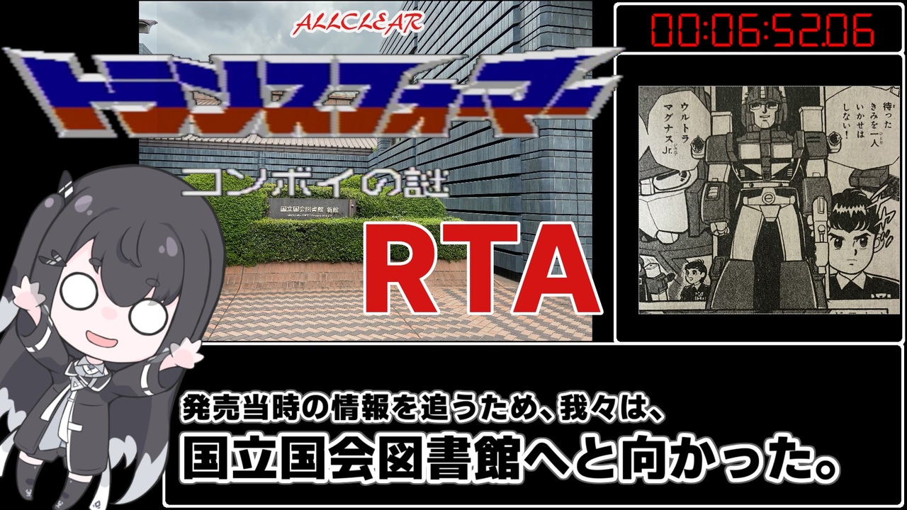 国会図書館へ行ってきました。<br>今回は調査結果の報告の方がメインです。<br>コンボイの謎やクソゲー、ファミコンゲームについて特集された雑誌記事や古いホームページ(だいたい2010年くらいまで)をご存じの方がいれば、ぜひコメントを残してください。<br>どんな情報でも、うろ覚えでも構いません。<br><br>あ、一応RTA動画です。<br><br>カテゴリ:1周目RODIMUSコンプリート、メガトロン出現、ワープなし。<br> 2周目滅んだ。<br>連射機なし。<br><br>無編集動画:<br> <br>完全攻略動画:<a href="https://www.nicovideo.jp/watch/sm41549759" class="watch">sm41549759</a><br><br>怪現象集:<a href="https://www.nicovideo.jp/watch/sm41545650" class="watch">sm41545650</a><br><br>ボイスはCoeFontミリアルさんとアリアルさんを使用させて頂きました。<br>Voiced by <a href="https://CoeFont.cloud" target="_blank" rel="noopener nofollow">https://CoeFont.cloud</a><br><br>立ち絵:梓音しのん様<br>ちんまいアリミリ姉妹立ち絵<br><a href="https://seiga.nicovideo.jp/seiga/im11025058" target="_blank" rel="noopener nofollow">https://seiga.nicovideo.jp/seiga/im11025058</a>