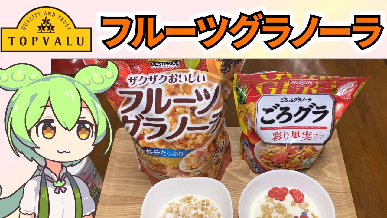 沢山購入してしまった牛乳を消化する為に<br>フルーツグラノーラを購入しました<br><br>【参考】<br>ザクザクおいしいフルーツグラノーラ<br><a href="https://www.topvalu.net/items/detail/4549741436908/" target="_blank" rel="noopener nofollow">https://www.topvalu.net/items/detail/4549741436908/</a><br>北海道牛乳<br><a href="https://www.topvalu.net/items/detail/4901810124213/" target="_blank" rel="noopener nofollow">https://www.topvalu.net/items/detail/4901810124213/</a><br><br>【使用した素材】(※敬称略)<br>(合成音声)VOICEVOX/ずんだもん/四国めたん<br><a href="https://voicevox.hiroshiba.jp/" target="_blank" rel="noopener nofollow">https://voicevox.hiroshiba.jp/</a><br>(立ち絵)坂本アヒル<br><a href="https://seiga.nicovideo.jp/seiga/im10788496" target="_blank" rel="noopener">im10788496</a>/<a href="https://seiga.nicovideo.jp/seiga/im10791276" target="_blank" rel="noopener">im10791276</a><br>(楽曲)甘茶の音楽工房/「楽しい麦畑」「フルーツパフェ」「お城の舞踏会」<br><a href="https://amachamusic.chagasi.com" target="_blank" rel="noopener nofollow">https://amachamusic.chagasi.com</a><br><br>【関連動画】<br>トップバリュの赤や黄色の牛乳を飲み比べ<br><a href="https://www.youtube.com/watch?v=9dq-eKxWEEk&ab_channel=maryu4492" target="_blank" rel="noopener nofollow">https://www.youtube.com/watch?v=9dq-eKxWEEk&ab_channel=maryu4492</a>