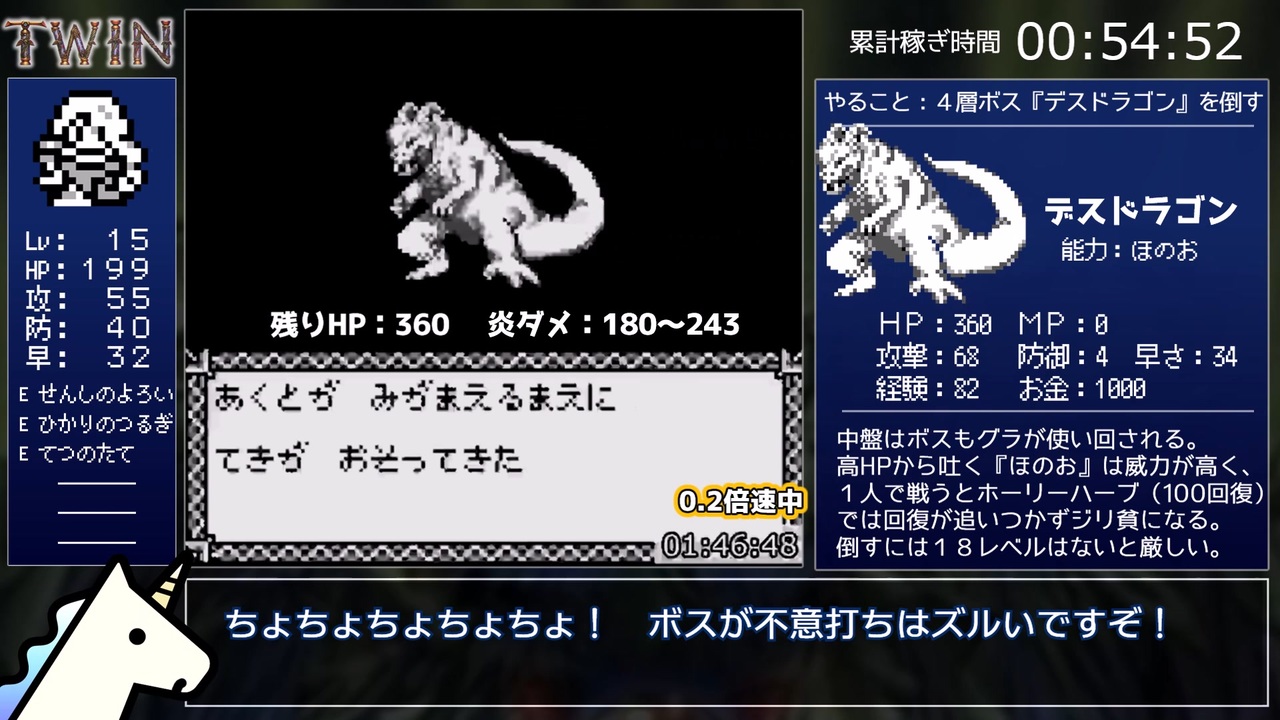 1992年発売、アテナ制作のゲームボーイのRPG『 TWIN(ツイン) 』RTAのパート3です。<br>プリンターをついに買いかえた(ブラザーのモノクロレーザー)ので初投稿です。<br><br>part.2→<a href="https://www.nicovideo.jp/watch/sm42096400" class="watch">sm42096400</a><br>part.4→<a href="https://www.nicovideo.jp/watch/sm42229514" class="watch">sm42229514</a>(5/17(水) 21:00公開)<br><br>走ったRTAのpart.1まとめ→<a href="https://www.nicovideo.jp/mylist/73222388" target="_blank" rel="noopener">mylist/73222388</a><br>RTA全部まとめ→<a href="https://www.nicovideo.jp/mylist/72786007" target="_blank" rel="noopener">mylist/72786007</a><br><br><u>▽レギュレーション</u><br>タイマー開始:ネーム入力画面で職業を選択した瞬間<br>タイマー終了:デスタークに最後の一撃を与えたテキストが表示されきった瞬間<br><br>その他のルール<br>・4つの『しるし』を集めて『もんしょう』を手に入れてクリアする<br>・エミュレータのリセット機能の使用可<br><br>*エミュレータを使用しています。リセット前にマウスポインタが写りこみます。<br><br>・お世話になった攻略サイト様『ゲームの里』<br>→<a href="http://gesato.com/gb/twin/top.html" target="_blank" rel="noopener nofollow">http://gesato.com/gb/twin/top.html</a><br><br>・今までの調査結果や攻略法をまとめた個人wiki(矛盾)を作りました<br><a href="https://w.atwiki.jp/nagisa381rta/" target="_blank" rel="noopener nofollow">https://w.atwiki.jp/nagisa381rta/</a><br><br>・Youtubeでも活動しているのでチャンネル登録よろしくです<br>→<a href="https://www.youtube.com/channel/UCTNItIdl_gYr9N2j0PO-82g" target="_blank" rel="noopener nofollow">https://www.youtube.com/channel/UCTNItIdl_gYr9N2j0PO-82g</a><br><br>・欲しいものリスト<br>→<a href="https://www.amazon.jp/hz/wishlist/ls/1S72L30BVRILK?ref_=wl_share" target="_blank" rel="noopener nofollow">https://www.amazon.jp/hz/wishlist/ls/1S72L30BVRILK?ref_=wl_share</a><br><br><br><a target="_blank" href="https://qa.nicovideo.jp/faq/show/19424?site_domain=default" style="font-size: 13px;color: #657586; text-decoration: underline; line-height: 1.4">この動画は投稿者によって修正されました</a>