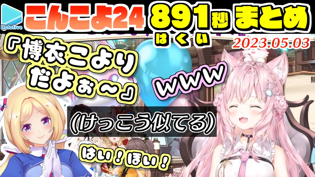 <a href="#" class="seekTime" data-seekTime="00:00" onclick="seekNicoPlayer('#00:00'); return false;">#00:00</a> 1枠目 格付け調査(おかゆ・ころね)<br><a href="#" class="seekTime" data-seekTime="01:17" onclick="seekNicoPlayer('#01:17'); return false;">#01:17</a> 1枠目 ホロライブ企画者対談(みこ・ミオ・スバル)<br><a href="#" class="seekTime" data-seekTime="01:47" onclick="seekNicoPlayer('#01:47'); return false;">#01:47</a> 2枠目 ホロライブ学力テスト(メル・シオン・ぺこら・トワ・ねね)<br><a href="#" class="seekTime" data-seekTime="03:26" onclick="seekNicoPlayer('#03:26'); return false;">#03:26</a> 2枠目 深夜のゆる凸待ち(そら)<br><a href="#" class="seekTime" data-seekTime="04:13" onclick="seekNicoPlayer('#04:13'); return false;">#04:13</a> 2枠目 デュエットカラオケ(ベールズ)<br><a href="#" class="seekTime" data-seekTime="04:56" onclick="seekNicoPlayer('#04:56'); return false;">#04:56</a> 2枠目 ENと遊ぼうアソビ大全(ムメイ)<br><a href="#" class="seekTime" data-seekTime="05:36" onclick="seekNicoPlayer('#05:36'); return false;">#05:36</a> 3枠目 寝起き凸(ミオ・ノエル・ちょこ・まつり)<br><a href="#" class="seekTime" data-seekTime="06:59" onclick="seekNicoPlayer('#06:59'); return false;">#06:59</a> 3枠目 こんこよ声マネ選手権<br><a href="#" class="seekTime" data-seekTime="09:03" onclick="seekNicoPlayer('#09:03'); return false;">#09:03</a> 3枠目 こより'sキッチン<br><a href="#" class="seekTime" data-seekTime="09:49" onclick="seekNicoPlayer('#09:49'); return false;">#09:49</a> 4枠目 ディスコードショッキング(電脳少女シロ)<br><a href="#" class="seekTime" data-seekTime="10:31" onclick="seekNicoPlayer('#10:31'); return false;">#10:31</a> 4枠目 お題人狼(ノエル・マリン・かなた・ルーナ・ぼたん)<br><a href="#" class="seekTime" data-seekTime="11:55" onclick="seekNicoPlayer('#11:55'); return false;">#11:55</a> 4枠目 PON大賞(ロボ子・フブキ・ラミィ)<br><a href="#" class="seekTime" data-seekTime="12:50" onclick="seekNicoPlayer('#12:50'); return false;">#12:50</a> 4枠目 終われまてん(そら・すいせい・スバル・ポルカ・クロヱ)<br><a href="#" class="seekTime" data-seekTime="14:00" onclick="seekNicoPlayer('#14:00'); return false;">#14:00</a> 4枠目 閉会式<br><br>元動画様はこちら<br>【 #こんこよ24 】GWだよ!24時間配信1枠目!~開会式・格付け・企画者対談~【博衣こより/ホロライブ】<br><a href="https://youtu.be/4kZ-hciwBC8" target="_blank" rel="noopener nofollow">https://youtu.be/4kZ-hciwBC8</a><br><br>【 #こんこよ24 】GWだよ!24時間配信2枠目!~ミリしら・学力テスト・ぶっちゃけholoX・深夜ゆる凸待ち・デュエットカラオケ・ENと遊ぼう!~【博衣こより/ホロライブ】<br><a href="https://youtu.be/7M5mVyKMlp0" target="_blank" rel="noopener nofollow">https://youtu.be/7M5mVyKMlp0</a><br><br>【 #こんこよ24 】GWだよ!24時間配信3枠目!~朝ミオ&朝こよ寝起き凸・???・こより'sキッチン~【博衣こより/ホロライブ】<br><a href="https://youtu.be/qdblNPhGs3Q" target="_blank" rel="noopener nofollow">https://youtu.be/qdblNPhGs3Q</a><br><br>【 #こんこよ24 】GWだよ!24時間配信4枠目!~ディスコードショッキング・お題人狼・PON大賞・一致するまで終われまてん!・閉会式~【博衣こより/ホロライブ】<br><a href="https://youtu.be/nkzW3MlewHM" target="_blank" rel="noopener nofollow">https://youtu.be/nkzW3MlewHM</a><br><br>【VRバイオ7】3DでVRバイオに初挑戦 ほぼノーカット版プレミア公開【博衣こより/ホロライブ】<br><a href="https://youtu.be/nAiGkHsPmak?t=3220" target="_blank" rel="noopener nofollow">https://youtu.be/nAiGkHsPmak?t=3220</a><br><br>【オリジナル曲】史上最大のQUESTION! - 博衣こより【フルMV】<br><a href="https://youtu.be/xCFu0P7GTWw" target="_blank" rel="noopener nofollow">https://youtu.be/xCFu0P7GTWw</a><br><br>Koyori ch. 博衣こより - holoX - <a href="https://t.co/U4G9NUjWs5" target="_blank" rel="noopener nofollow">https://t.co/U4G9NUjWs5</a><br /><span style="color: #b7b7b7; font-size: 10px;">ホロライブ切り抜き/なめたけ <a href="https://t.co/CBwJLnYR2c" target="_blank" rel="noopener nofollow">https://t.co/CBwJLnYR2c</a></span>