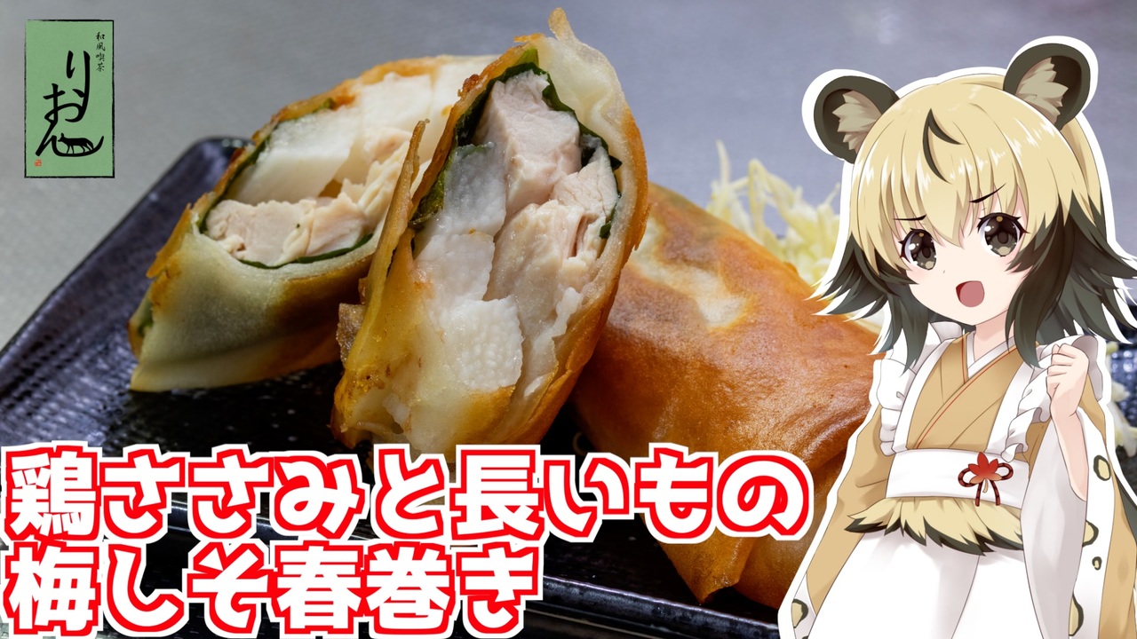今回は、「鶏ささみと長いもの梅しそ春巻き」を作っていきましょう。<br><br>揚げ物といえば、ちょっと罪悪感があるかもですが、<br>今回は鶏ささみ、そして長芋と梅を使ったヘルシーで、<br>疲労回復にもピッタリな、満足できる和風の春巻きです。<br><br>フライパンで揚げ焼きでもできますし、<br>もっとヘルシーにするなら、軽く表面に油を垂らして、<br>オーブンやトースターでパリパリになるまで焼くでもOKですよ。<br><br>梅干しの酸味と塩味があるので、<br>ソースとかはなしに、そのまま食べれちゃいますよ。<br><br>■材料(10個分(春巻きの皮10枚入り))<br>・春巻きの皮 10枚<br>・鶏ささみ 250g<br>・長芋 150g<br>・梅干し 2個<br>・青じそ 10枚<br><br>水溶き小麦粉<br>・小麦粉 小さじ2<br>・水 大さじ1<br><br>■所要時間<br>作業時間:20分程度<br><br>youtube:<a href="https://youtu.be/1aVpfv0z7DM" target="_blank" rel="noopener nofollow">https://youtu.be/1aVpfv0z7DM</a><br>twitter:@lycaon_kitchen<br><br>りおんの和風喫茶:<a href="https://www.nicovideo.jp/series/77190" target="_blank" rel="noopener">series/77190</a><br>おつかれごはん:<a href="https://www.nicovideo.jp/series/155690" target="_blank" rel="noopener">series/155690</a><br>手作り和菓子でちょっとひとやすみしませんか?:<a href="https://www.nicovideo.jp/series/155691" target="_blank" rel="noopener">series/155691</a><br><br>立ち絵:星華 彩二魔 様<br>イラスト:いらすとや、AWD kitchen<br>音源:DOVA-SYNDROME<br>音声:AI.VOICE 紲星あかり+ exVOICE