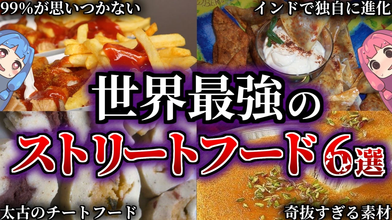 VOICEROIDの琴葉姉妹が世界のストリートフードについて解説する雑学動画です!<br>独特な起源や歴史、特徴、種類、作り方、おすすめの食べ方、驚きの味わいなどを紹介します。<br>今後も世界の独特な食べ物や料理を徹底解説する動画を発信していきますので、いいねをお願いします!<br>また、ご感想やご要望、投稿して欲しい食品や国のリクエストなどのコメントもお待ちしております。<br>皆さんからの反応は活動を続ける中ですごく励みになっています。いつもありがとうございます。<br>それでは、琴葉茜と琴葉葵と一緒に海外旅行気分に浸れるワールドグルメをゆっくり楽しんでください。<br><br>●youtubeチャンネル<br><a href="https://www.youtube.com/@kotonoha-gourmet" target="_blank" rel="noopener nofollow">https://www.youtube.com/@kotonoha-gourmet</a><br><br>●ツイッター<br><a href="https://twitter.com/KotonohaGourmet" target="_blank" rel="noopener nofollow">https://twitter.com/KotonohaGourmet</a><br><br>●インスタグラム<br><a href="https://www.instagram.com/kotonoha_gourmet/" target="_blank" rel="noopener nofollow">https://www.instagram.com/kotonoha_gourmet/</a><br><br>●フェイスブック<br><a href="https://www.facebook.com/KotonohaGourmet/" target="_blank" rel="noopener nofollow">https://www.facebook.com/KotonohaGourmet/</a><br><br>●リクエストボックス<br><a href="https://marshmallow-qa.com/kotonohagourmet" target="_blank" rel="noopener nofollow">https://marshmallow-qa.com/kotonohagourmet</a><br><br>お借りした素材など<br>[立ち絵]<br>坂本アヒル様<br><br>[BGM・効果音・エフェクト等]<br>魔王魂様<br>甘茶の音楽工房様<br>効果音ラボ様<br>Pixabay様<br>動画AC様<br>ニコニ・コモンズ様<br><br>[音声合成ソフト]<br>A.I.VOICE 琴葉 茜・葵<br><br>▼マイリスト色々<br><a href="https://www.nicovideo.jp/user/35565901/mylist" target="_blank" rel="noopener nofollow">https://www.nicovideo.jp/user/35565901/mylist</a><br><br>▼シリーズ色々<br><a href="https://www.nicovideo.jp/user/35565901/series" target="_blank" rel="noopener nofollow">https://www.nicovideo.jp/user/35565901/series</a><br><br>▼関連動画<br>あまりにも斬新でアメリカンな伝統料理5選【VOICEROID解説】<br><a href="https://www.nicovideo.jp/watch/sm42110036" target="_blank" rel="noopener nofollow">https://www.nicovideo.jp/watch/sm42110036</a><br><br>▼前回<br>危険度MAX!世界最強の激辛料理5選【VOICEROID解説】<br><a href="https://youtu.be/pVuz3EBT0XI" target="_blank" rel="noopener nofollow">https://youtu.be/pVuz3EBT0XI</a><br><br>▼次回<br>優雅なだけじゃない。どこかぶっ飛んだフランス料理5選【VOICEROID解説】<br><a href="https://www.nicovideo.jp/watch/sm42238920" target="_blank" rel="noopener nofollow">https://www.nicovideo.jp/watch/sm42238920</a>
