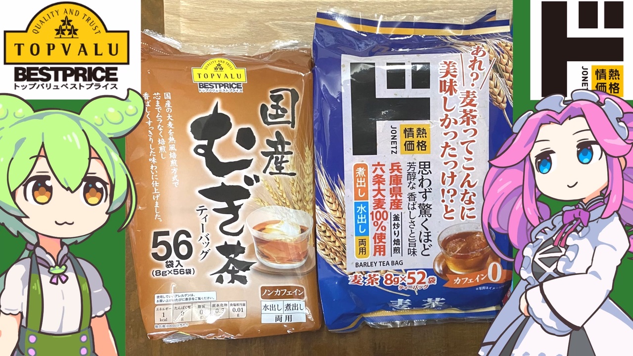 ドン・キホーテのプライベートブランド「情熱価格」の麦茶を飲んでいきます。<br>今回はトップバリュ(黄)と伊藤園の麦茶との比較になります。<br><br>【参考】<br>国産むぎ茶ティーバッグ(トップバリュ)<br><a href="https://www.topvalu.net/items/detail/4549741028424/" target="_blank" rel="noopener nofollow">https://www.topvalu.net/items/detail/4549741028424/</a><br>麦茶(ドンキホーテ)<br><a href="https://www.donki.com/j-kakaku/product/detail.php?item=3200" target="_blank" rel="noopener nofollow">https://www.donki.com/j-kakaku/product/detail.php?item=3200</a><br>香り薫るむぎ茶(伊藤園)<br><a href="https://www.itoen.jp/products/41447/" target="_blank" rel="noopener nofollow">https://www.itoen.jp/products/41447/</a><br>知っていますか?大麦の違いや特徴。(はくばく)<br><a href="https://www.hakubaku.co.jp/productspage/learnkokumotsu-trivia/" target="_blank" rel="noopener nofollow">https://www.hakubaku.co.jp/productspage/learnkokumotsu-trivia/</a><br>二条大麦と六条大麦の違いはなんですか。用途が違うのですか。(農林水産省)<br><a href="https://www.maff.go.jp/j/heya/sodan/1109/01.html" target="_blank" rel="noopener nofollow">https://www.maff.go.jp/j/heya/sodan/1109/01.html</a><br>みりんの効果はたくさん!どのように使えば料理はよりおいしくなる?(日の出みりん)<br><a href="https://hinode-mirin.co.jp/column/mirin-column/2022/8837/" target="_blank" rel="noopener nofollow">https://hinode-mirin.co.jp/column/mirin-column/2022/8837/</a><br><br>【使用した素材】(※敬称略)<br>(合成音声)VOICEVOX/ずんだもん/四国めたん<br><a href="https://voicevox.hiroshiba.jp/" target="_blank" rel="noopener nofollow">https://voicevox.hiroshiba.jp/</a><br>(立ち絵)坂本アヒル<br><a href="https://seiga.nicovideo.jp/seiga/im10788496" target="_blank" rel="noopener">im10788496</a>/<a href="https://seiga.nicovideo.jp/seiga/im10791276" target="_blank" rel="noopener">im10791276</a><br>(楽曲)甘茶の音楽工房/「楽しい麦畑」「フルーツパフェ」「お城の舞踏会」「残業戦士」<br><a href="https://amachamusic.chagasi.com" target="_blank" rel="noopener nofollow">https://amachamusic.chagasi.com</a><br><br>【関連動画】<br>ドンキホーテの情熱価格とトップバリュの黄色いヤツ「ポテトチップス(サワークリーム味)」<br><a href="https://www.youtube.com/watch?v=Np5_F0K46a0&t=15s&ab_channel=maryu4492" target="_blank" rel="noopener nofollow">https://www.youtube.com/watch?v=Np5_F0K46a0&t=15s&ab_channel=maryu4492</a>