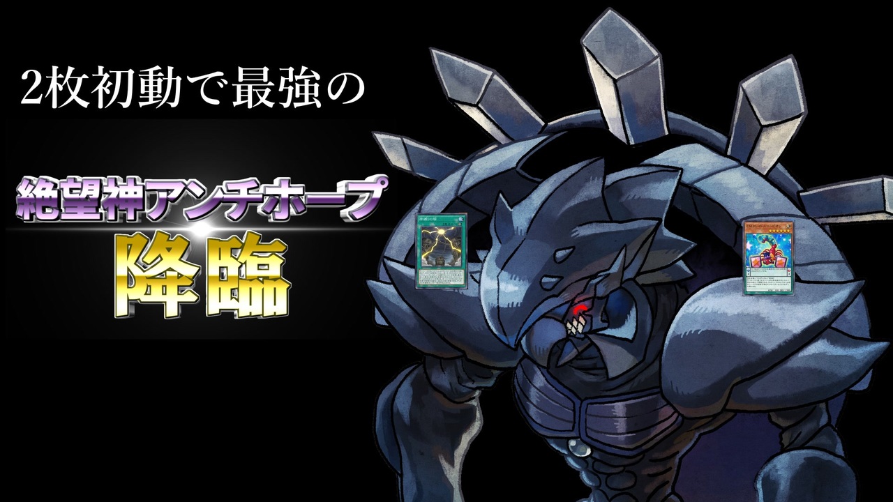 あまくだり兄貴リスペクトです。<br>2枚初動でできる絶望神アンチホープの<br>画期的治療ができたので動画を作りました。<br>youtube→<a href="https://www.youtube.com/watch?v=8Ru1OjucRkw" target="_blank" rel="noopener nofollow">https://www.youtube.com/watch?v=8Ru1OjucRkw</a><br>対戦相手のギミック・ブックス ラグナホープさんの謙虚な瓶治療動画→<a href="https://www.nicovideo.jp/watch/sm42179355" class="watch">sm42179355</a><br><br>使用素材<br>魔王魂:<a href="https://maou.audio/" target="_blank" rel="noopener nofollow">https://maou.audio/</a><br>BGMer:<a href="http://bgmer.net" target="_blank" rel="noopener nofollow">http://bgmer.net</a><br><br>アンチホープのイラストは橋日露光さんから<br><a href="https://twitter.com/camomile_357" target="_blank" rel="noopener nofollow">https://twitter.com/camomile_357</a><br><br><a target="_blank" href="https://qa.nicovideo.jp/faq/show/19424?site_domain=default" style="font-size: 13px;color: #657586; text-decoration: underline; line-height: 1.4">この動画は投稿者によって修正されました</a>