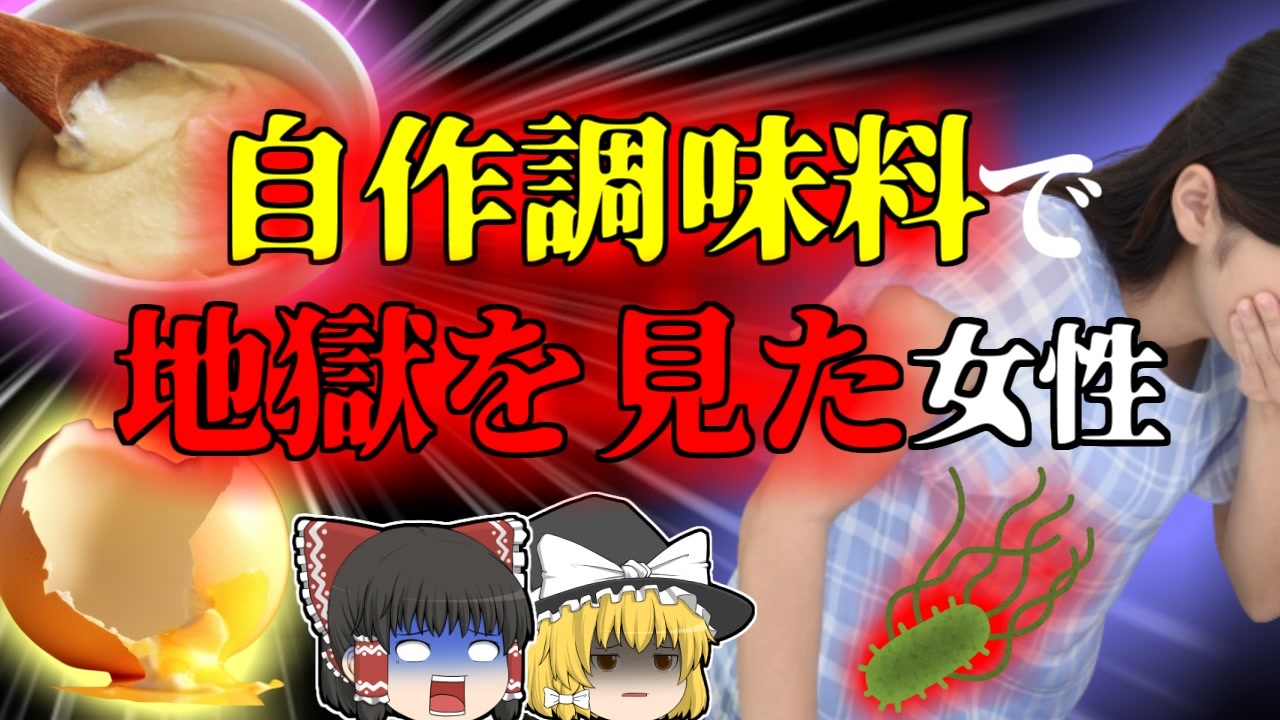今回紹介するのは、以前リクエストがありました、とある調味料での食中毒事例です。中部地方の某都市に暮らす女性「Aさん」は、就職のために新生活を開始したばかりでした。<br>彼女は以前から健康に気を使っており、最近知人から食品添加物のリスクなどの話を聞いていたため、新生活を開始するにあたり、調味料を自作してみることにしました。<br>その調味料は、マヨネーズ。<br>Aさんはスーパーで材料を購入し、早速マヨネーズ作りにとりかかりました。<br>マヨネーズは予想以上に簡単に完成し、Aさんはその味に満足しましたが、一度に大量に作ってしまったため、冬季の器に移し替え、ラップをして冷蔵保存していました。<br>このマヨネーズは一週間前後ほどで使い切りましたが、<br>最後のマヨネーズを使った、マカロニサラダを食べたところ、とてつもない腹痛と高熱、激しい吐き気に襲われ、彼女は意識もうろうとしながらも、病院で検査を受けました。<br>すると、彼女からは大量のサルモネラ菌が検出され、食中毒という診断が下されました。<br><br><a href="#" class="seekTime" data-seekTime="00:00" onclick="seekNicoPlayer('#00:00'); return false;">#00:00</a> 冒頭挨拶<br><a href="#" class="seekTime" data-seekTime="00:24" onclick="seekNicoPlayer('#00:24'); return false;">#00:24</a> 視聴上の注意<br><a href="#" class="seekTime" data-seekTime="1:00" onclick="seekNicoPlayer('#1:00'); return false;">#1:00</a> 本編開始<br><a href="#" class="seekTime" data-seekTime="1:55" onclick="seekNicoPlayer('#1:55'); return false;">#1:55</a> 自作マヨネーズに挑戦<br><a href="#" class="seekTime" data-seekTime="3:14" onclick="seekNicoPlayer('#3:14'); return false;">#3:14</a> 味に満足し保存<br><a href="#" class="seekTime" data-seekTime="3:49" onclick="seekNicoPlayer('#3:49'); return false;">#3:49</a> 異変<br><a href="#" class="seekTime" data-seekTime="4:14" onclick="seekNicoPlayer('#4:14'); return false;">#4:14</a> 地獄の苦しみ<br><a href="#" class="seekTime" data-seekTime="5:10" onclick="seekNicoPlayer('#5:10'); return false;">#5:10</a> 検査の結果<br><a href="#" class="seekTime" data-seekTime="5:45" onclick="seekNicoPlayer('#5:45'); return false;">#5:45</a> 「サルモネラ・エンテリティディス」<br><a href="#" class="seekTime" data-seekTime="6:35" onclick="seekNicoPlayer('#6:35'); return false;">#6:35</a> 卵<br><a href="#" class="seekTime" data-seekTime="7:13" onclick="seekNicoPlayer('#7:13'); return false;">#7:13</a> 現在は生で食べられるほど安全だったが…<br><a href="#" class="seekTime" data-seekTime="8:20" onclick="seekNicoPlayer('#8:20'); return false;">#8:20</a> 猛毒マカロニサラダだった<br><a href="#" class="seekTime" data-seekTime="8:43" onclick="seekNicoPlayer('#8:43'); return false;">#8:43</a> メーカー品と自作品の決定的違い<br><a href="#" class="seekTime" data-seekTime="10:18" onclick="seekNicoPlayer('#10:18'); return false;">#10:18</a> 基本的な予防法<br><br>引用・出展・参考文献<br>厚生労働省 家庭での食中毒予防<br><a href="https://ishort.ink/kKLm" target="_blank" rel="noopener nofollow">https://ishort.ink/kKLm</a><br>農林水産省 安全なたまごができるまで<br><a href="https://ishort.ink/FXC8" target="_blank" rel="noopener nofollow">https://ishort.ink/FXC8</a><br>あかね牧場 卵を生食できる日本<br><a href="https://ishort.ink/pGUv" target="_blank" rel="noopener nofollow">https://ishort.ink/pGUv</a><br>東京都福祉保健局 食品衛生の窓「サルモネラ・エンテリティディス」<br><a href="https://ishort.ink/cjSp" target="_blank" rel="noopener nofollow">https://ishort.ink/cjSp</a><br>公益社団法人 日本食品衛生協会 食中毒菌<br><a href="https://ishort.ink/zpFa" target="_blank" rel="noopener nofollow">https://ishort.ink/zpFa</a><br><br />※この動画は過去の事件を知り、現在でも同じことが発生する危険性を再認識、関与しないように促すための動画であり、視聴者を扇動、動揺を誘うためのコンテンツではありません。<br><br>ご要望にお応えして、メンバーシップの開設を行いました。<br>下記URLからも登録可能ですので、ご興味がある方は是非ご参加ください。<br><a href="https://www.youtube.com/channel/UCcT5a1J7XJW7CLYI2RKl4pw/join" target="_blank" rel="noopener nofollow">https://www.youtube.com/channel/UCcT5a1J7XJW7CLYI2RKl4pw/join</a><br><br><br>Twitter<br>→<a href="https://twitter.com/yukkurisurutoko" target="_blank" rel="noopener nofollow">https://twitter.com/yukkurisurutoko</a><br><br>取り急ぎ、簡易的にですがマイリストを作りました。<br>【ゆっくり解説】事故・事件関係紹介リスト <br><a href="https://www.nicovideo.jp/mylist/71034319" target="_blank" rel="noopener nofollow">https://www.nicovideo.jp/mylist/71034319</a><br>【ゆっくり解説】放射線系事故<br><a href="https://www.nicovideo.jp/mylist/71034368" target="_blank" rel="noopener nofollow">https://www.nicovideo.jp/mylist/71034368</a><br>【ゆっくり解説】鉄道系事故・事件関連<br><a href="https://www.nicovideo.jp/mylist/71034379" target="_blank" rel="noopener nofollow">https://www.nicovideo.jp/mylist/71034379</a>