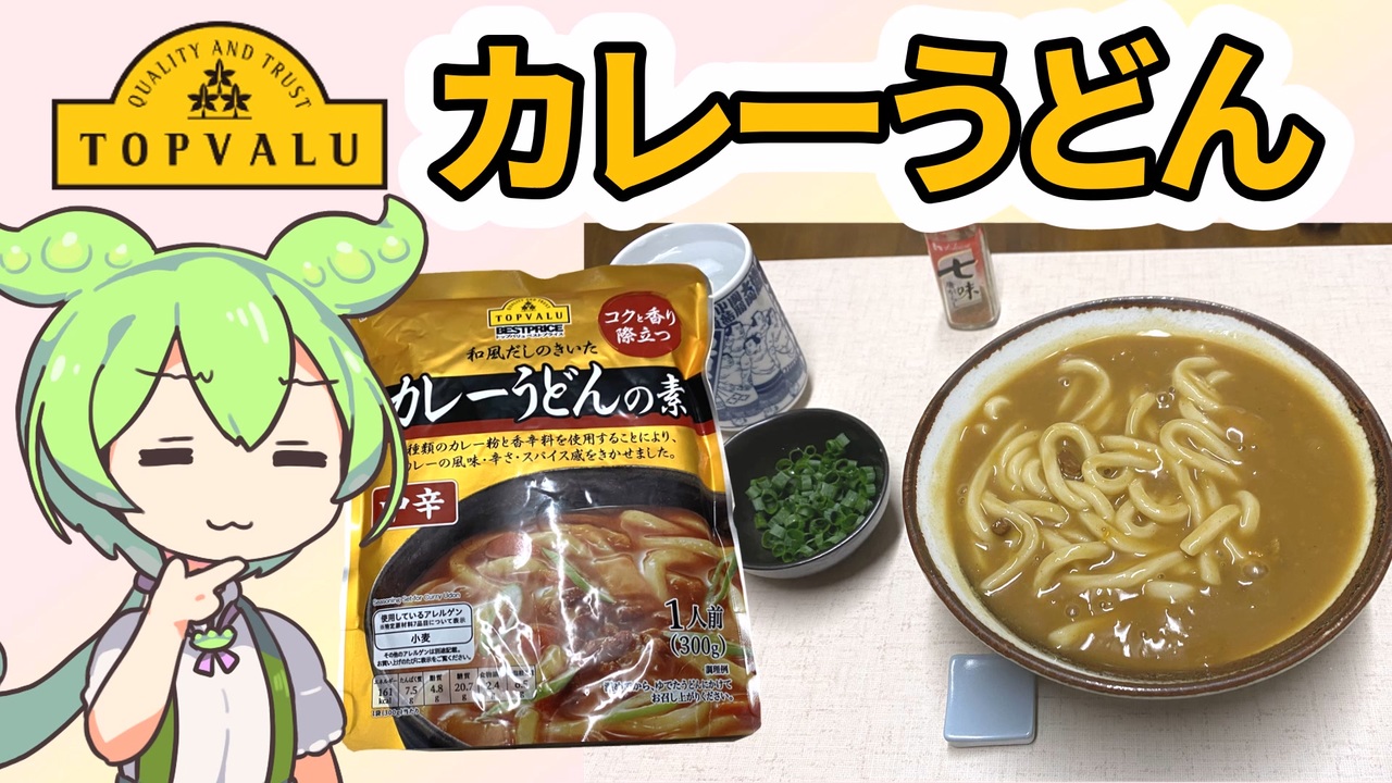 小腹が空いたときの為に買っておきました<br><br>【参考】<br>和風だしのきいたカレーうどんの素中辛<br><a href="https://www.topvalu.net/items/detail/4549414283020/" target="_blank" rel="noopener nofollow">https://www.topvalu.net/items/detail/4549414283020/</a><br>ヤマモリ株式会社<br><a href="https://www.yamamori.co.jp/" target="_blank" rel="noopener nofollow">https://www.yamamori.co.jp/</a><br><br>【参考】<br>【使用した素材】(※敬称略)<br>(合成音声)VOICEVOX/ずんだもん/四国めたん<br><a href="https://voicevox.hiroshiba.jp/" target="_blank" rel="noopener nofollow">https://voicevox.hiroshiba.jp/</a><br>(立ち絵)坂本アヒル<br><a href="https://seiga.nicovideo.jp/seiga/im10788496" target="_blank" rel="noopener">im10788496</a>/<a href="https://seiga.nicovideo.jp/seiga/im10791276" target="_blank" rel="noopener">im10791276</a><br>(楽曲)甘茶の音楽工房/「楽しい麦畑」「フルーツパフェ」「お城の舞踏会」<br><a href="https://amachamusic.chagasi.com" target="_blank" rel="noopener nofollow">https://amachamusic.chagasi.com</a><br><br>【関連動画】<br>セブンプレミアムとトップバリュの黄色いヤツの「麻婆豆腐の素」【トプバクッキング】<br><a href="https://www.youtube.com/watch?v=U7UO5e0AYFk&t=63s&ab_channel=maryu4492" target="_blank" rel="noopener nofollow">https://www.youtube.com/watch?v=U7UO5e0AYFk&t=63s&ab_channel=maryu4492</a>