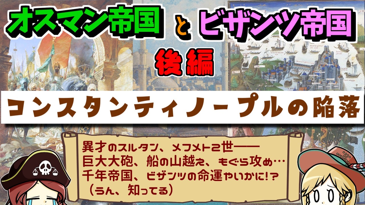 前編→<a href="https://www.nicovideo.jp/watch/sm41966395" class="watch">sm41966395</a><br>中編→<a href="https://www.nicovideo.jp/watch/sm42026314" class="watch">sm42026314</a><br>中編と後編の間→<a href="https://www.nicovideo.jp/watch/sm42093816" class="watch">sm42093816</a><br><br>微妙なバランスを保ちつつ共存?してきた両国。<br>しかし、これはもう隣国指導者ガチャで爆死…ということが起きてしまいます。<br><br>ビザンツ帝国ことローマ帝国の最期の瞬間が迫っていた━━<br><br><br>今回の参考文献<br>新井政美(2021)『オスマンvs.ヨーロッパ <トルコの脅威>とは何だったのか』講談社<br>ジョナサン・ハリス(2022)『ビザンツ帝国の最期』井上浩一訳 白水社<br>小笠弘幸(2020)『オスマン帝国 英傑列伝』幻冬舎<br>後藤明(2017)『イスラーム世界史』KADOKAWA<br><br>その他 Wikipediaなど<br><br>twitter | <a href="https://twitter.com/Yukkuri_mond" target="_blank" rel="noopener nofollow">https://twitter.com/Yukkuri_mond</a><br />━━━━━━━━━━━━━━━━━━━━━<br><br>この動画はクリエイティブ・コモンズ継承(CC-BY-SA)ライセンスの素材を使用して制作しています。(<a href="https://creativecommons.org/licenses/by-sa/4.0/)" target="_blank" rel="noopener nofollow">https://creativecommons.org/licenses/by-sa/4.0/)</a><br>規約に基づき、この動画もCC-BY-SA 4.0 のもとで公開します。<br><br>投稿者共通情報☆彡<br><br>BGM, SE:ニコニ・コモンズ様<br><a href="http://commons.nicovideo.jp/" target="_blank" rel="noopener nofollow">http://commons.nicovideo.jp/</a><br>魔王魂様<br><a href="https://maoudamashii.jokersounds.com/" target="_blank" rel="noopener nofollow">https://maoudamashii.jokersounds.com/</a><br>Audiostock様<br><a href="https://audiostock.jp/" target="_blank" rel="noopener nofollow">https://audiostock.jp/</a><br><br>立ち絵 霊夢・魔理沙(黒子式):nicotalk様<br><a href="http://www.nicotalk.com/charasozai.html" target="_blank" rel="noopener nofollow">http://www.nicotalk.com/charasozai.html</a><br><br>立ち絵 パトラ、マリー、アン、メアリ:ライフライフ様<br><a href="https://0801lifelife.tumblr.com/" target="_blank" rel="noopener nofollow">https://0801lifelife.tumblr.com/</a><br><br>使用ツール1:ゆっくりムービーメーカー4<br><a href="https://manjubox.net/ymm4/" target="_blank" rel="noopener nofollow">https://manjubox.net/ymm4/</a><br><br>使用ツール2:AviUtl<br><a href="http://spring-fragrance.mints.ne.jp/aviutl/" target="_blank" rel="noopener nofollow">http://spring-fragrance.mints.ne.jp/aviutl/</a><br><br>各時代の地図 : World History Maps & Timelines <br><a href="http://geacron.com/home-en/" target="_blank" rel="noopener nofollow">http://geacron.com/home-en/</a><br><br>ゆっくりボイスについて:AquesTalkライセンス取得済み<br><br>キャラクターボイス<br>アン・ボニー:羽ノ華(A.I.VOICE)<br>メアリ・リード:琴葉 葵(A.I.VOICE)<br>クレオパトラ:結月ゆかり(VOICEROID2)<br>マリー‐アントワネット:東北きりたん (VOICEROID EX)<br>その他キャラ:青山龍星(A.I.VOICE)、伊織弓鶴(A.I.VOICE2)、栗田まろん(A.I.VOICE)、宮舞モカ(VOICEPEAK)、フリモメン(VOICEPEAK)<br><br><br><br>その他フリー素材ご提供元の皆様に圧倒的感謝<br>