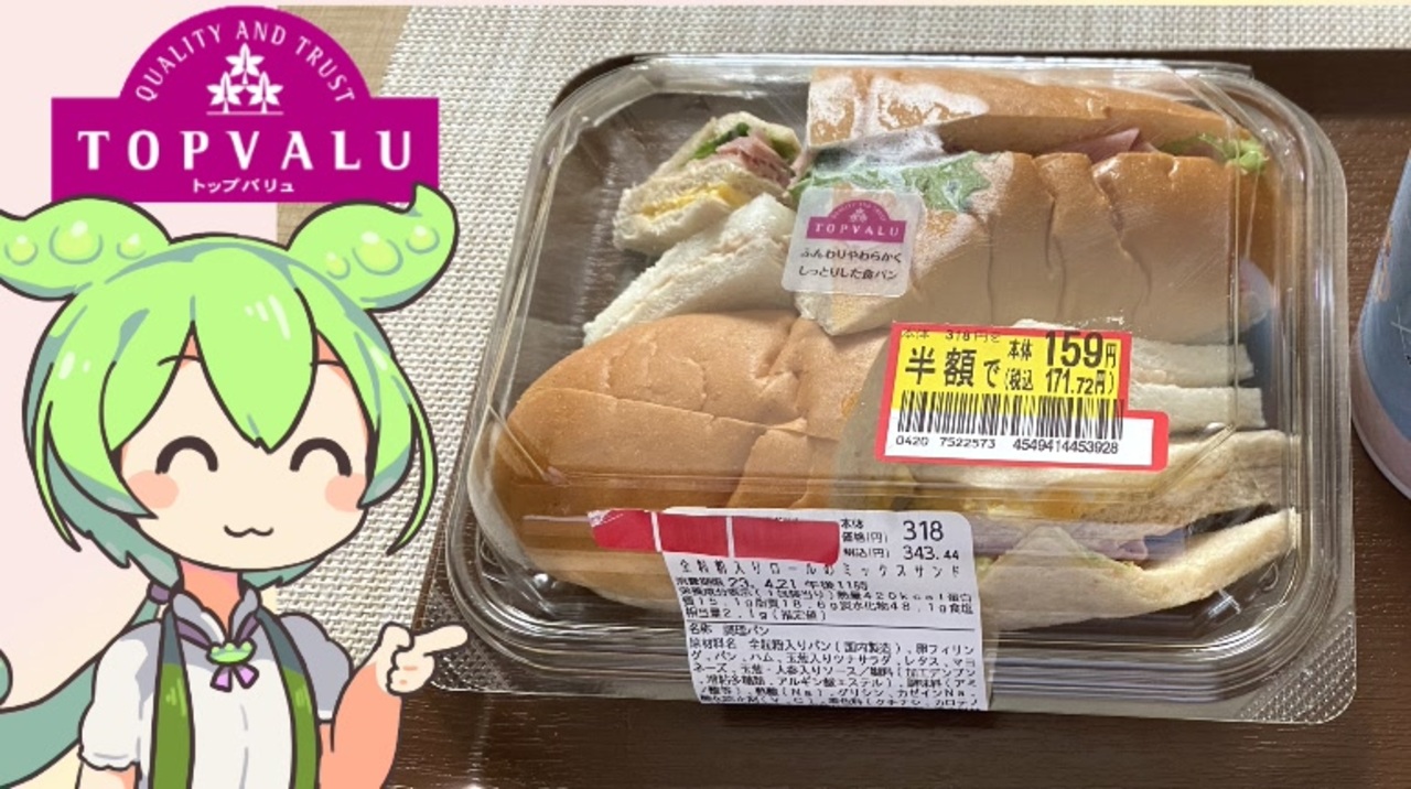 半額なので思わず買ってしまいました<br><br>【参考】<br>全粒粉入りロールのミックスサンド<br><a href="https://www.topvalu.net/items/detail/4549414453928/" target="_blank" rel="noopener nofollow">https://www.topvalu.net/items/detail/4549414453928/</a><br>株式会社サンデリカ<br><a href="http://www.sundelica.co.jp/" target="_blank" rel="noopener nofollow">http://www.sundelica.co.jp/</a><br><br>【使用した素材】(※敬称略)<br>(合成音声)VOICEVOX/ずんだもん/四国めたん<br><a href="https://voicevox.hiroshiba.jp/" target="_blank" rel="noopener nofollow">https://voicevox.hiroshiba.jp/</a><br>(立ち絵)坂本アヒル<br><a href="https://seiga.nicovideo.jp/seiga/im10788496" target="_blank" rel="noopener">im10788496</a>/<a href="https://seiga.nicovideo.jp/seiga/im10791276" target="_blank" rel="noopener">im10791276</a><br>(楽曲)甘茶の音楽工房/「楽しい麦畑」「フルーツパフェ」<br><a href="https://amachamusic.chagasi.com" target="_blank" rel="noopener nofollow">https://amachamusic.chagasi.com</a>