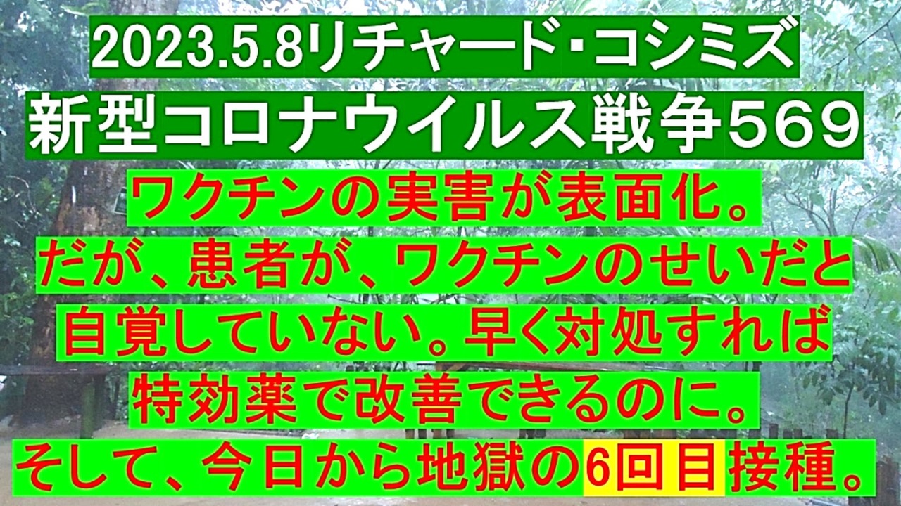 <span style="color: #cc4125;"><strong>「 テーマ : 新型コロナウイルス戦争 569 」</strong></span><br><br><span style="color: #ff0000;"><strong>「『 ワクチンの実害 』が『 表面化 』。だが、『 患者 』が、『 ワクチンのせいだ 』と『 自覚 』していな<br> い。早く『 対処 』すれば『 特効薬 』で『 改善 』できるのに。そして、『 今日 』から『 地獄 』の『 6<br> 回目接種 』」</strong></span><br><br><span style="color: #0000ff;"><strong>「『 イベルメクチン・アビガン・その他コロナ対策 』について、ご意見をお寄せ下さい! 」<br><br> ◐ E-mail:richardkoshimizu@gmail.com</strong></span><br><br><strong>◐「クリエイター・サポート」・「ニコニ広告」・「フォロー」等、ご協力の程宜しくお願い致します。RK</strong><br><br><span style="color: #38761d;"><strong>◐ リチャード・コシミズ 講演会 公式 動画ギャラリー</strong></span><br> <span style="color: #38761d;"><strong><a href="http://www.t-sskk.com/richardkoshimizu/video-gallery/index.html" target="_blank" rel="noopener nofollow">http://www.t-sskk.com/richardkoshimizu/video-gallery/index.html</a><br><br>◐ リチャード・コシミズ 講演会 「 ニコニコ生放送『 LIVE 』」</strong></span><br> <span style="color: #38761d;"><strong><a href="https://bit.ly/3Bx8F5w" target="_blank" rel="noopener nofollow">https://bit.ly/3Bx8F5w</a><br><br>◐ リチャード・コシミズ 公式 ブログ</strong></span><br> <span style="color: #38761d;"><strong><a href="http://08054623210.jugem.jp/" target="_blank" rel="noopener nofollow">http://08054623210.jugem.jp/</a><br><br>◐ リチャード・コシミズ 公式 ホームページ<br> <a href="http://richardkoshimizu.boo.jp/" target="_blank" rel="noopener nofollow">http://richardkoshimizu.boo.jp/</a><br><br>◐ リチャード・コシミズ 公式 Twitter</strong></span><br> <span style="color: #38761d;"><strong><a href="https://twitter.com/rickoshimizu" target="_blank" rel="noopener nofollow">https://twitter.com/rickoshimizu</a></strong></span>