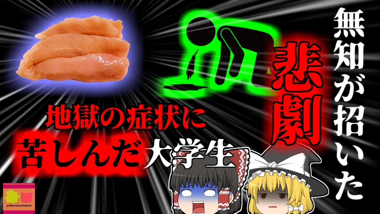 <a href="#" class="seekTime" data-seekTime="00:00" onclick="seekNicoPlayer('#00:00'); return false;">#00:00</a> 冒頭挨拶<br><a href="#" class="seekTime" data-seekTime="00:44" onclick="seekNicoPlayer('#00:44'); return false;">#00:44</a> 視聴上の注意<br><a href="#" class="seekTime" data-seekTime="1:24" onclick="seekNicoPlayer('#1:24'); return false;">#1:24</a> 本編開始<br><a href="#" class="seekTime" data-seekTime="1:39" onclick="seekNicoPlayer('#1:39'); return false;">#1:39</a> 大学生たちの飲み会<br><a href="#" class="seekTime" data-seekTime="2:42" onclick="seekNicoPlayer('#2:42'); return false;">#2:42</a> 手作りのおつまみ<br><a href="#" class="seekTime" data-seekTime="3:42" onclick="seekNicoPlayer('#3:42'); return false;">#3:42</a> 飲み会は盛り上がり朝まで<br><a href="#" class="seekTime" data-seekTime="4:08" onclick="seekNicoPlayer('#4:08'); return false;">#4:08</a> その後の異変と地獄の症状<br><a href="#" class="seekTime" data-seekTime="5:14" onclick="seekNicoPlayer('#5:14'); return false;">#5:14</a> カンピロバクター<br><a href="#" class="seekTime" data-seekTime="6:17" onclick="seekNicoPlayer('#6:17'); return false;">#6:17</a> 集団食中毒<br><a href="#" class="seekTime" data-seekTime="7:06" onclick="seekNicoPlayer('#7:06'); return false;">#7:06</a> 家庭で作るにはリスクの多い料理だった<br><a href="#" class="seekTime" data-seekTime="7:33" onclick="seekNicoPlayer('#7:33'); return false;">#7:33</a> 鹿児島で鳥刺しが安全に食べられる理由<br><a href="#" class="seekTime" data-seekTime="8:56" onclick="seekNicoPlayer('#8:56'); return false;">#8:56</a> 家庭では難しい<br><a href="#" class="seekTime" data-seekTime="11:43" onclick="seekNicoPlayer('#11:43'); return false;">#11:43</a> 予防方法<br><br><br><br>今回紹介するのは、以前リクエストがありました、鶏肉に関する食中毒事例です。<br>九州地方某都市に暮らす大学生「Aさん」はこの日、自宅に同級生たちを集め、飲み会を開催していました。<br>彼は主催者だったので、自作のつまみなどを用意しており、おおむねその料理は好評でしたが、数日後、突然激しい嘔吐や腹痛、頭痛やめまいといった、恐ろしい症状に見舞われ、路上で身動きが取れなくなってしまいました。<br>救急車を呼び、近くの病院で検査を受けると、彼は「カンピロバクター腸炎」と診断され、処置を受けました。<br>担当した医師は彼から聞き取りを行い、原因の特定に勤めました。<br>実はAさんは、南九州地方出身であり、地元ではよく「鳥刺し<br>」を食べており、その調理方法を知っていたAさんは、スーパーで鶏のササミを購入し、それを調理して飲み会で提供していました。<br><br>しかし、彼が調理していた鶏は、鳥刺し用のものではなく、通常の加熱用。<br>また、その調理方法、環境にも問題があり、カンピロバクターが肉の内部にも入り込み・・・<br><br><br><br><br>引用・出展・参考文献<br>とりさし協会 | 南九州の食文化[鳥刺し・鶏たたき]<br><a href="https://ishort.ink/Pyg1" target="_blank" rel="noopener nofollow">https://ishort.ink/Pyg1</a><br>きくなが養鶏場 | とりさし<br><a href="https://ishort.ink/usmW" target="_blank" rel="noopener nofollow">https://ishort.ink/usmW</a><br>厚生労働省 カンピロバクター食中毒予防について(Q&A)<br><a href="https://ishort.ink/Vw4f" target="_blank" rel="noopener nofollow">https://ishort.ink/Vw4f</a><br>食品安全委員会 食中毒予防のポイント<br><a href="https://ishort.ink/j2Ve" target="_blank" rel="noopener nofollow">https://ishort.ink/j2Ve</a><br>その他視聴者提供資料<br><br />※この動画は過去の事件を知り、現在でも同じことが発生する危険性を再認識、関与しないように促すための動画であり、視聴者を扇動、動揺を誘うためのコンテンツではありません。<br><br>ご要望にお応えして、メンバーシップの開設を行いました。<br>下記URLからも登録可能ですので、ご興味がある方は是非ご参加ください。<br><a href="https://www.youtube.com/channel/UCcT5a1J7XJW7CLYI2RKl4pw/join" target="_blank" rel="noopener nofollow">https://www.youtube.com/channel/UCcT5a1J7XJW7CLYI2RKl4pw/join</a><br><br><br>Twitter<br>→<a href="https://twitter.com/yukkurisurutoko" target="_blank" rel="noopener nofollow">https://twitter.com/yukkurisurutoko</a><br><br>取り急ぎ、簡易的にですがマイリストを作りました。<br>【ゆっくり解説】事故・事件関係紹介リスト <br><a href="https://www.nicovideo.jp/mylist/71034319" target="_blank" rel="noopener nofollow">https://www.nicovideo.jp/mylist/71034319</a><br>【ゆっくり解説】放射線系事故<br><a href="https://www.nicovideo.jp/mylist/71034368" target="_blank" rel="noopener nofollow">https://www.nicovideo.jp/mylist/71034368</a><br>【ゆっくり解説】鉄道系事故・事件関連<br><a href="https://www.nicovideo.jp/mylist/71034379" target="_blank" rel="noopener nofollow">https://www.nicovideo.jp/mylist/71034379</a>