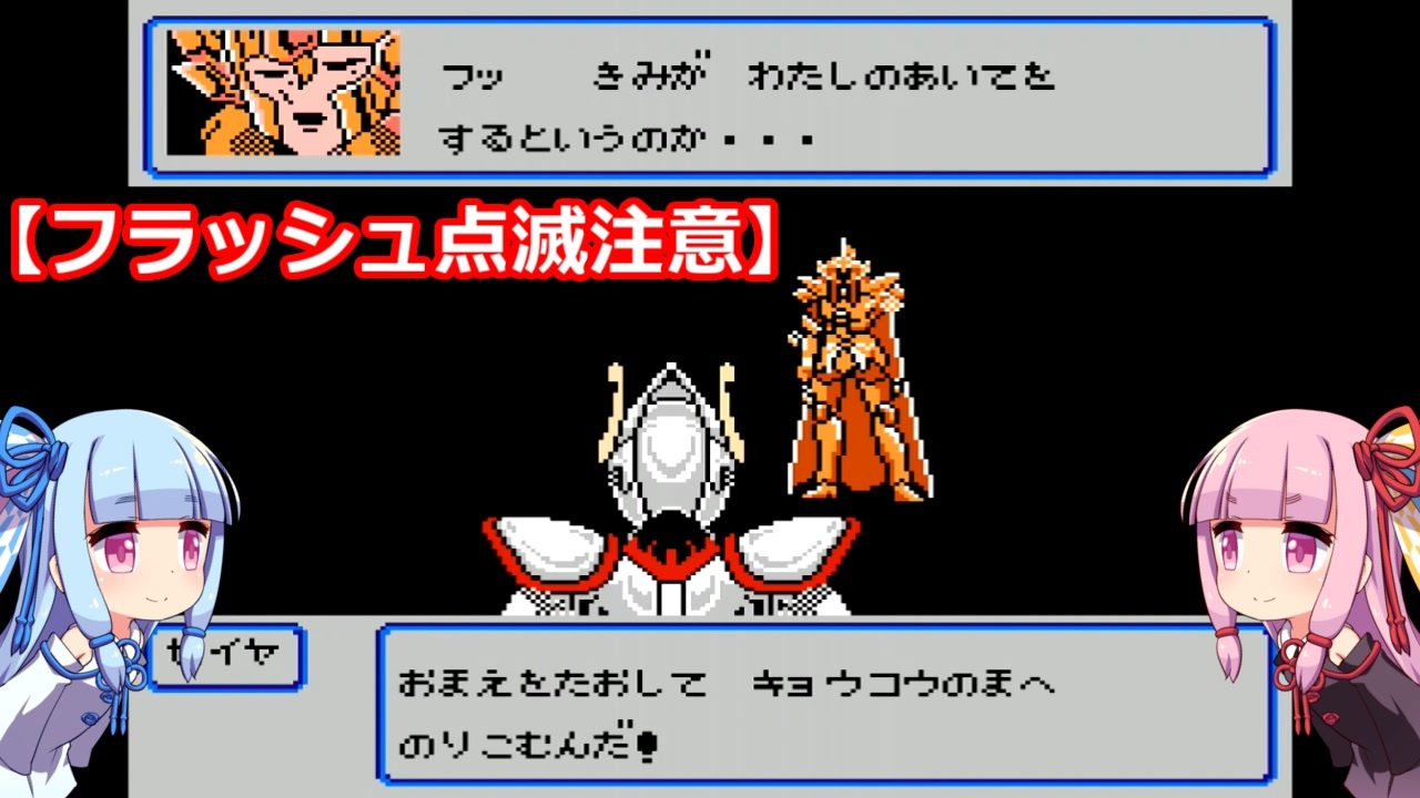 フラッシュが点滅するシーンがありますので、ご視聴の際はご注意願います。<br><br>FCソフト、聖闘士星矢黄金伝説完結編をプレイしました。<br>双魚宮編です。<br>こういう if ストーリーはオラ、ワクワクすっぞ。<br>今回、試験的にアイコンアニメーションを導入してみました。<br><br>お借りした素材<br>blueberry様 <a href="https://seiga.nicovideo.jp/seiga/im6561508" target="_blank" rel="noopener">im6561508</a> <br>デムサト 様 <a href="https://seiga.nicovideo.jp/seiga/im10778297" target="_blank" rel="noopener">im10778297</a><br><br>琴葉姉妹Part1マイリスト⇒<a href="https://www.nicovideo.jp/mylist/74721174" target="_blank" rel="noopener">mylist/74721174</a><br>前作の黄金伝説 ⇒<a href="https://www.nicovideo.jp/watch/sm41667752" class="watch">sm41667752</a><br>完結編 ♯1白羊宮 ⇒<a href="https://www.nicovideo.jp/watch/sm42105873" class="watch">sm42105873</a><br><br><a target="_blank" href="https://qa.nicovideo.jp/faq/show/19424?site_domain=default" style="font-size: 13px;color: #657586; text-decoration: underline; line-height: 1.4">この動画は投稿者によって修正されました</a>