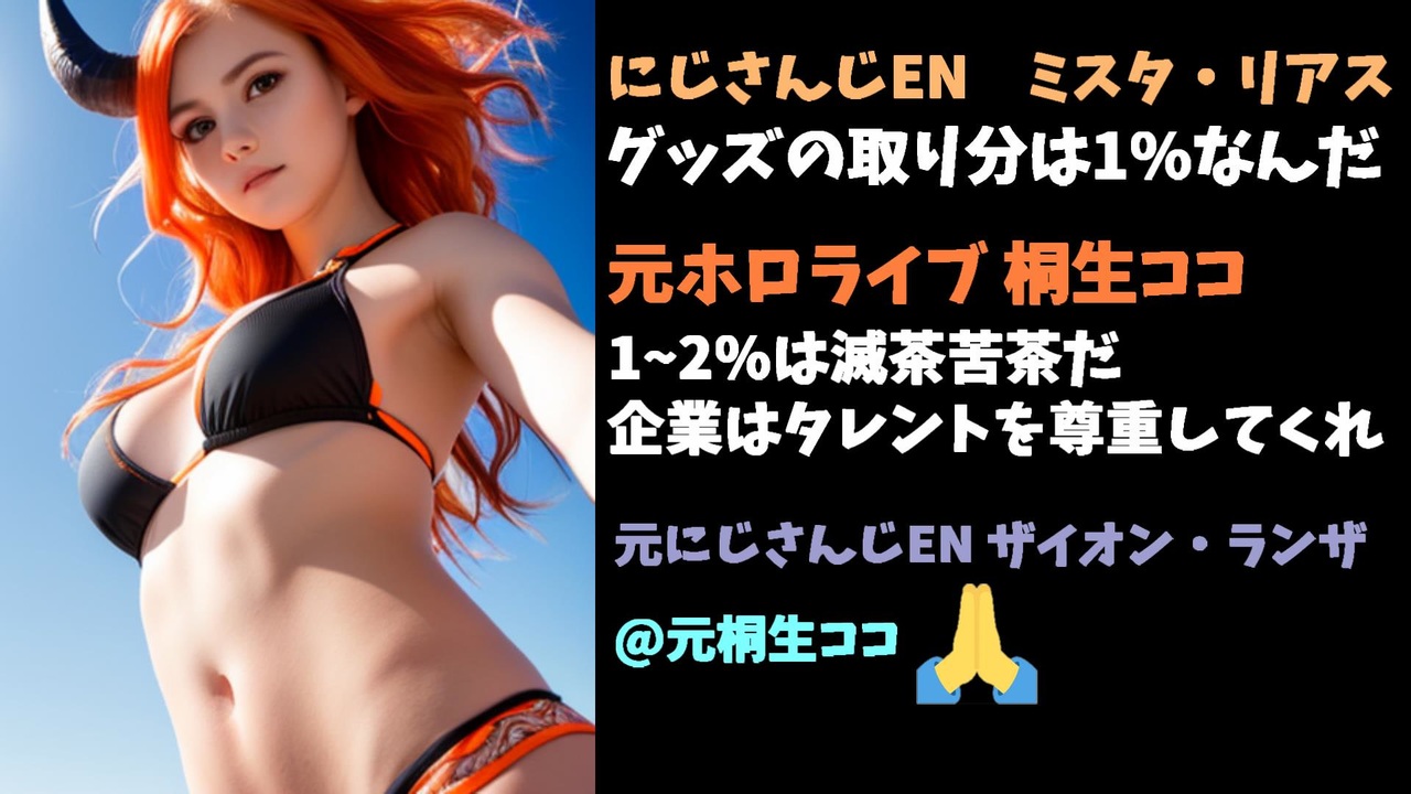 2023年5月9日、海外VTuberのFalseEyeD氏がにじさんじのグッズ取り分は2%だとリーク。2022年12月ににじさんじEN所属のミスタ・リアスさんがグッズの取り分は1%と発言していたのも掘り起こされ再度話題になりました。<br>翌日の5月10日、全く無関係かもしれませんが元ホロライブの元桐生ココさんが1%~2%に苦言を呈するようなツイートをし、元にじさんじENのザイオンさんが元桐生ココさんのそのツイートに対し手を合わせる絵文字をリプライされました。<br><br><br>引用<br>VTuber Agency Gives This Much To Talents For Merch? LazuLight Merch Leaked, Sayu Okami Returns<br><a href="https://youtu.be/IyynD83X-uI" target="_blank" rel="noopener nofollow">https://youtu.be/IyynD83X-uI</a><br><br><a href="https://twitter.com/ksononair/status/1656226203576188931" target="_blank" rel="noopener nofollow">https://twitter.com/ksononair/status/1656226203576188931</a><br><br>Youtube <a href="https://www.youtube.com/@V_Virgin_Mary" target="_blank" rel="noopener nofollow">https://www.youtube.com/@V_Virgin_Mary</a><br>twitter <a href="https://twitter.com/V_Virgin_Mary" target="_blank" rel="noopener nofollow">https://twitter.com/V_Virgin_Mary</a><br><br>使用素材<br>高品質なフリー動画素材 - Pixabay <a href="https://pixabay.com/ja/videos" target="_blank" rel="noopener nofollow">https://pixabay.com/ja/videos</a>