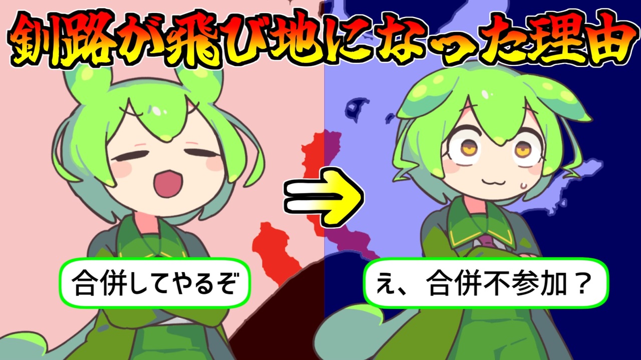 道東の都市・釧路市は飛び地になっており、20㎞近くの間隔があいています。<br><br>なぜこれほど巨大な飛び地になっているのか?<br><br>誇張たっぷりに解説します。<br><br>●前回:なぜか同じ名前の違う街が隣り合っている地・釧路<br><a href="https://www.nicovideo.jp/watch/sm42189774" target="_blank" rel="noopener nofollow">https://www.nicovideo.jp/watch/sm42189774</a><br><br><br>●YouTube<br><a href="https://youtu.be/_z-gyNbI-SU" target="_blank" rel="noopener nofollow">https://youtu.be/_z-gyNbI-SU</a><br><br><br>●参考資料<br><a href="https://detail.chiebukuro.yahoo.co.jp/qa/question_detail/q14140370749" target="_blank" rel="noopener nofollow">https://detail.chiebukuro.yahoo.co.jp/qa/question_detail/q14140370749</a><br><a href="https://detail.chiebukuro.yahoo.co.jp/qa/question_detail/q13220100258" target="_blank" rel="noopener nofollow">https://detail.chiebukuro.yahoo.co.jp/qa/question_detail/q13220100258</a><br><a href="https://www.pointia5.com/entry/2022/01/28/123507" target="_blank" rel="noopener nofollow">https://www.pointia5.com/entry/2022/01/28/123507</a><br><a href="https://hokkaidofan.com/city_kushiro/" target="_blank" rel="noopener nofollow">https://hokkaidofan.com/city_kushiro/</a><br><a href="https://detail.chiebukuro.yahoo.co.jp/qa/question_detail/q13169793033" target="_blank" rel="noopener nofollow">https://detail.chiebukuro.yahoo.co.jp/qa/question_detail/q13169793033</a><br><a href="http://www.jiti.co.jp/gyousen/298-/No-316-1.htm" target="_blank" rel="noopener nofollow">http://www.jiti.co.jp/gyousen/298-/No-316-1.htm</a><br><br>●音声ソフト<br>VOICEVOX:ずんだもん<br>VOICEVOX:四国めたん<br>VOICEVOX:春日部つむぎ<br>VOICEVOX:剣崎雌雄<br><br>●立ち絵:坂本アヒル様<br /><span style="color: #ff0000; font-size: 24px;"><strong>釧路を紹介するブログ始めました</strong></span>:<a href="https://946de2100.com" target="_blank" rel="noopener nofollow">https://946de2100.com</a><br><br><span style="color: #ff0000; font-size: 16px;"><strong>●おススメ動画:</strong></span><span style="color: #ff0000; font-size: 18px;"><strong>【歴史解説】かつて 釧路を支配していたのは佐賀だった ~釧路元町の始まりと佐野孫右衛門の盛衰~</strong></span><br><br><a href="https://www.nicovideo.jp/watch/sm44267722" class="watch">sm44267722</a><br><br><br><span style="color: #ff0000; font-size: 18px;"><strong>●YouTubeチャンネルも登録よろしくお願いします</strong></span><br><strong>釧路チャンネル <a href="https://www.youtube.com/@znd-kaisetu" target="_blank" rel="noopener nofollow">https://www.youtube.com/@znd-kaisetu</a></strong><br>恋結シラリカソロチャンネル <a href="https://www.youtube.com/@enmusubi-shirarika" target="_blank" rel="noopener nofollow">https://www.youtube.com/@enmusubi-shirarika</a><br><br><br>ほしいものリスト <a href="https://www.amazon.jp/hz/wishlist/ls/2OUUB1JQSRUWG?ref_=wl_share" target="_blank" rel="noopener nofollow">https://www.amazon.jp/hz/wishlist/ls/2OUUB1JQSRUWG?ref_=wl_share</a><br>クリエイターサポート<a href="https://creator-support.nicovideo.jp/registration/116665199" target="_blank" rel="noopener nofollow">https://creator-support.nicovideo.jp/registration/116665199</a>