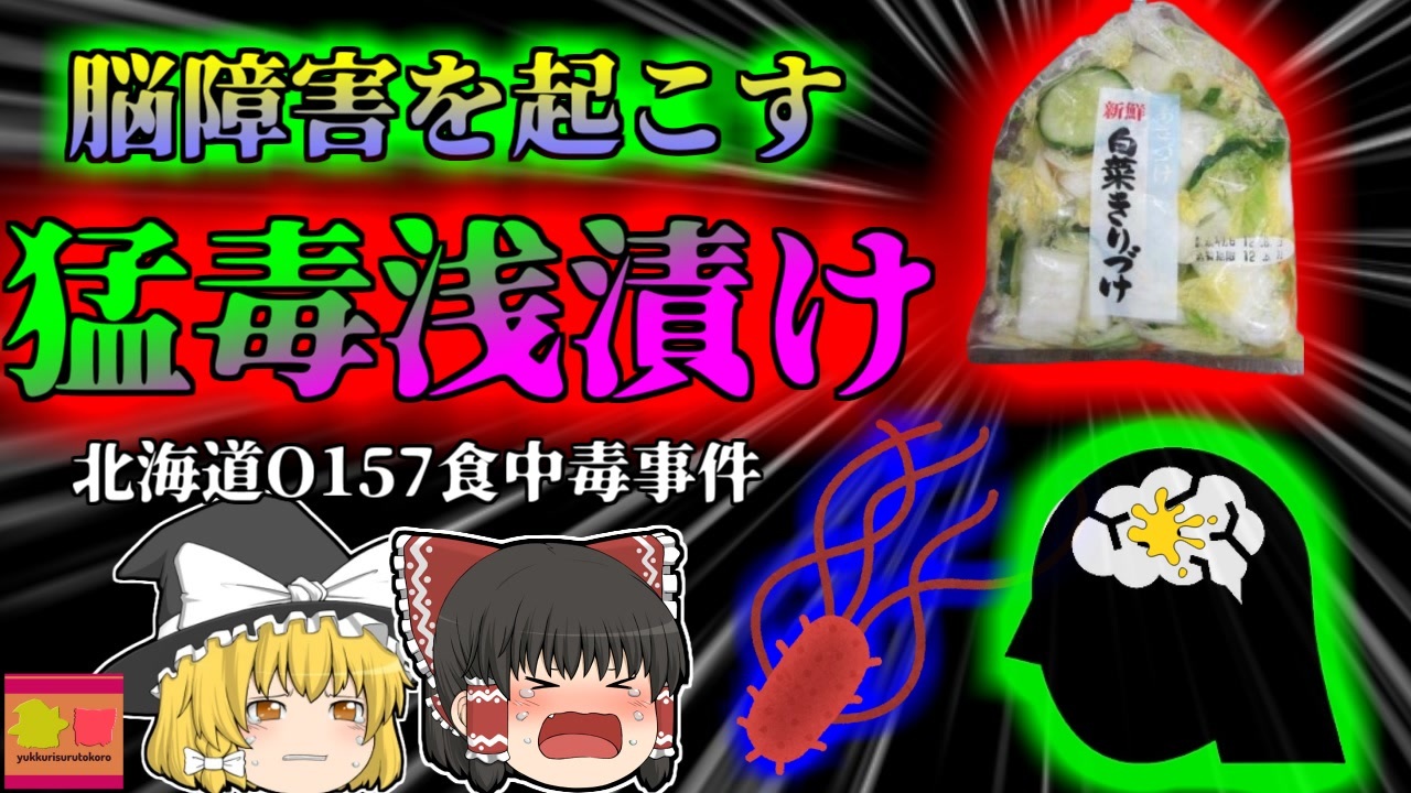 <a href="#" class="seekTime" data-seekTime="00:00" onclick="seekNicoPlayer('#00:00'); return false;">#00:00</a> 冒頭挨拶<br><a href="#" class="seekTime" data-seekTime="00:32" onclick="seekNicoPlayer('#00:32'); return false;">#00:32</a> 視聴上の注意<br><a href="#" class="seekTime" data-seekTime="1:11" onclick="seekNicoPlayer('#1:11'); return false;">#1:11</a> 本編開始<br><a href="#" class="seekTime" data-seekTime="1:53" onclick="seekNicoPlayer('#1:53'); return false;">#1:53</a> 高齢者施設で集団食中毒<br><a href="#" class="seekTime" data-seekTime="2:24" onclick="seekNicoPlayer('#2:24'); return false;">#2:24</a> 原因は給食?<br><a href="#" class="seekTime" data-seekTime="3:20" onclick="seekNicoPlayer('#3:20'); return false;">#3:20</a> 「腸管出血性大腸菌O157」<br><a href="#" class="seekTime" data-seekTime="3:56" onclick="seekNicoPlayer('#3:56'); return false;">#3:56</a> 凄まじい感染力と地獄の症状<br><a href="#" class="seekTime" data-seekTime="4:23" onclick="seekNicoPlayer('#4:23'); return false;">#4:23</a> 特定が難しい<br><a href="#" class="seekTime" data-seekTime="5:33" onclick="seekNicoPlayer('#5:33'); return false;">#5:33</a> 共通の食材「白菜の浅漬け」<br><a href="#" class="seekTime" data-seekTime="7:37" onclick="seekNicoPlayer('#7:37'); return false;">#7:37</a> 杜撰な管理体制・衛生管理<br><a href="#" class="seekTime" data-seekTime="11:05" onclick="seekNicoPlayer('#11:05'); return false;">#11:05</a> 一般家庭や宿泊施設にも拡大<br><a href="#" class="seekTime" data-seekTime="12:03" onclick="seekNicoPlayer('#12:03'); return false;">#12:03</a> 行政の対応・衛生規範改正へ<br><a href="#" class="seekTime" data-seekTime="14:19" onclick="seekNicoPlayer('#14:19'); return false;">#14:19</a> 家庭でできる予防方法<br><br><br><br><br>#食中毒 #O157 #漬物<br>今回紹介するのは、リクエストを頂いた、北海道での食中毒事例です。<br>2012年夏。札幌市内の高齢者施設で、腹痛・嘔吐・下血などの症状を呈した入所者が、近くの病院を受診していました。その患者数は7名。担当した医師は、施設で集団食中毒が発生していると判断し、直ちに市保健局に通報を行いました。<br>それとほぼ同時期に、苫小牧でも同様の事態が発生しており、患者たちからは、「腸管出血性大腸菌O157」が検出され、施設で提供されていた給食などが原因食材として疑われました。<br>しかし、このO157は潜伏期間が非常に長く、発症してから原因の特定が非常に難しく、原因食材の特定は困難を極めました。<br>保健局は、各施設で提供された給食メニュー、約2週間分ほどをくまなく調べ、共通する食材を発見。<br>それは、「白菜切り漬け」という、外部から購入していた商品でした。<br>保健局は、早速この白菜漬け、そして製造工場の立ち入り検査を行い、原因究明に努めした。<br><br>すると、この企業のとんでもない杜撰な製造過程、衛生管理が明らかとなしました。<br><br>引用・出展・参考文献<br>厚生労働省「腸管出血性大腸菌O157」<br><a href="https://ishort.ink/CFDE" target="_blank" rel="noopener nofollow">https://ishort.ink/CFDE</a><br>NIID 国立感染症研究所<br>白菜浅漬けによる腸管出血性大腸菌O157食中毒について<br><a href="https://ishort.ink/o69r" target="_blank" rel="noopener nofollow">https://ishort.ink/o69r</a><br>全日本漬物協同組合連合会「つけ会」<br>HACCAOの考え方に基づく安全・安心なものづくり<br><a href="https://ishort.ink/GCkx" target="_blank" rel="noopener nofollow">https://ishort.ink/GCkx</a><br>MSDマニュアル 家庭版 溶結性尿毒症症候群(HUS)<br> <a href="https://ishort.ink/91nZ" target="_blank" rel="noopener nofollow">https://ishort.ink/91nZ</a><br>家庭用製品情報 SARAYA<br>腸管出血性大腸菌O157の特徴<br><a href="https://ishort.ink/XGbj" target="_blank" rel="noopener nofollow">https://ishort.ink/XGbj</a><br>その他視聴者提供資料など<br><br><br />※この動画は過去の事件を知り、現在でも同じことが発生する危険性を再認識、関与しないように促すための動画であり、視聴者を扇動、動揺を誘うためのコンテンツではありません。<br><br>ご要望にお応えして、メンバーシップの開設を行いました。<br>下記URLからも登録可能ですので、ご興味がある方は是非ご参加ください。<br><a href="https://www.youtube.com/channel/UCcT5a1J7XJW7CLYI2RKl4pw/join" target="_blank" rel="noopener nofollow">https://www.youtube.com/channel/UCcT5a1J7XJW7CLYI2RKl4pw/join</a><br><br><br>Twitter<br>→<a href="https://twitter.com/yukkurisurutoko" target="_blank" rel="noopener nofollow">https://twitter.com/yukkurisurutoko</a><br><br>取り急ぎ、簡易的にですがマイリストを作りました。<br>【ゆっくり解説】事故・事件関係紹介リスト <br><a href="https://www.nicovideo.jp/mylist/71034319" target="_blank" rel="noopener nofollow">https://www.nicovideo.jp/mylist/71034319</a><br>【ゆっくり解説】放射線系事故<br><a href="https://www.nicovideo.jp/mylist/71034368" target="_blank" rel="noopener nofollow">https://www.nicovideo.jp/mylist/71034368</a><br>【ゆっくり解説】鉄道系事故・事件関連<br><a href="https://www.nicovideo.jp/mylist/71034379" target="_blank" rel="noopener nofollow">https://www.nicovideo.jp/mylist/71034379</a>