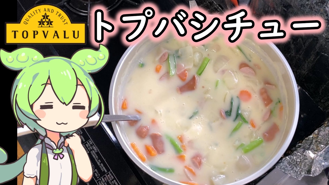 牛乳が余っているのでトプバ勢品を多めにしたクリームシチューを作りました。<br><br>【参考】<br>北海道産生クリームのクリームシチュー<br><a href="https://www.topvalu.net/items/detail/4902121094011/" target="_blank" rel="noopener nofollow">https://www.topvalu.net/items/detail/4902121094011/</a><br>ウインナーチキン&ポーク<br><a href="https://www.topvalu.net/items/detail/4549741453349/" target="_blank" rel="noopener nofollow">https://www.topvalu.net/items/detail/4549741453349/</a><br>BESTPRICE ステンレス三徳包丁<br><a href="https://www.topvalu.net/items/detail/4549741274050/" target="_blank" rel="noopener nofollow">https://www.topvalu.net/items/detail/4549741274050/</a><br>BESTPRICE 抗菌まな板M<br><a href="https://www.topvalu.net/items/detail/4549741274043/" target="_blank" rel="noopener nofollow">https://www.topvalu.net/items/detail/4549741274043/</a><br>グリコ×きん肉マンおいしさ実感キャンペーン<br><a href="https://cp.glico.com/foods-2023ss/" target="_blank" rel="noopener nofollow">https://cp.glico.com/foods-2023ss/</a><br>闘将!!拉麺男 (たたかえラーメンマン)(東映アニメーション)<br><a href="https://lineup.toei-anim.co.jp/ja/tv/rahmen_man/episode/" target="_blank" rel="noopener nofollow">https://lineup.toei-anim.co.jp/ja/tv/rahmen_man/episode/</a><br><br>【使用した素材】(※敬称略)<br>(合成音声)VOICEVOX/ずんだもん/四国めたん<br><a href="https://voicevox.hiroshiba.jp/" target="_blank" rel="noopener nofollow">https://voicevox.hiroshiba.jp/</a><br>(立ち絵)坂本アヒル<br><a href="https://seiga.nicovideo.jp/seiga/im10788496" target="_blank" rel="noopener">im10788496</a>/<a href="https://seiga.nicovideo.jp/seiga/im10791276" target="_blank" rel="noopener">im10791276</a><br>(楽曲)甘茶の音楽工房/「楽しい麦畑」「フルーツパフェ」「お城の舞踏会」<br><a href="https://amachamusic.chagasi.com" target="_blank" rel="noopener nofollow">https://amachamusic.chagasi.com</a>