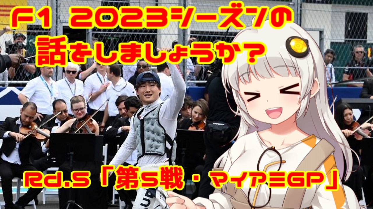 「ジャパニーズ・F1スーパースター、ユウキ・ツノーダー!!」by紲星あかり<br><br><br>おはこんばんちは、紲星あかりです。<br>この動画は、F1 2023年シーズンをダイジェストでお送りしています。<br>今回は第5戦・マイアミGPをお送りします。<br>開幕から4連勝とここまで圧倒的な強さを見せているレッドブル。しかし、2人のポイント差は「6」と<br>チーム内でのチャンピオン争いは激しくなっています。共に2勝ずつで迎えた今回のレースで先行するのはフェルスタッペンか?ペレスか?<br><br><br><br><br><br><span style="color: red;">(ご注意)この動画の情報は真実とは限りません。また、誤字・脱字が含まれる場合があります。ご了承ください。</span><br><br>前→第4戦・アゼルバイジャンGP <a href="https://www.nicovideo.jp/watch/sm42171375" class="watch">sm42171375</a><br>次→第6戦・エミリア・ロマーニャGP <a href="https://www.nicovideo.jp/watch/sm42234544" class="watch">sm42234544</a> <br><br><br>F12023シーズンの話をしましょうか?マイリスト→<a href="https://www.nicovideo.jp/mylist/74761174" target="_blank" rel="noopener">mylist/74761174</a><br> <br><br>うp主のF1動画シリーズ<br><br>F12022シーズンの話をしましょうか?マイリスト→<a href="https://www.nicovideo.jp/mylist/72892585" target="_blank" rel="noopener">mylist/72892585</a><br>F12021シーズンの話をしましょうか?マイリスト→<a href="https://www.nicovideo.jp/mylist/70735663" target="_blank" rel="noopener">mylist/70735663</a><br>F12020シーズンの話をしましょうか?マイリスト→<a href="https://www.nicovideo.jp/mylist/67651731" target="_blank" rel="noopener">mylist/67651731</a> <br>F12019シーズンの話をしましょうか?<span style="color: #000000; font-size: 14px;">マイリスト</span><span style="color: #000000; font-size: 13px;">→</span><a href="https://www.nicovideo.jp/mylist/64678414" target="_blank" rel="noopener">mylist/64678414</a><br>F12018シーズンの話をしましょうか?<span style="color: #000000; font-size: 14px;">マイリスト</span><span style="color: #000000; font-size: 13px;">→</span><a href="https://www.nicovideo.jp/mylist/61514606" target="_blank" rel="noopener">mylist/61514606</a><br>F1の話をしましょうか?マイリスト→<a href="https://www.nicovideo.jp/mylist/40499353" target="_blank" rel="noopener">mylist/40499353</a><br>F1の話をしましょうか?OPフルバージョン→<a href="https://www.nicovideo.jp/mylist/59030210" target="_blank" rel="noopener">mylist/59030210</a><br>F1 CM集→<a href="https://www.nicovideo.jp/mylist/57297507" target="_blank" rel="noopener">mylist/57297507</a><br><br>