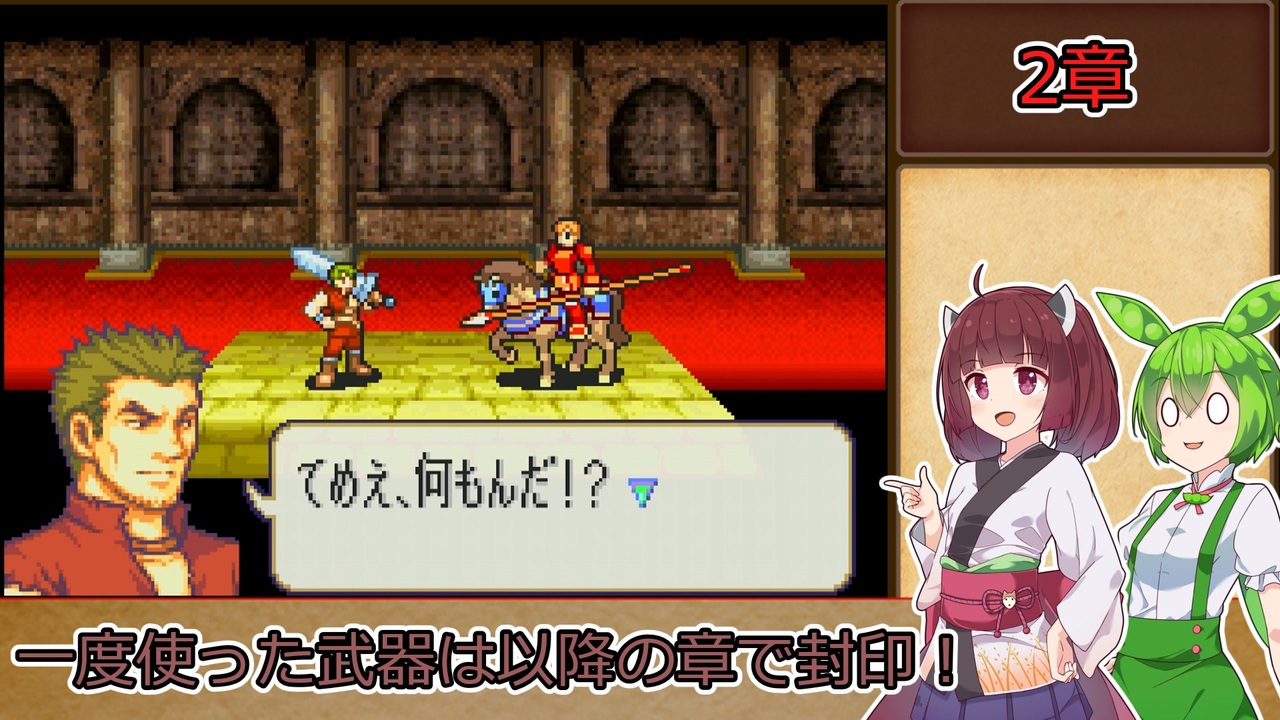 <span style="color: #85200c; font-size: 24px;"><strong><i>【マーニ・カティ】は間違いなく名剣と呼べる性能なのに対を成すもう片方ときたら…</i></strong></span><br><br><strong>ルール1:一度使用した武器種は、以降の章で使用する事を禁止する。<br>ルール2:武器の使用の定義は『その武器を装備した状態で敵との戦闘が発生したタイミング』『その武器を売却して換金した場合』杖の場合は『対象に対して使用した時点(命中の可否は問わない)』とする。</strong><br><span style="color: #ff0000;"><strong>※同盟軍、演出による戦闘イベントでは使用した判定にはならないこととする。</strong></span><br><strong>ルール3:難易度はリン編ハード→ヘクトル編ハードとする。<br>ルール4:序章から終章まで外伝、異伝を含む全ての章を攻略し、仲間に出来るユニットは全員加入させ、生存させる。(序章と1章のみ同一の章として扱う)</strong><br><span style="color: #ff0000; font-size: 18px;"><strong>※バグ技禁止</strong></span><br><br>本動画のシリーズリスト【<a href="https://www.nicovideo.jp/series/406473" target="_blank" rel="noopener">series/406473</a>】<br>前作の同縛りプレイ【<a href="https://www.nicovideo.jp/series/316824" target="_blank" rel="noopener">series/316824</a>】<br>前:【<a href="https://www.nicovideo.jp/watch/sm42193458" class="watch">sm42193458</a>】次:【<a href="https://www.nicovideo.jp/watch/sm42248464" class="watch">sm42248464</a>】<br><br><strong>使用したソフト</strong><br>VOICEROID+東北きりたんEX<br>VOICEPEAK ずんだもん<br><strong>お借りした素材</strong><br>ニコニコモンズの皆様(コンテンツツリー参照)